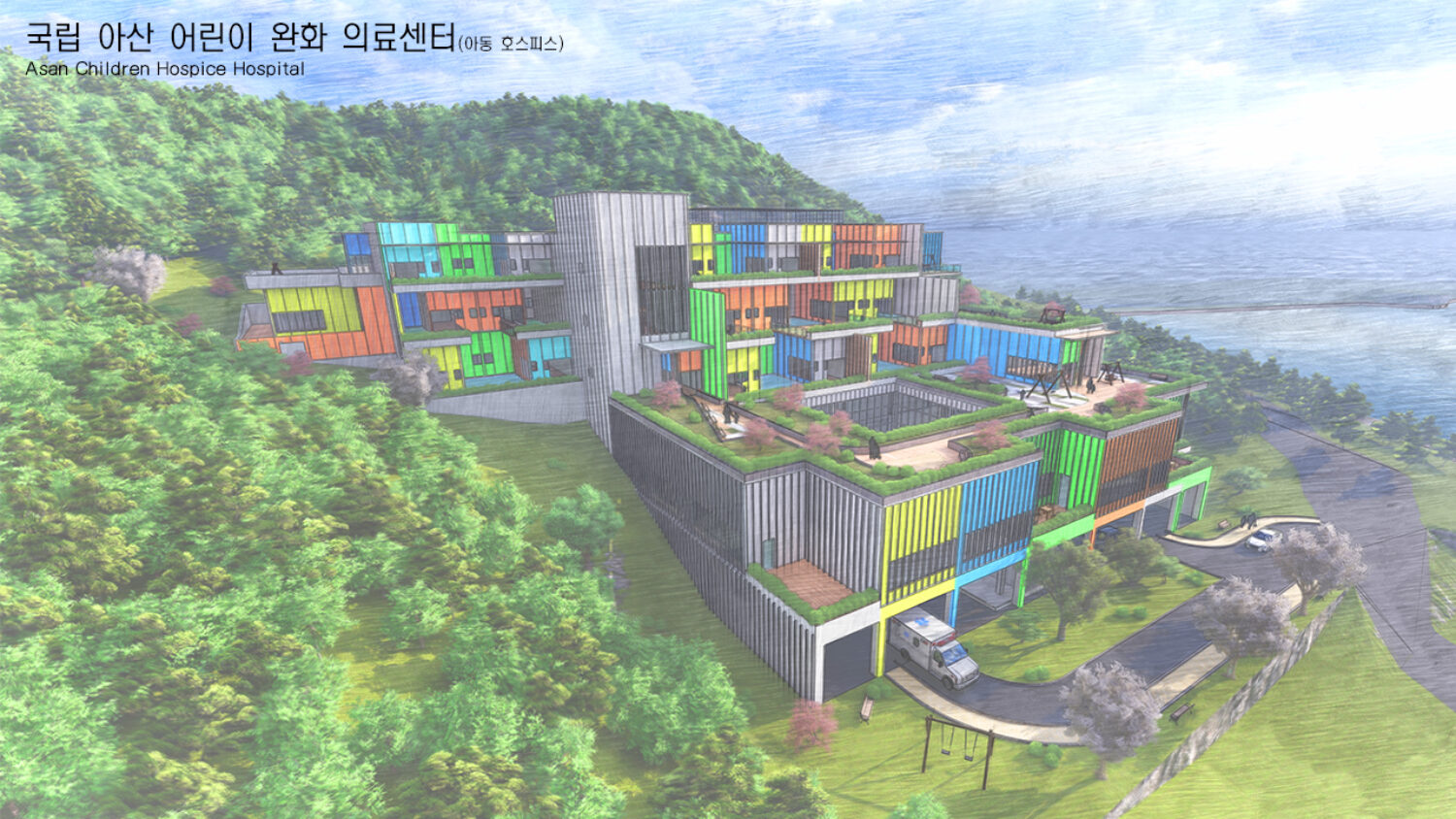 현재에 암환자들의 증가 추세에 따라 완화의료시설이 증가하고 있고 동시에 아동 암환자도 증가하고 있으나 국내에서는 아동완화의료시설이 아직 시범사업단계에 머물러있다. 아동호스피스은 4개의 상급의료시설에서 시설형 형태로 시범 운영 중. 독립형 시설은 존재하지 않아 독립형 시설에 대한 방향을 제시고자 한다. 수도권과 가깝고 자연경관이 좋고 교통이 편리한 아산시 신정호 근방의 대지를 선정. 경사지를 활용하여 절토를 최소화해 배치.