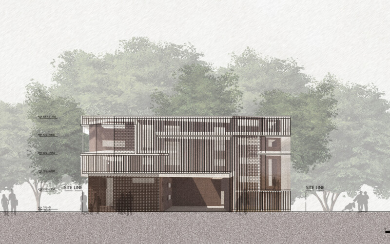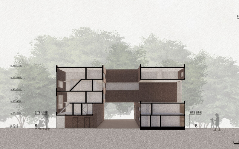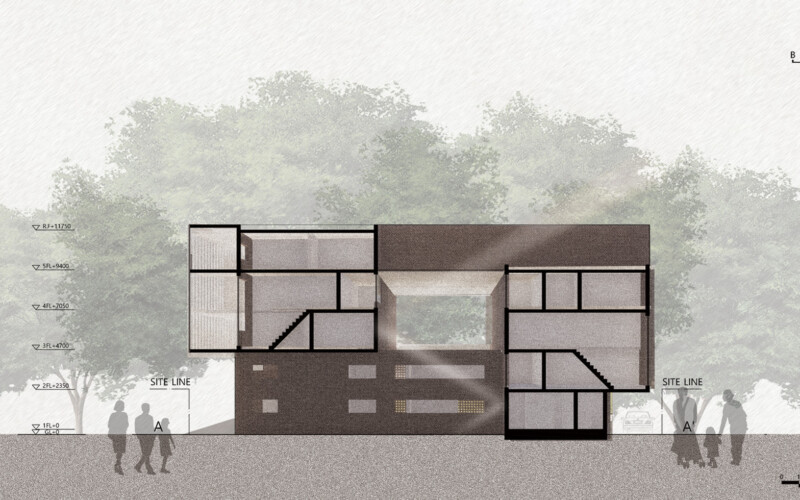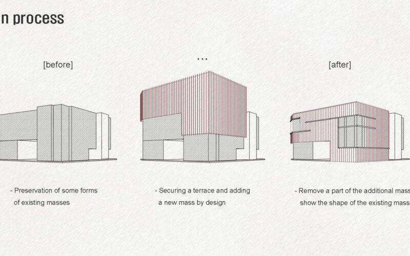 기존의 건축물이 주는 지역의 고유한 기억은 무시할 수 없고 이를 무시한다면 지역이 가지는 특색은 사라지게 될 것이다. 건축물의 형태를 유지하면서 새로운 매스가 루버를 사용해 감싸는 형식을 선택하였고 이후 더 적극적이게 일부분 찢어 새로운 매스 안으로 기존 매스가 보이도록 하였다.