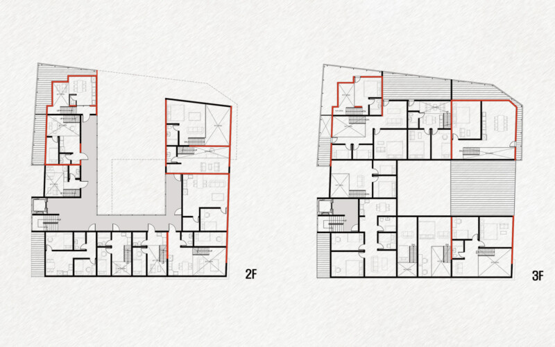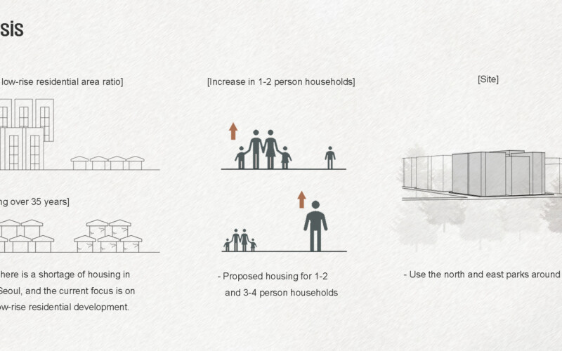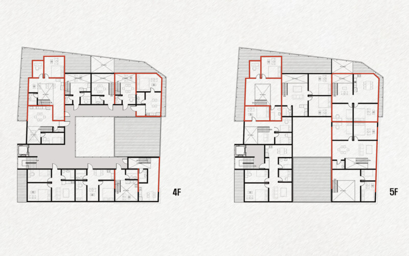 1,2인 가구와 3,4인 가구가 공존할 수 있도록 하였고 최대한 주변공원에 접하도록 하였다. 이를 풀어낸 방법으로는 복층공간이다. 복층공간은 현재 노후된 주택주거에서 접할 수 없는 형태로 레노베이션을 통해서 새롭게 얻어지는 공간이다. 2,4층의 복도를 통해 각 세대의 주출입이 일어나고 3,5층은 복도를 최소화하여 복층을 이용해 진입이 가능하도록 하였다. 그 외에 일부분 단층주거 형태도 몇몇 존재하여 총 유닛은 복층과 단층으로 볼 수 있다.