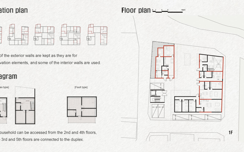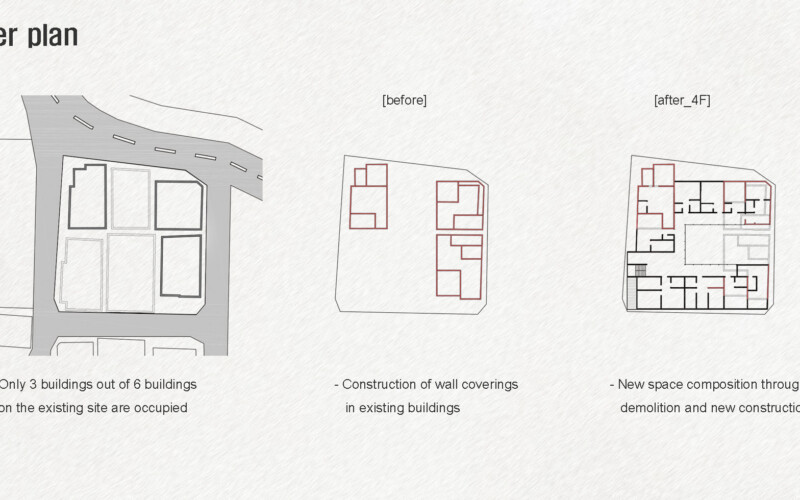 대상지는 동측과 북측에 공원이 맞닿아 있다는 점과 저층 고밀화된 주택가에 위치한다는 특징이 있다. 최종계획안으로는 6개의 기존 건축물 중에서 기존도시조직과의 연계, 주변 자연환경과의 순응, 지역 커뮤니티의 활성화 등 다양한 사회적-문화적 문제를 해결하는 주거의 새로운 프로토타입을 제시하고자 3개의 건축물을 가지고 레노베이션을 진행하였다.