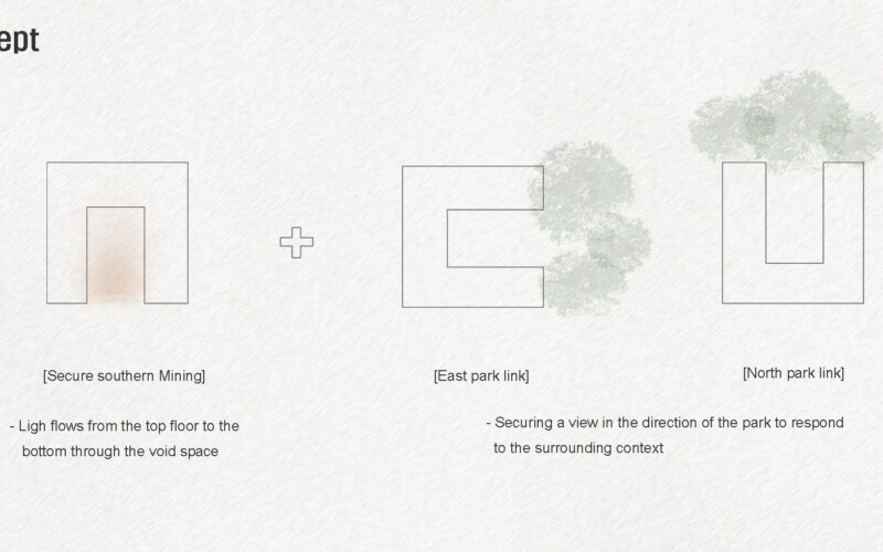 문제를 풀어나가는 방법으로는 ㄷ 형태의 매스가 여러 방향으로 앉히는 모습을 선택하였다. 1,2층은 북측 공원을 3,4층은 동측 공원을 향해서 열어주고 가장 상층부의 5층은 보이드 공간을 통해 1층까지 빛을 끌고 오기 위해 남향을 비워주어 주변 자연환경에 대응하고 채광을 확보하였다.