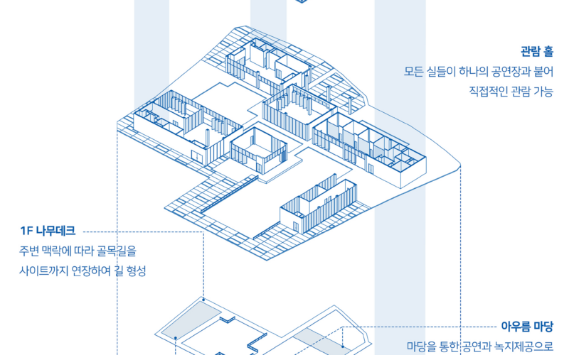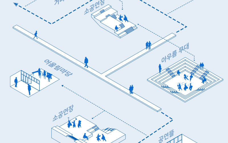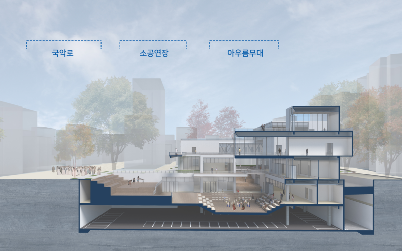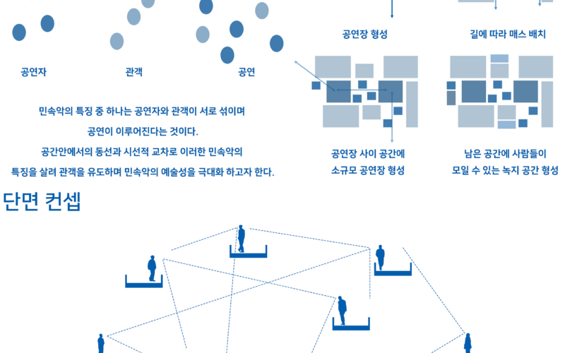 민속악은 공연자와 관객이 서로 소통하며 함께 만들어가는 독특한 예술 형태이다. 이러한 특성을 반영하여, 공연자와 관객 간의 시선과 동선이 자연스럽게 연결될 수 있는 공간을 설계하고자 하였다. 특히, 유동인구가 많은 한옥마을과 행사 때마다 인구 변동이 심한 국악로를 잇는 가교 역할을 할 민속악 전문 국악당을 제안한다. 이로 인해 국악로에서 민속악의 생동감이 더욱 강조되고 관객과의 상호작용이 극대화할 수 있는 환경이 조성될 것이라 예상한다.