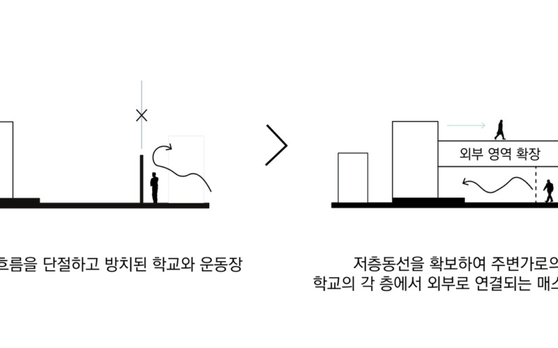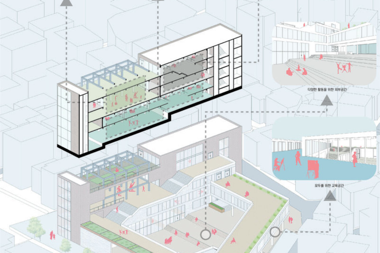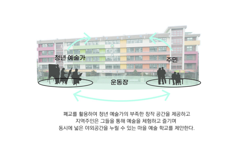 점점 심화하고 있는 저출산 문제, 학령인구 감소로 인해 주택 한복판에 폐교가 되어버린 초등학교, 주택으로 빽빽한 마을 속에 커다란 빈 곳으로 고립되어 있다. 40년 반세기의 역사를 지녔지만, 이제는 사용되지 않고 방치된 학교를 청년 예술가와 주민들이 함께하는 새로운 문화 교육의 장소로 제안하고자 한다.