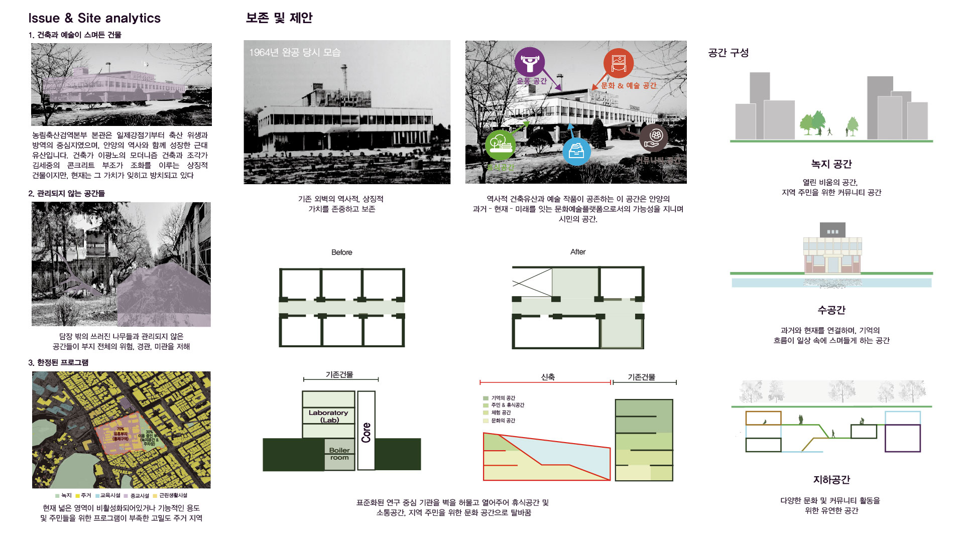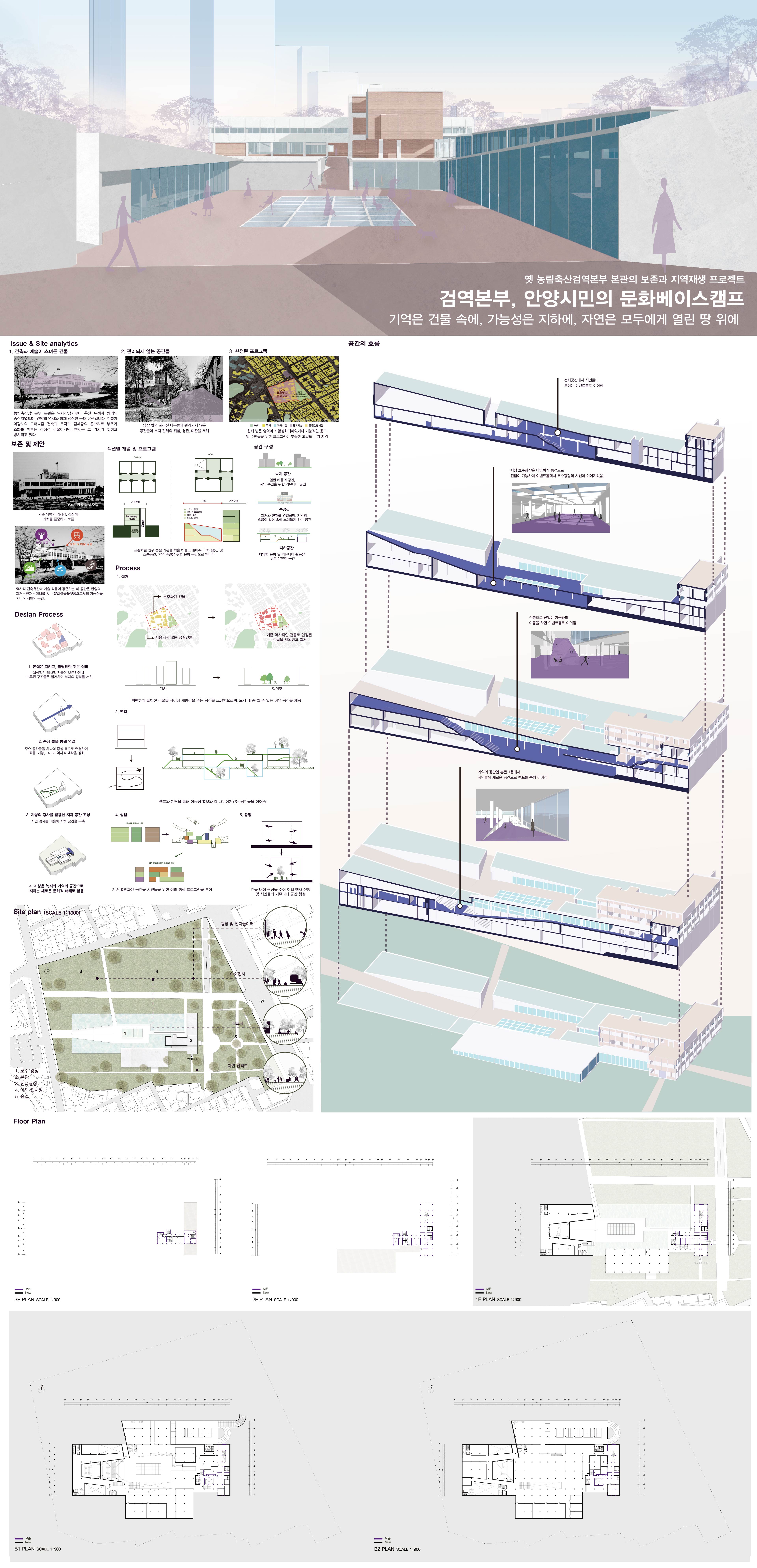 이 프로젝트는 안양에 위치한 옛 농림축산검역본부 본관을 보존하면서, 주변 공간을 철거 및 재구성하여 시민을 위한 문화·자연 기반의 열린 공간으로 재생하는 안양 지역재생 프로젝트이다.