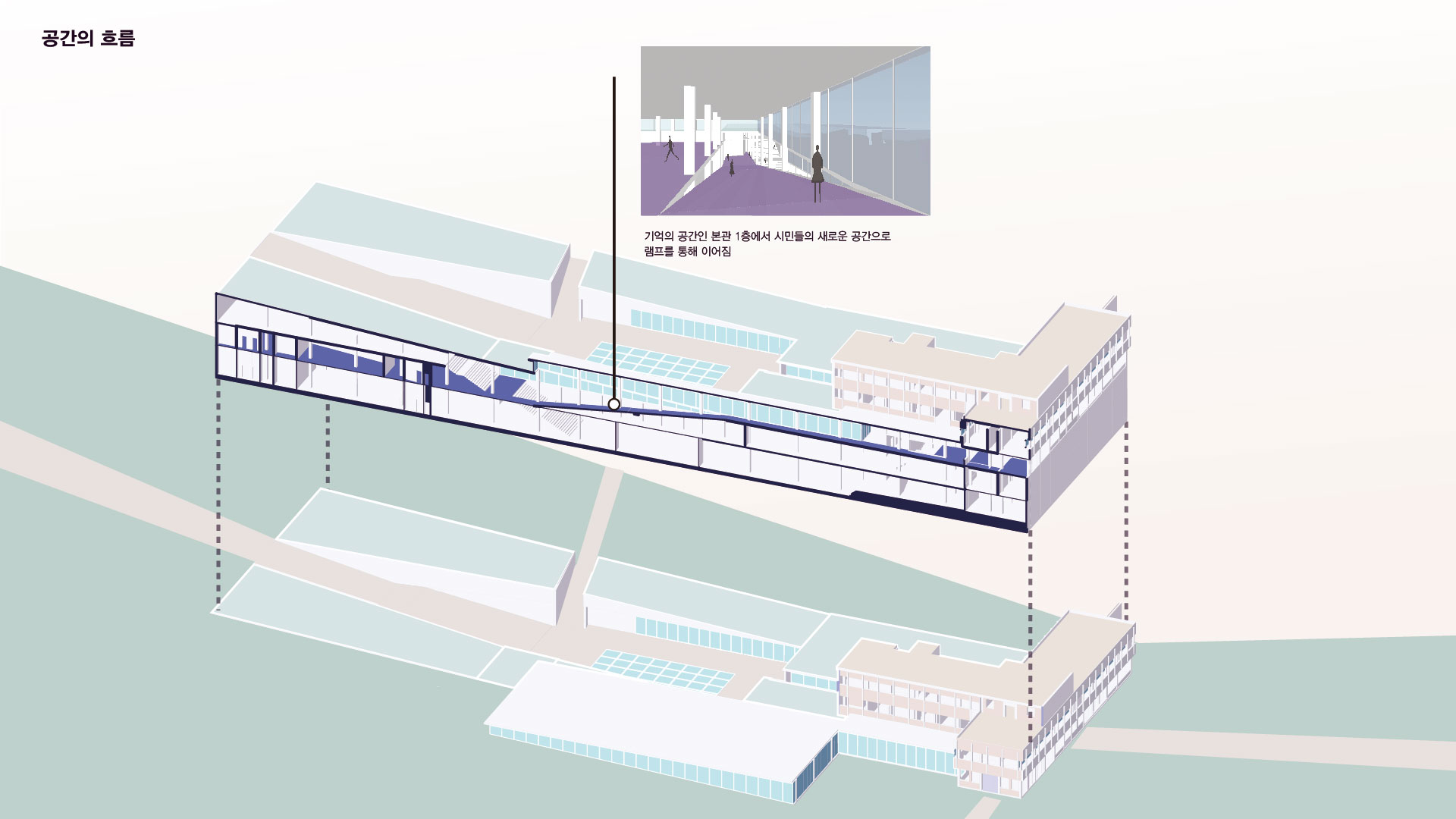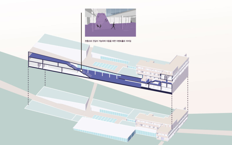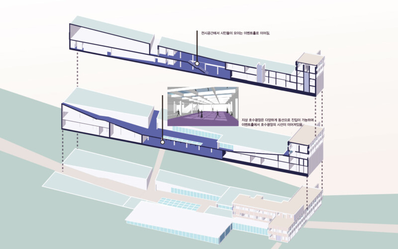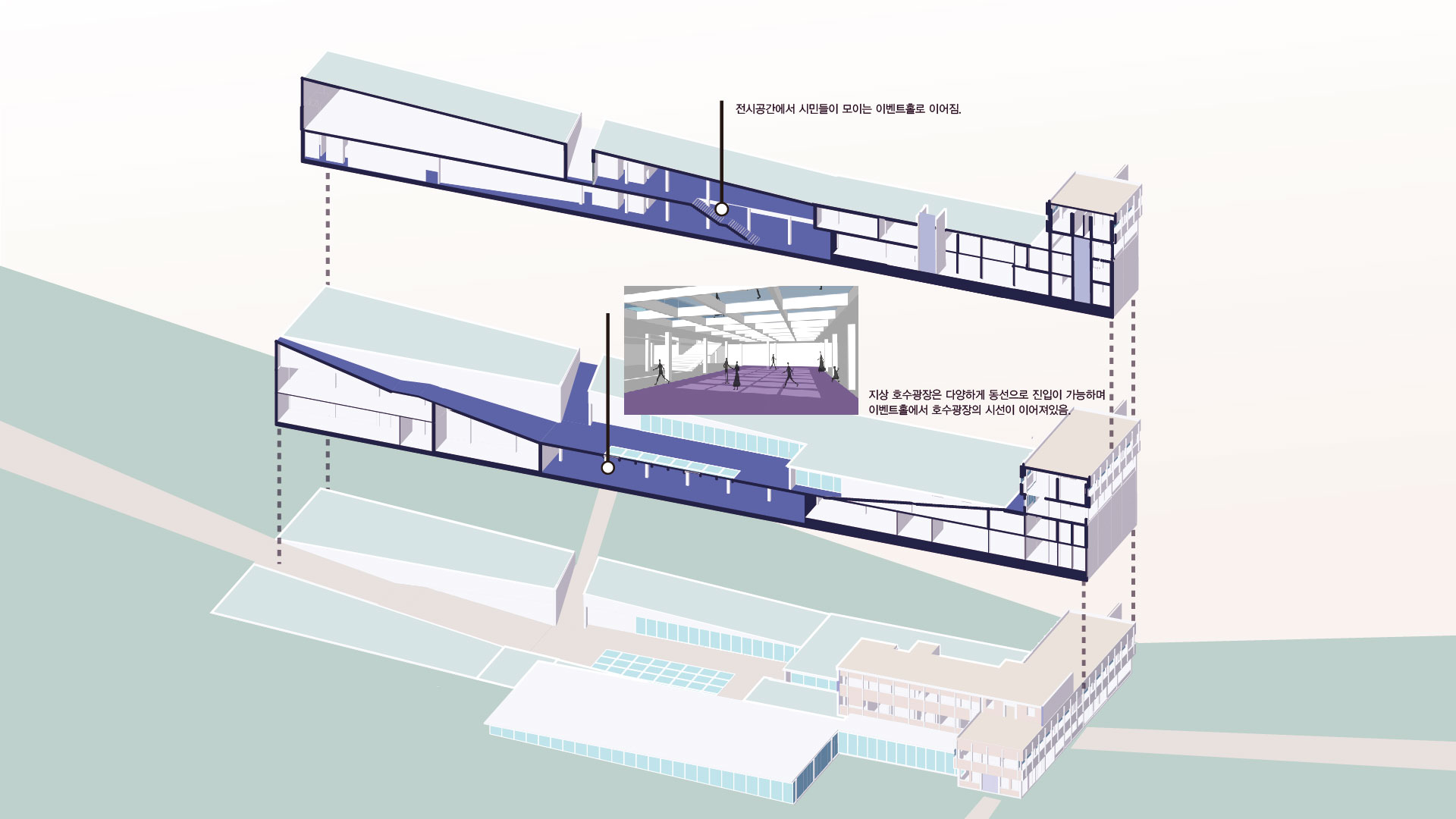 지상 광장과 램프로 연결되는 지하 공간은 공연장, 교육실, 다목적 문화실 등 프로그램적 다양성을 담는다. 단면 다이어그램에서 보듯, 지상과 지하가 시각적·동선적으로 자연스럽게 이어지도록 설계하였다.