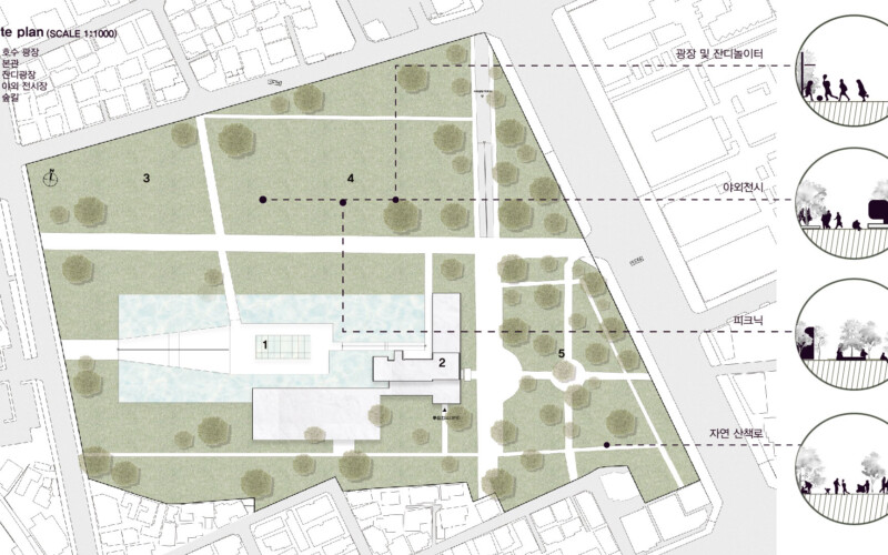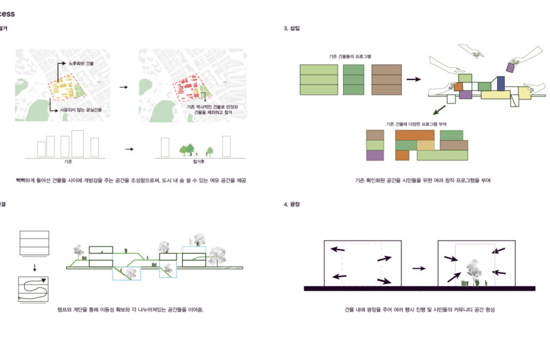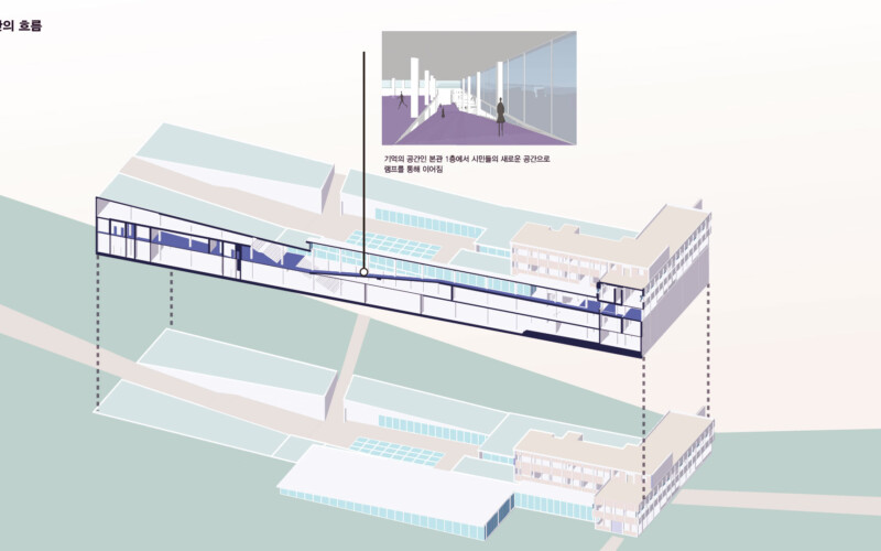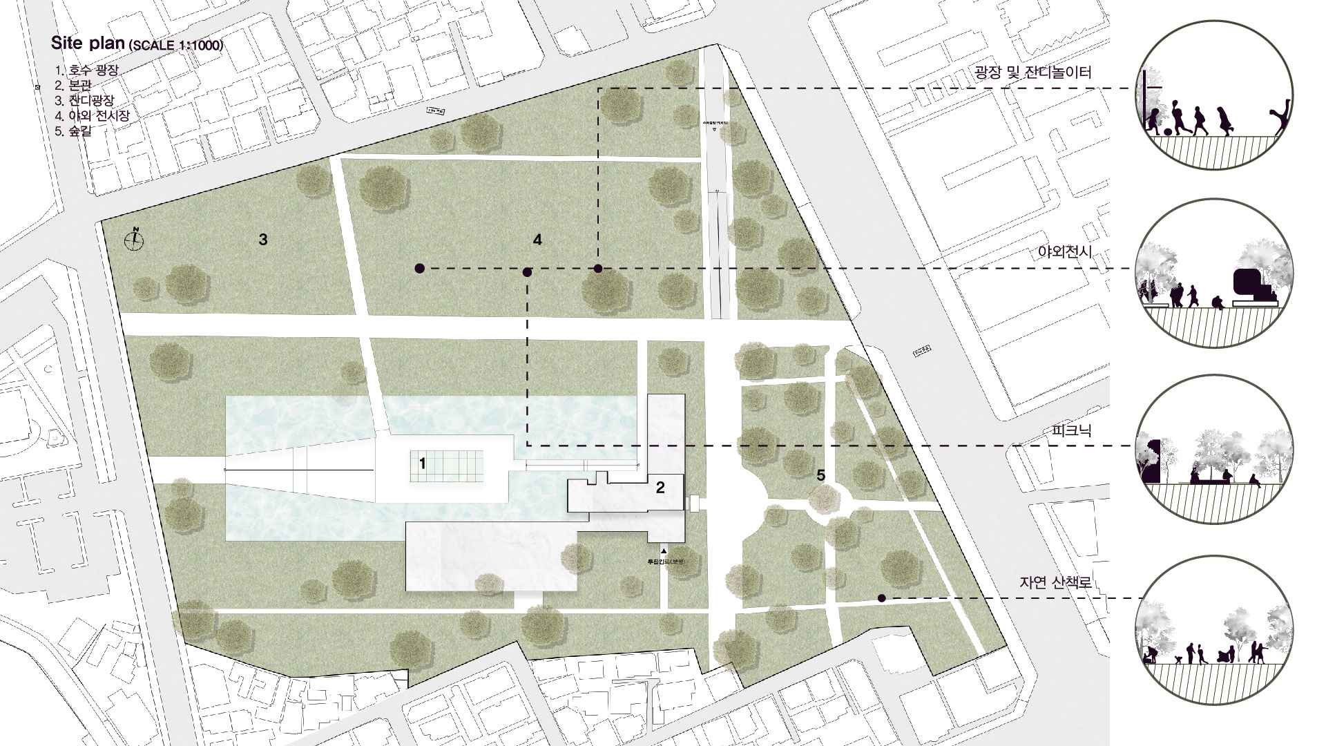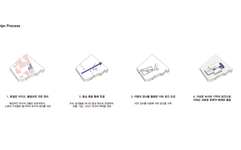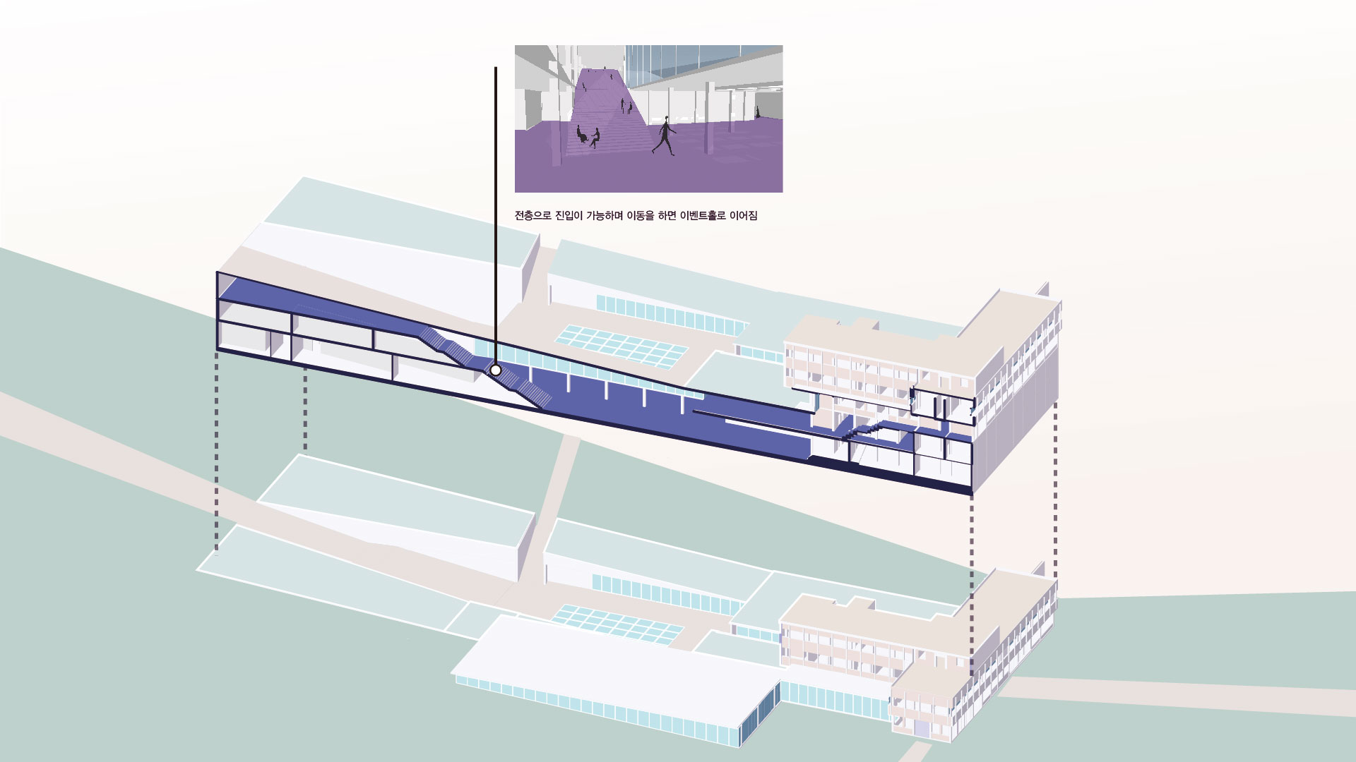 지상 광장과 램프로 연결되는 지하 공간은 공연장, 교육실, 다목적 문화실 등 프로그램적 다양성을 담는다. 단면 다이어그램에서 보듯, 지상과 지하가 시각적·동선적으로 자연스럽게 이어지도록 설계하였다.