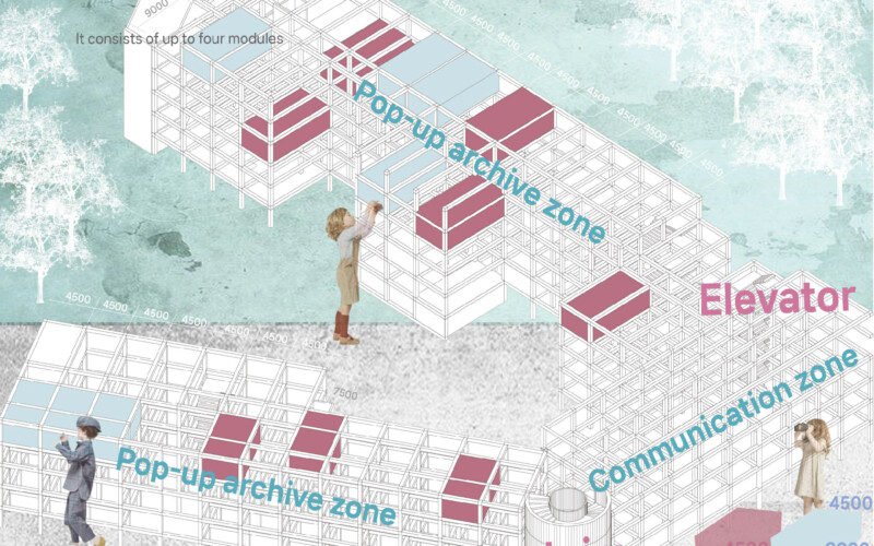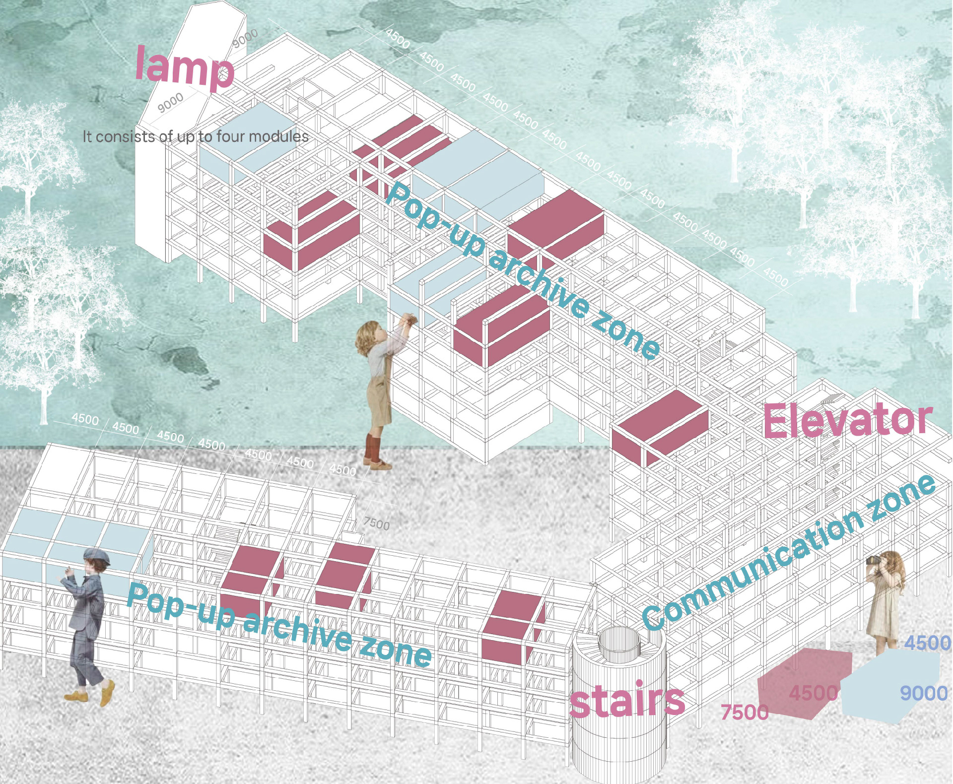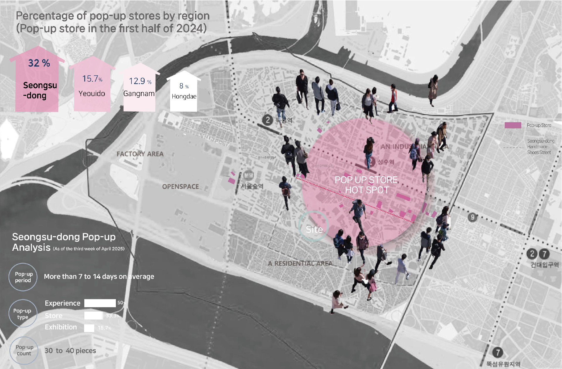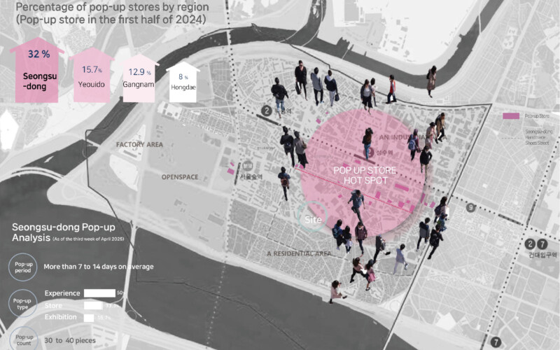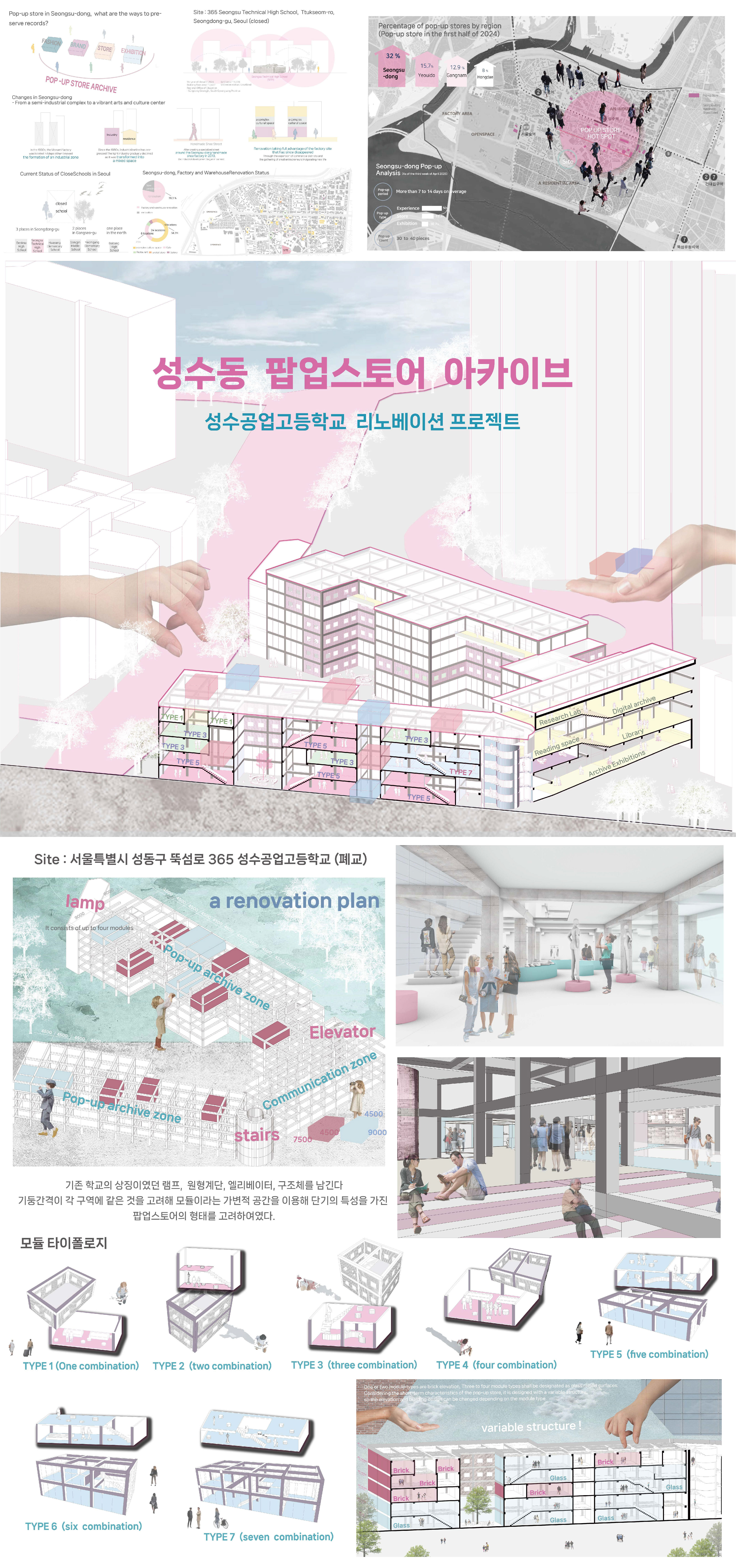 성수동의 정체성이 된 팝업스토어가 기록될 수 있는 공간의 필요성에 대해 중요함을 느끼고 주제를 정하게 되었다. 성수동 연무장길 인근에 위치한, 폐교로 방치되어있는 성수공업고등학교를 사이트로 정했다. 팝업스토어의 매주 생기고 사라지는 임시매장 형태의 가변형구조를 이용하여 컨셉을 정했다. 모든 팝업스토어가 가변형 형태가 아닌, 고정형과 가변형이 섞인 디자인이다. 리노베이션 방향은 성수공업고등학교의 구조체, 램프, 계단, 엘리베이터는 남기고 구조체의 모듈을 이용해 팝업스토어의 타입을 정리하였다. 이 타이폴로지의 모듈은 최대 4개로 조합, 모듈과 모듈 사이는 한칸씩 빈공간을 두었다. 이 비어잔 공간에 가변형 디자인의 팝업스토어의 모듈이 들어올 수 있다. 메인공간인 윗쪽과 아랫쪽은 팝업스토어 아카이브 공간, 오른쪽은 커뮤니케이션 공간으로 공간시퀀스는 1층에서 램프를 타고 벽에 설치된 전시를 구경하며 3층부터 열람식계단공간을 통헤 흐름을 따라 커뮤니케이션 할수 있는 공간을 디자인했다.