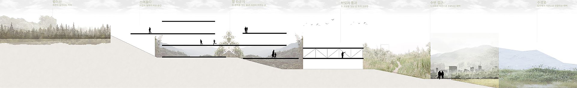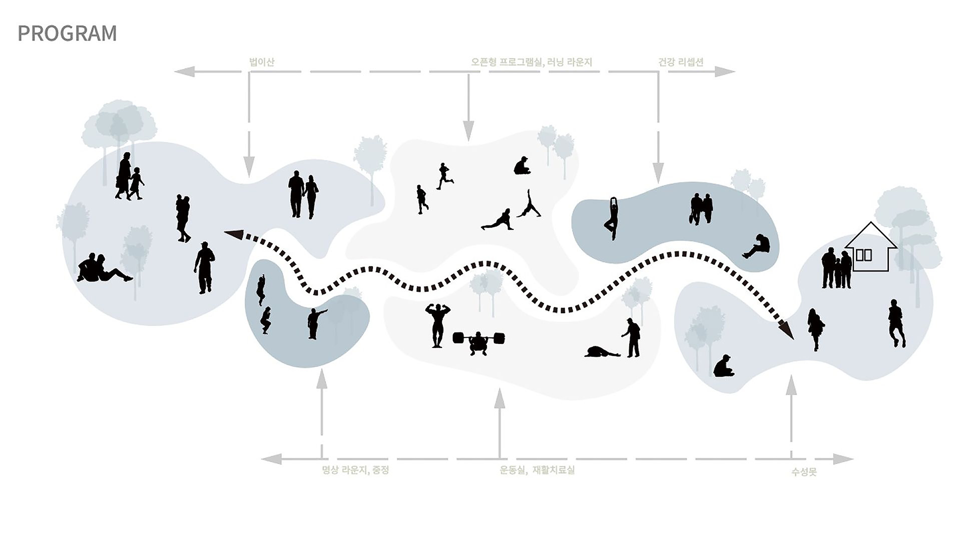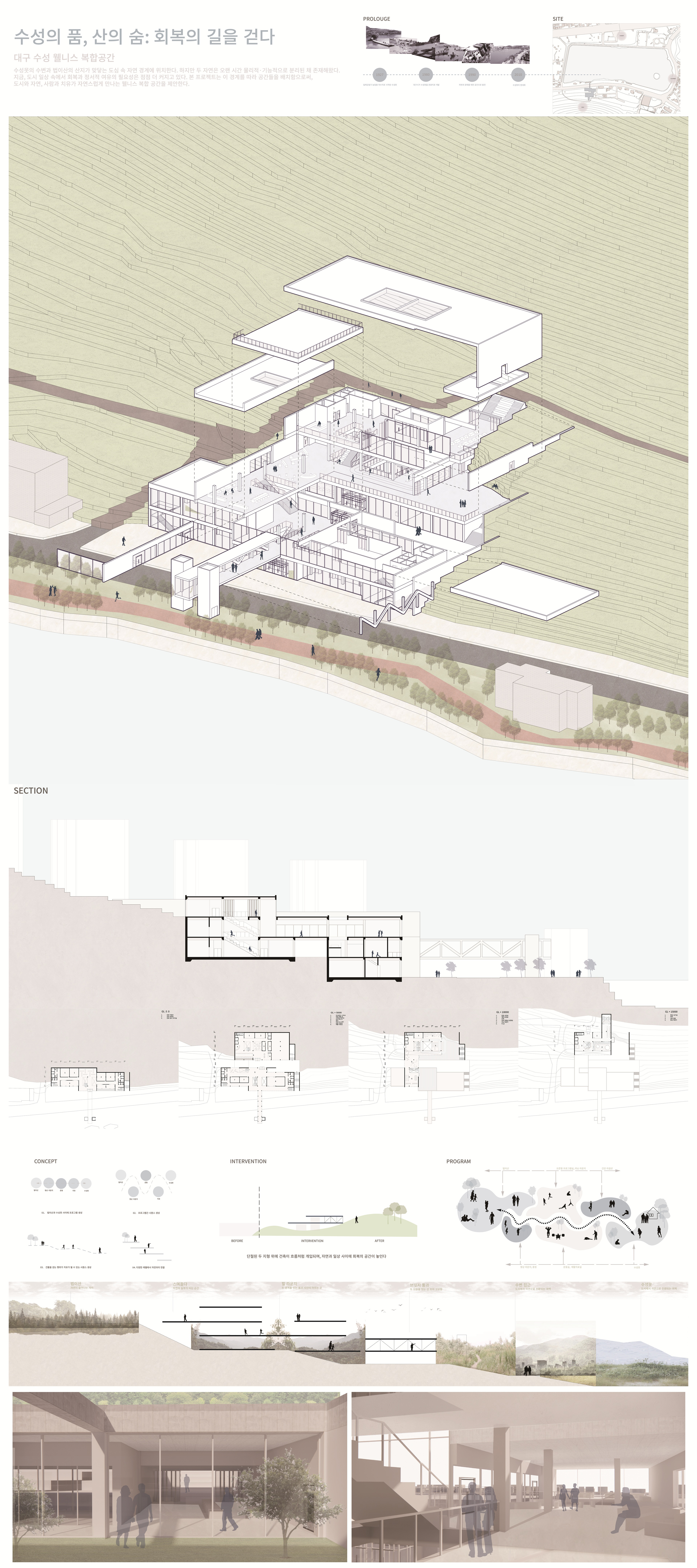 수성 웰니스 재활 복합 센터는 자연과 인간의 회복적 연결을 주제로, 대구 수성못과 법이산 사이에 위치한 프로젝트입니다. 대지는 한쪽으로는 평탄한 수변공원, 다른 한쪽으로는 경사진 산지가 공존하는 지형으로, 오랫동안 두 자연 사이에는 명확한 연결 없이 단절된 상태였습니다. 본 프로젝트는 단순한 치료 시설을 넘어, 자연을 회복의 일부로 끌어들이는 건축적 연결 장치를 제안합니다. 전체적인 매스는 법이산의 지형 흐름을 따라 분산형으로 배치되었으며, 산책로와 공원으로부터 수성못까지 자연스럽게 이어지는 치유의 시퀀스를 형성합니다. 건축을 따라 걷는 행위 자체가 재활 프로그램이자 회복의 과정이 되도록 계획했으며, 매스를 잇는 브릿지는 단순한 이동 통로가 아니라 다양한 고도와 풍경을 경험하게 하는 수평적 이동 장치로 작동합니다. 이를 통해 사용자는 부담 없이 물리적·심리적 치유를 함께 경험할 수 있습니다. 프로그램은 명상실, 오픈 프로그램 존, 운동 치료실, 재활 치료실, 내부 정원과 외부 데크 등으로 구성되며, 각 공간은 외부 자연과 시각적으로 연결되어 있습니다. 이로써 치유가 단절되지 않고, 연속적인 회복의 흐름속에 배치되도록 하였습니다. 결국 이 프로젝트는 법이산 산책로에서 시작된 치유의 여정이 수성못 수변으로 확장되는 과정을 담으며, 자연과 인간이 함께 회복하는 새로운 경계를 제시합니다.