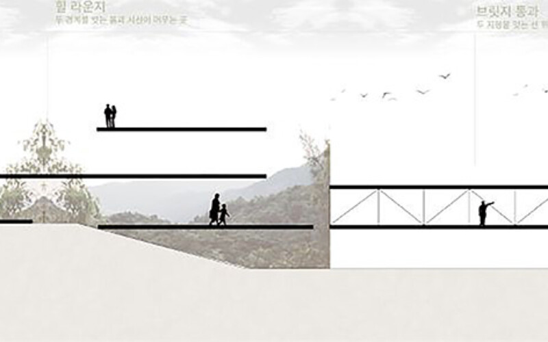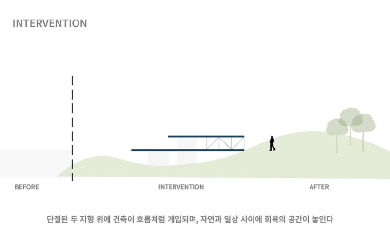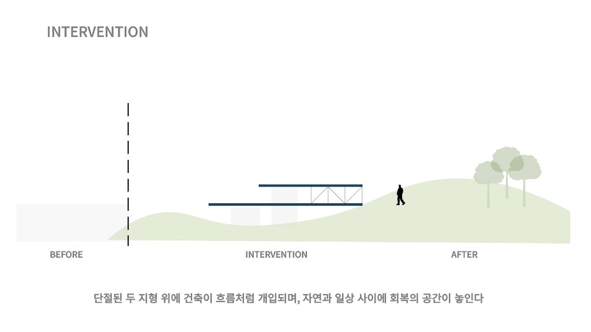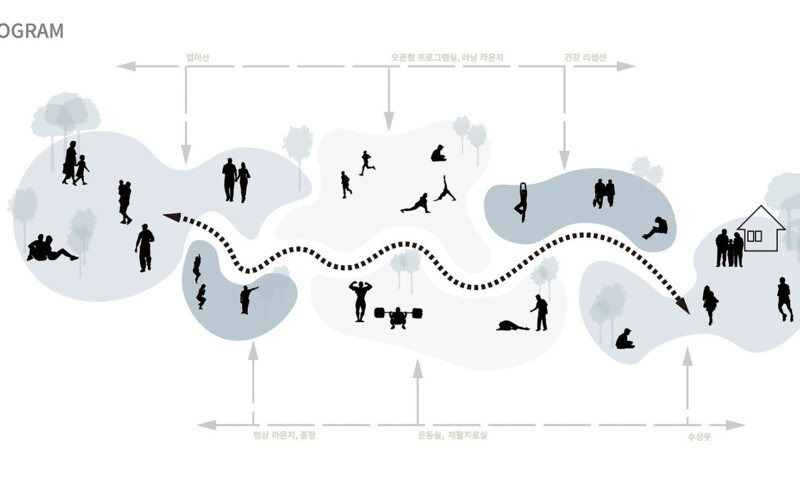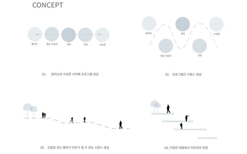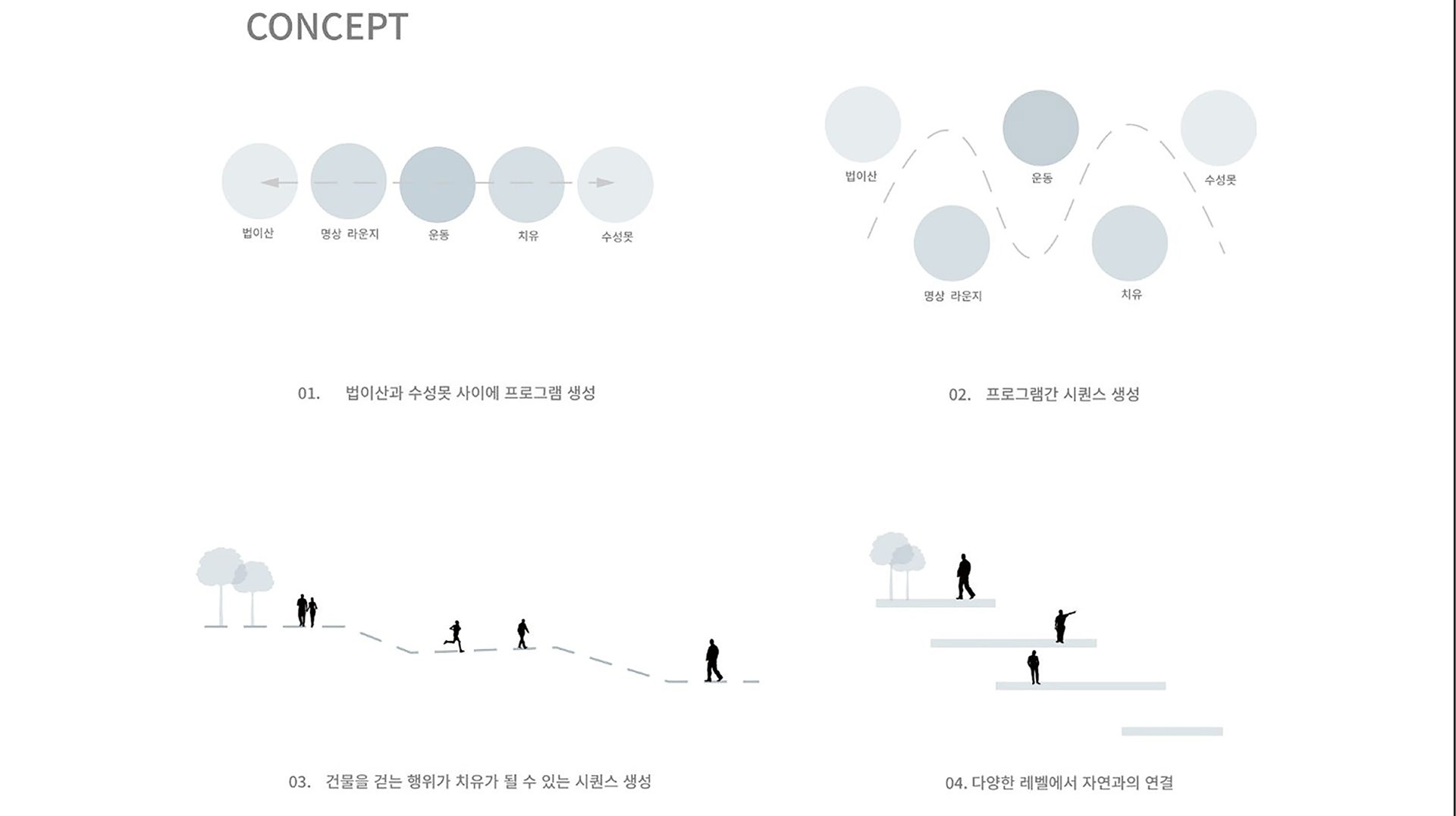 수성 웰니스 재활 복합 센터는 자연과 인간의 회복적 연결을 주제로, 대구 수성못과 법이산 사이에 위치한 프로젝트입니다. 대지는 한쪽으로는 평탄한 수변공원, 다른 한쪽으로는 경사진 산지가 공존하는 지형으로, 오랫동안 두 자연 사이에는 명확한 연결 없이 단절된 상태였습니다. 본 프로젝트는 단순한 치료 시설을 넘어, 자연을 회복의 일부로 끌어들이는 건축적 연결 장치를 제안합니다. 전체적인 매스는 법이산의 지형 흐름을 따라 분산형으로 배치되었으며, 산책로와 공원으로부터 수성못까지 자연스럽게 이어지는 치유의 시퀀스를 형성합니다. 건축을 따라 걷는 행위 자체가 재활 프로그램이자 회복의 과정이 되도록 계획했으며, 매스를 잇는 브릿지는 단순한 이동 통로가 아니라 다양한 고도와 풍경을 경험하게 하는 수평적 이동 장치로 작동합니다. 이를 통해 사용자는 부담 없이 물리적·심리적 치유를 함께 경험할 수 있습니다. 프로그램은 명상실, 오픈 프로그램 존, 운동 치료실, 재활 치료실, 내부 정원과 외부 데크 등으로 구성되며, 각 공간은 외부 자연과 시각적으로 연결되어 있습니다. 이로써 치유가 단절되지 않고, 연속적인 회복의 흐름속에 배치되도록 하였습니다. 결국 이 프로젝트는 법이산 산책로에서 시작된 치유의 여정이 수성못 수변으로 확장되는 과정을 담으며, 자연과 인간이 함께 회복하는 새로운 경계를 제시합니다.