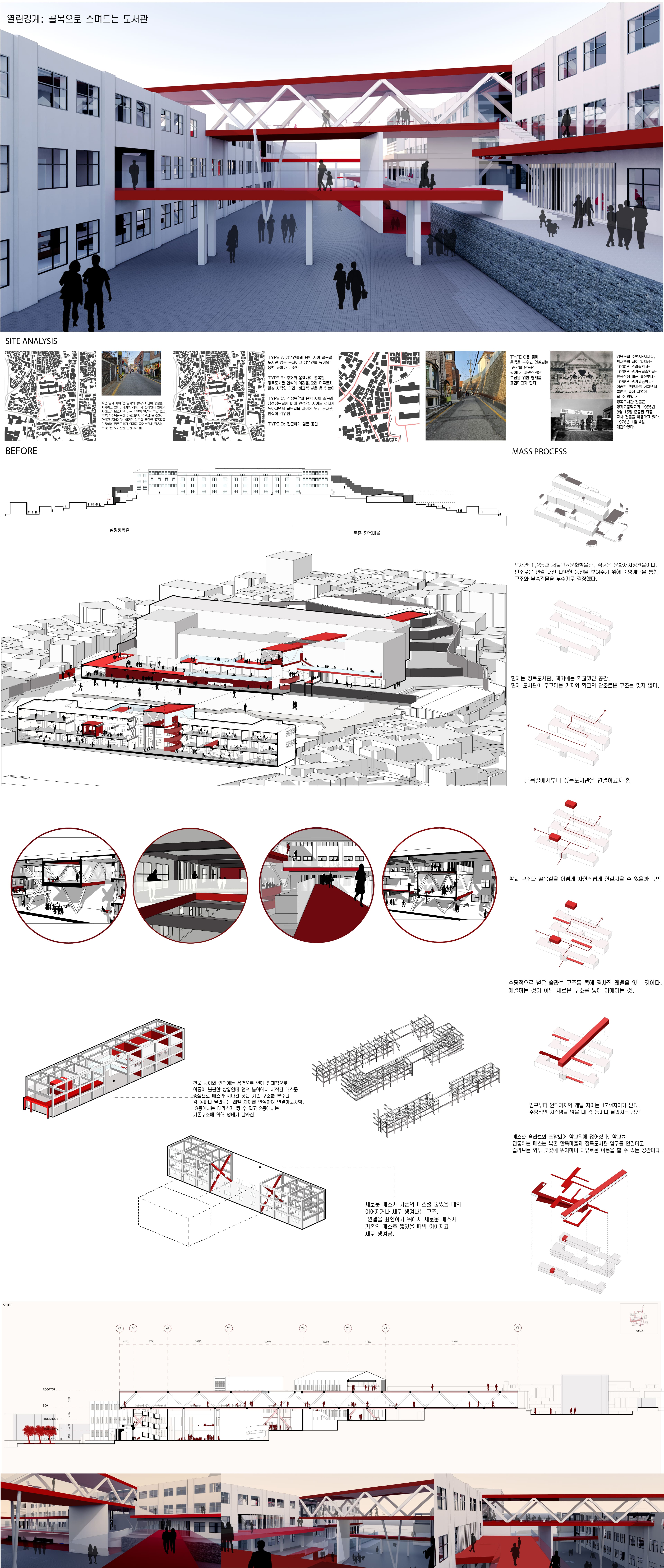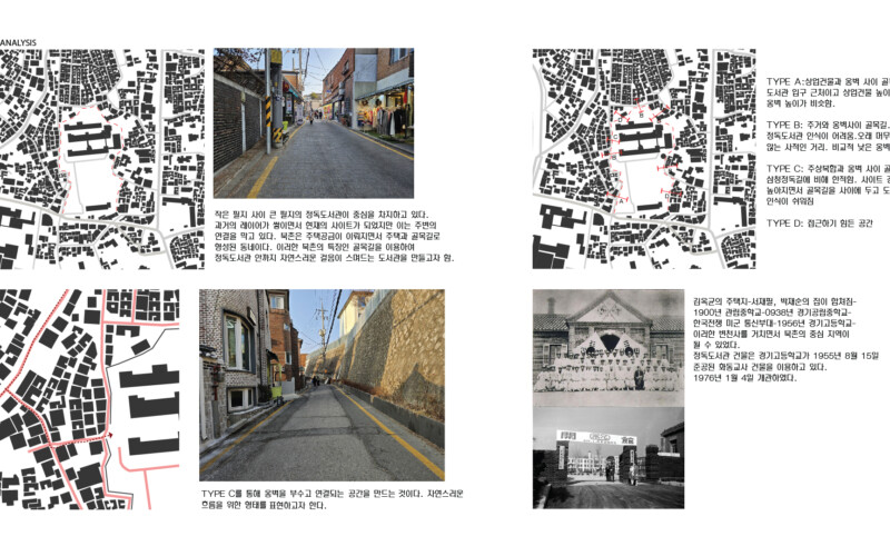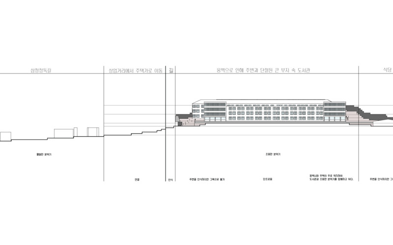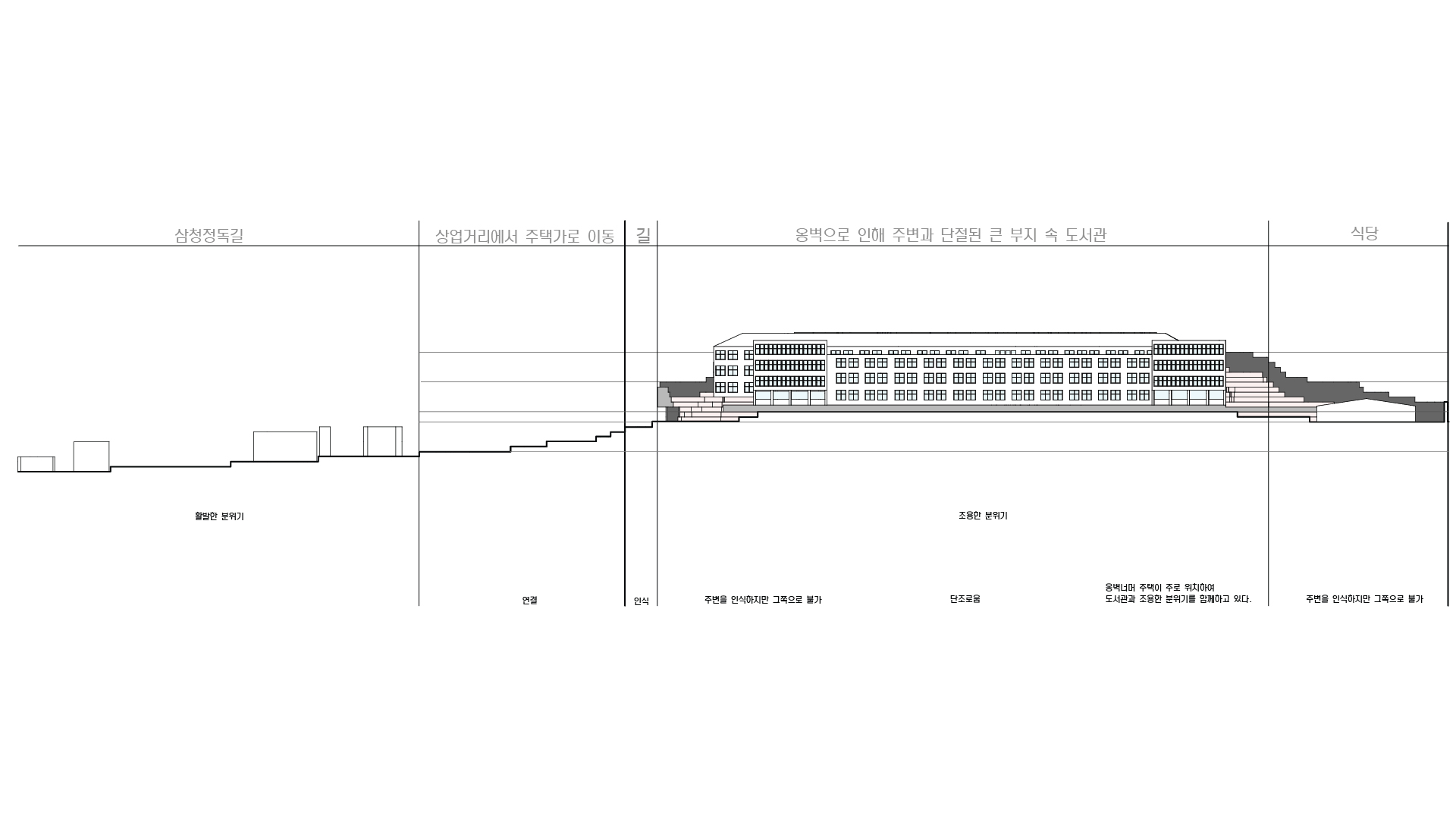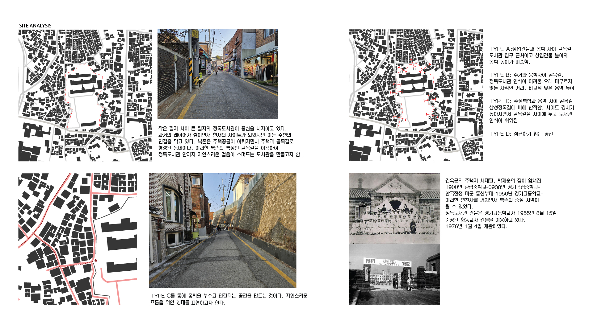 정독도서관이 위치한 북촌은 주택공급을 위해 대규모 토지가 소규모로 분할되면서 한옥과 골목길이 만나 이루어진 공간이다. 골목길과 옹벽으로 둘러싸인 경사진 정독도서관을 연결시키기 위해 정독도서관의 옹벽과 높낮이를 해결하고자 한다.
