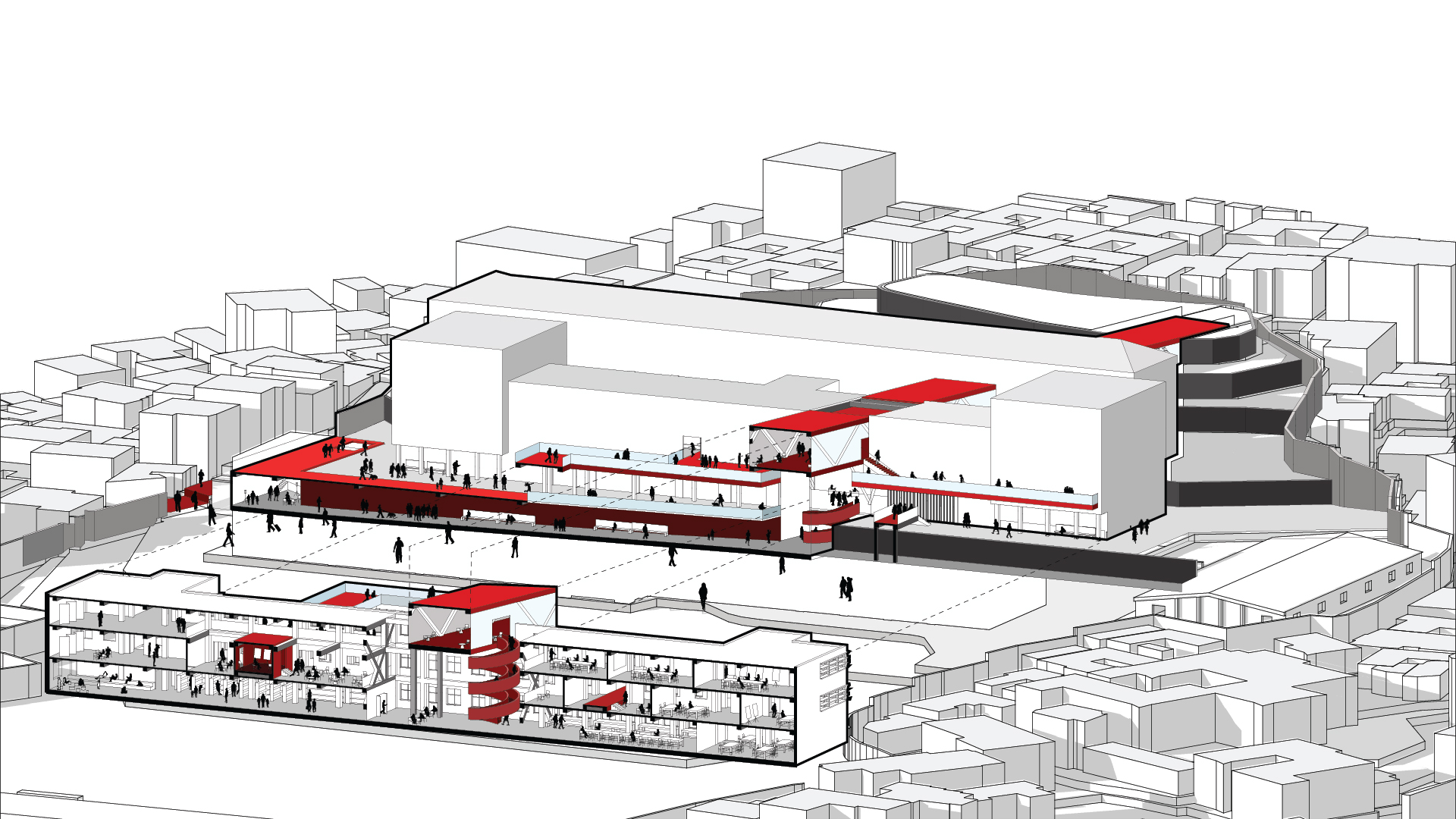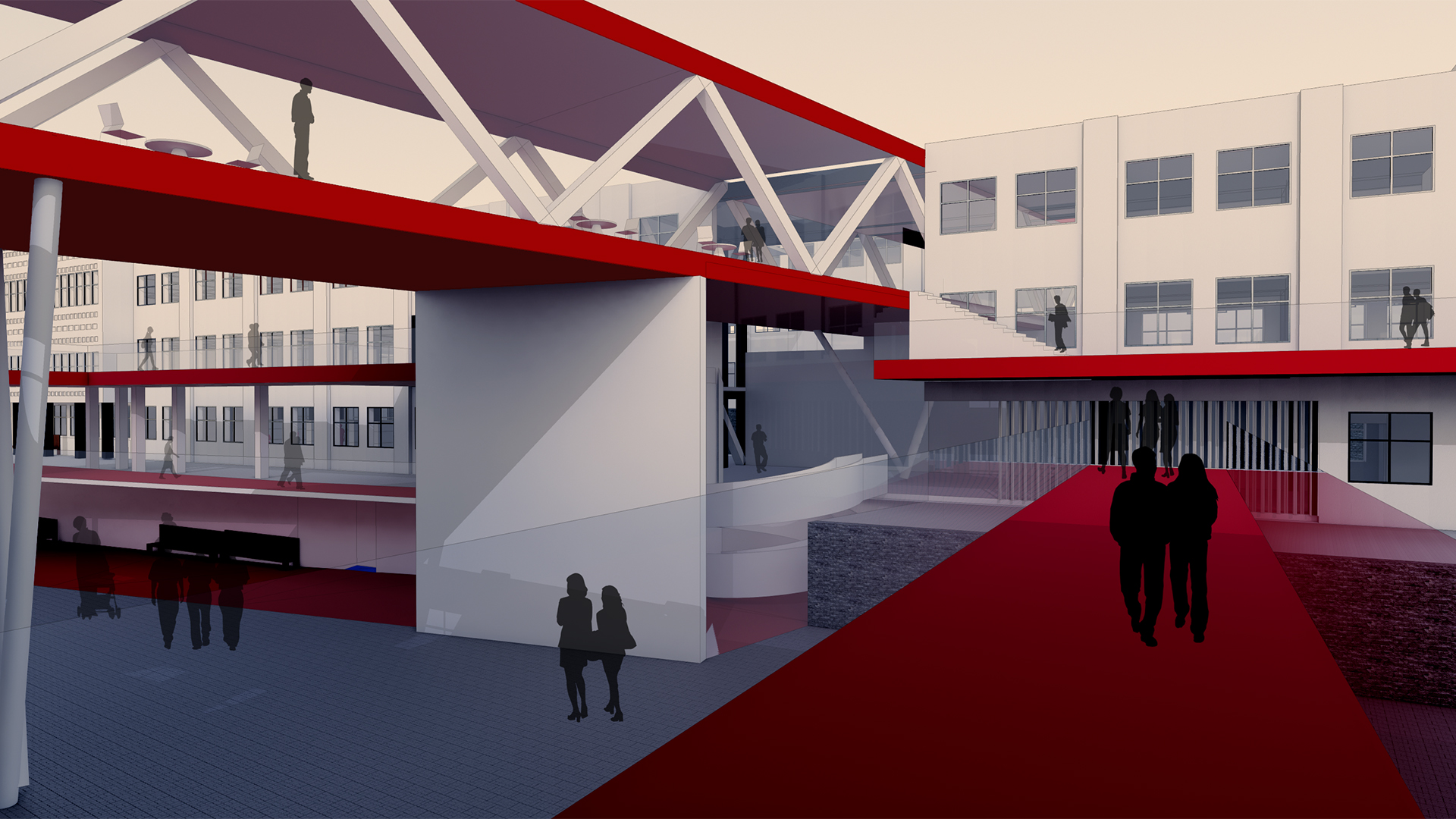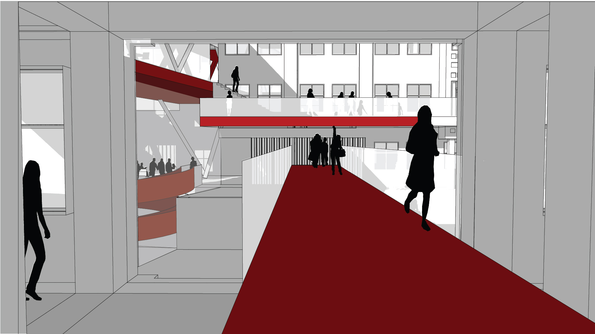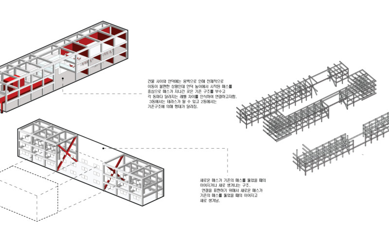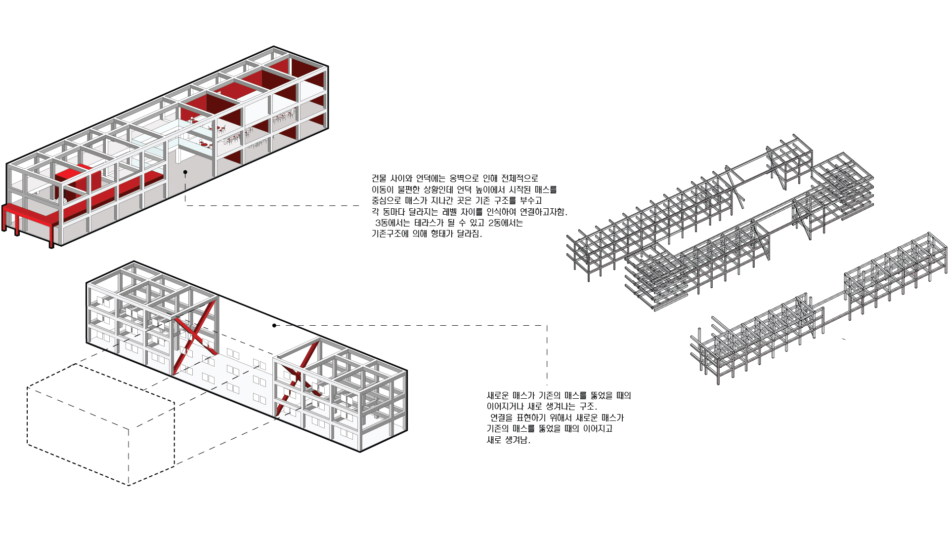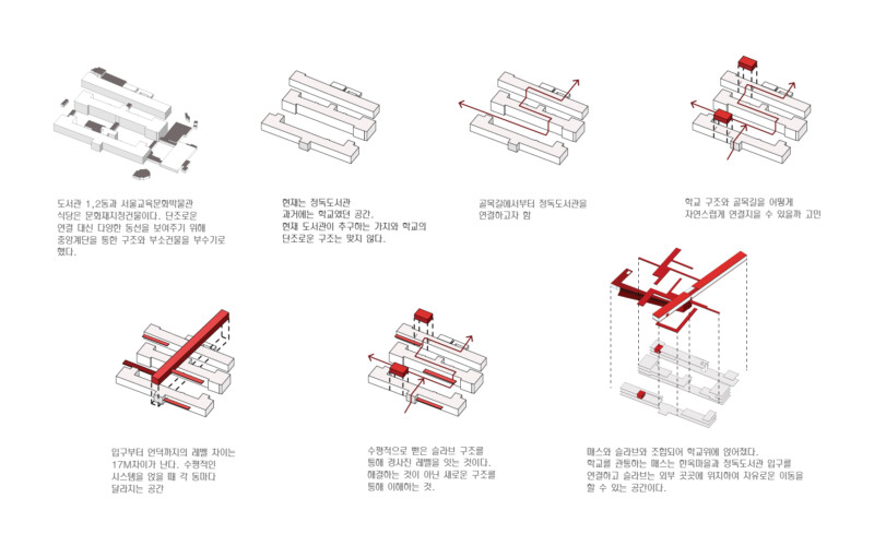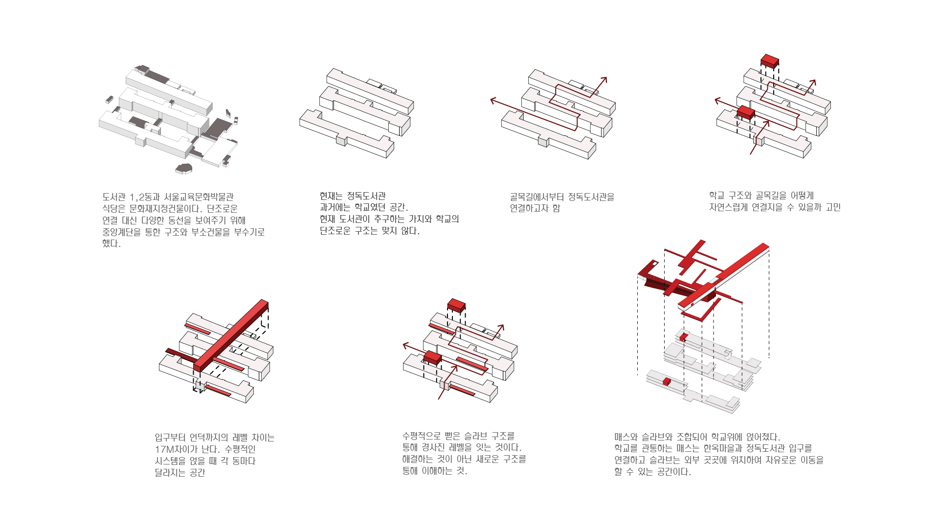 이러한 점에서 골목길에서 쉽게 인식할 수 있는 공간이 필요하다고 생각했고 옹벽 일부를 없애서 골목길과 도서관을 연결하고자 했다. 삼청 정독길에서 주상복합이 위치한 골목길과 이어지는 구간이 정독도서관을 인식하기에 자연스러운 구간이었다. 골목길과 사이트의 레벨은 4m이상 차이가 났다. 연결하고자 하는 곳에 축을 설정하여 긴 매스를 구성하였다. 옹벽을 허물고1동과 2동 외부 사이공간과 이어지는 매스를 구성하여 또 다른 입구를 만들었고 사이트에서 제일 높은 경사와 레벨이 일치하고 1동과 이어지는 매스를 구성하여 경사마다 달라지는 경관을 경험할 수 있게 하였다. 세개의 동으로 구성된 정독도서관은 경사진 대지에 위치하고 있어 중앙계단 말고는 이동이 불가능하다. 각 동에서 주변 조건에 따라 슬라브를 형성하여 외부 사이공간과의 접근성을 높여 열린 공간을 조성하고자 했다.