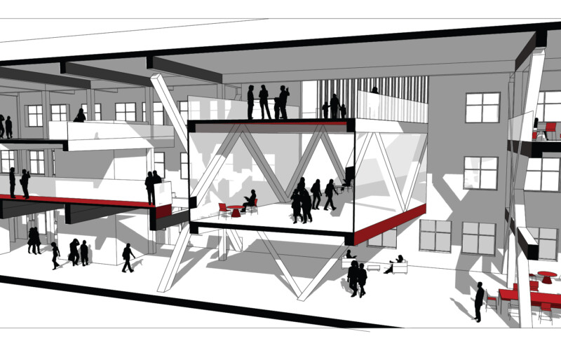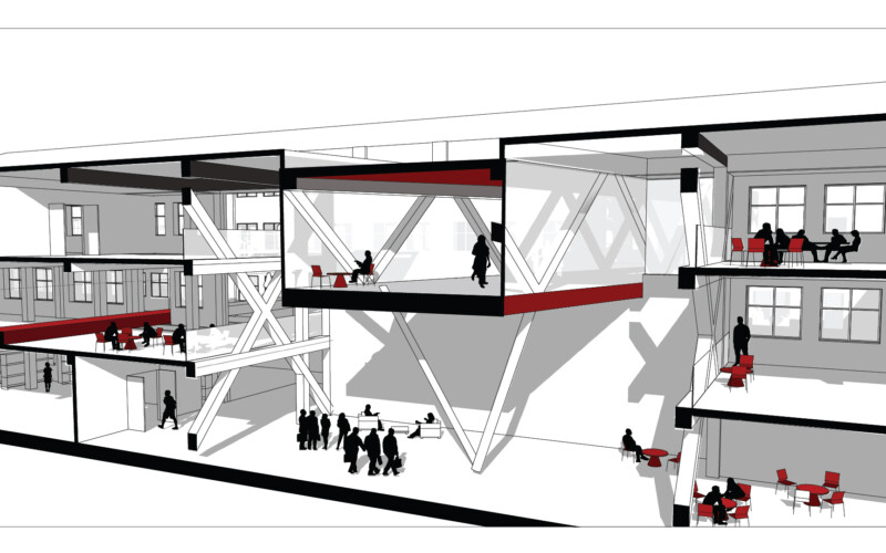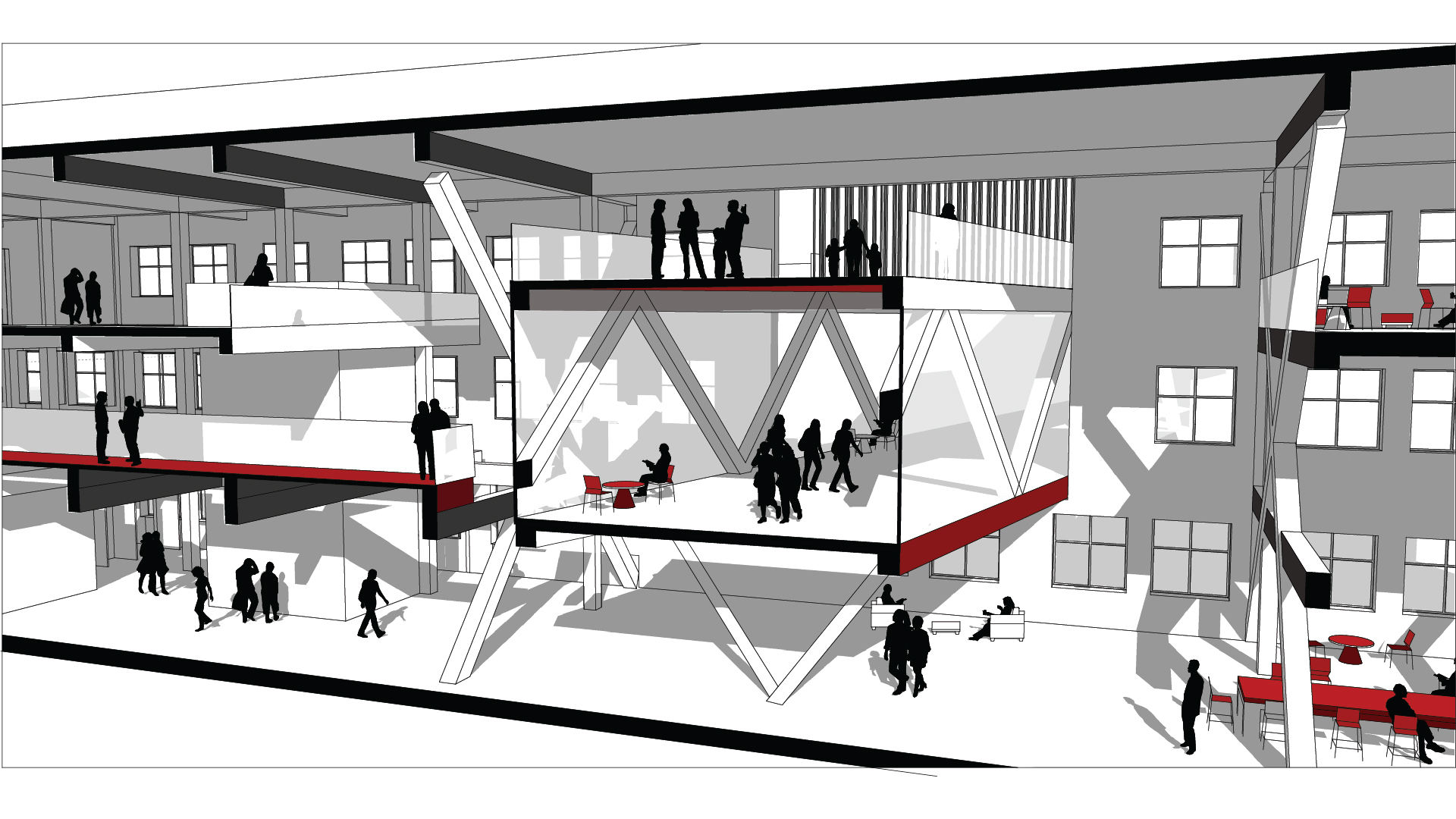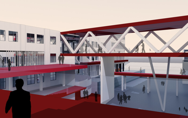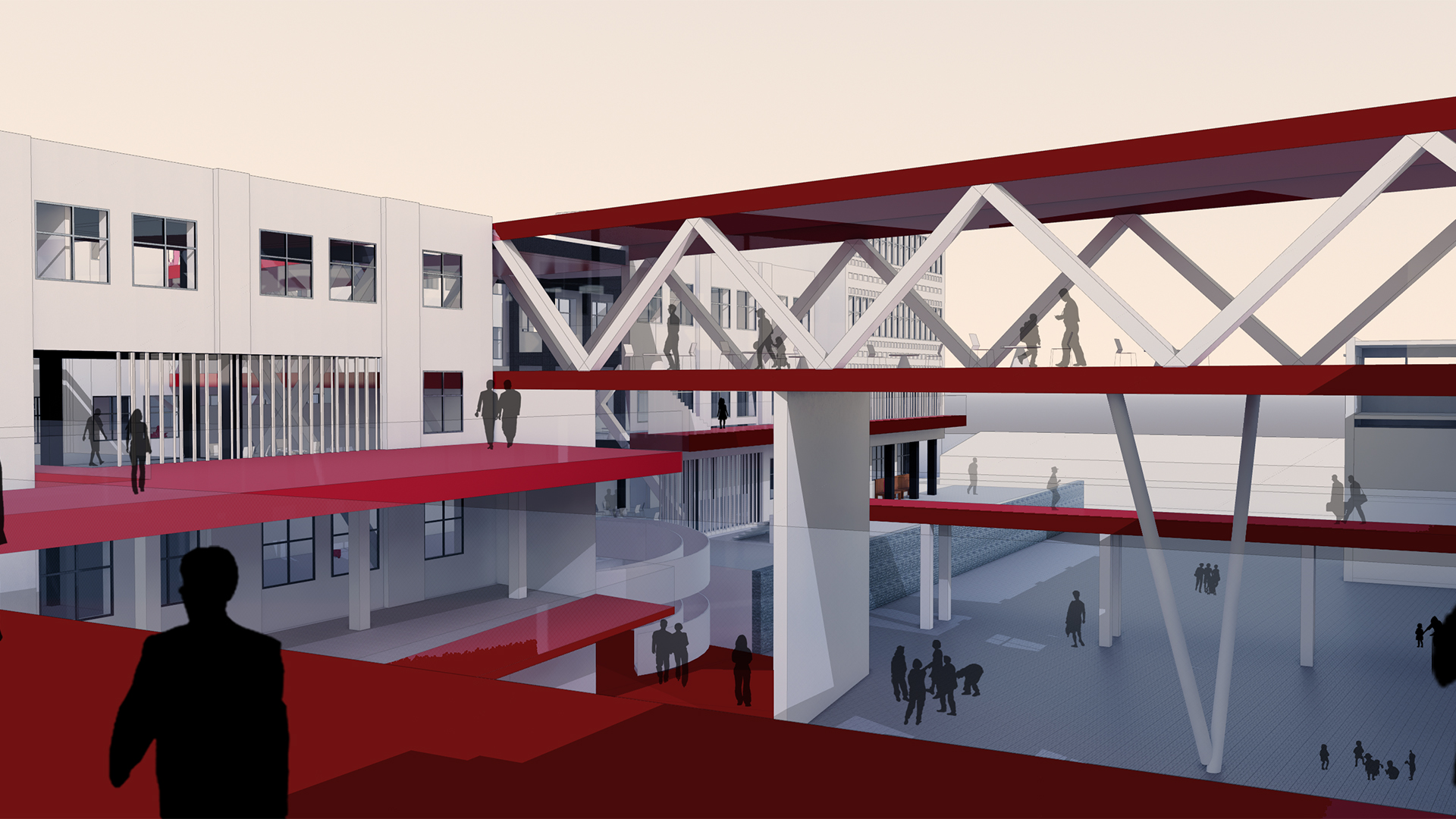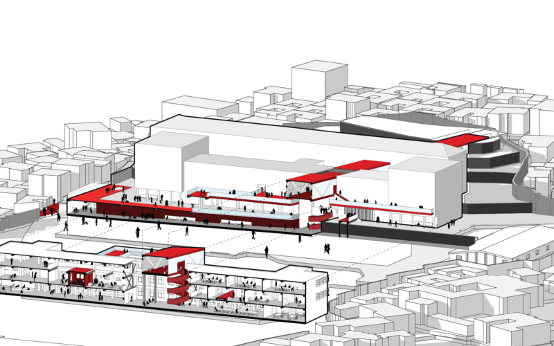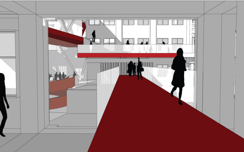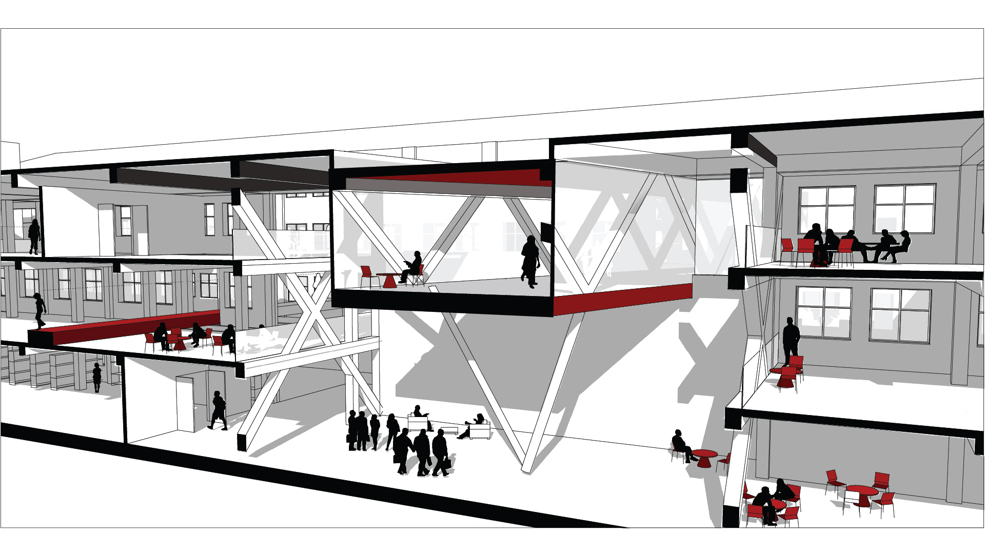 이러한 점에서 골목길에서 쉽게 인식할 수 있는 공간이 필요하다고 생각했고 옹벽 일부를 없애서 골목길과 도서관을 연결하고자 했다. 삼청 정독길에서 주상복합이 위치한 골목길과 이어지는 구간이 정독도서관을 인식하기에 자연스러운 구간이었다. 골목길과 사이트의 레벨은 4m이상 차이가 났다. 연결하고자 하는 곳에 축을 설정하여 긴 매스를 구성하였다. 옹벽을 허물고1동과 2동 외부 사이공간과 이어지는 매스를 구성하여 또 다른 입구를 만들었고 사이트에서 제일 높은 경사와 레벨이 일치하고 1동과 이어지는 매스를 구성하여 경사마다 달라지는 경관을 경험할 수 있게 하였다. 세개의 동으로 구성된 정독도서관은 경사진 대지에 위치하고 있어 중앙계단 말고는 이동이 불가능하다. 각 동에서 주변 조건에 따라 슬라브를 형성하여 외부 사이공간과의 접근성을 높여 열린 공간을 조성하고자 했다.