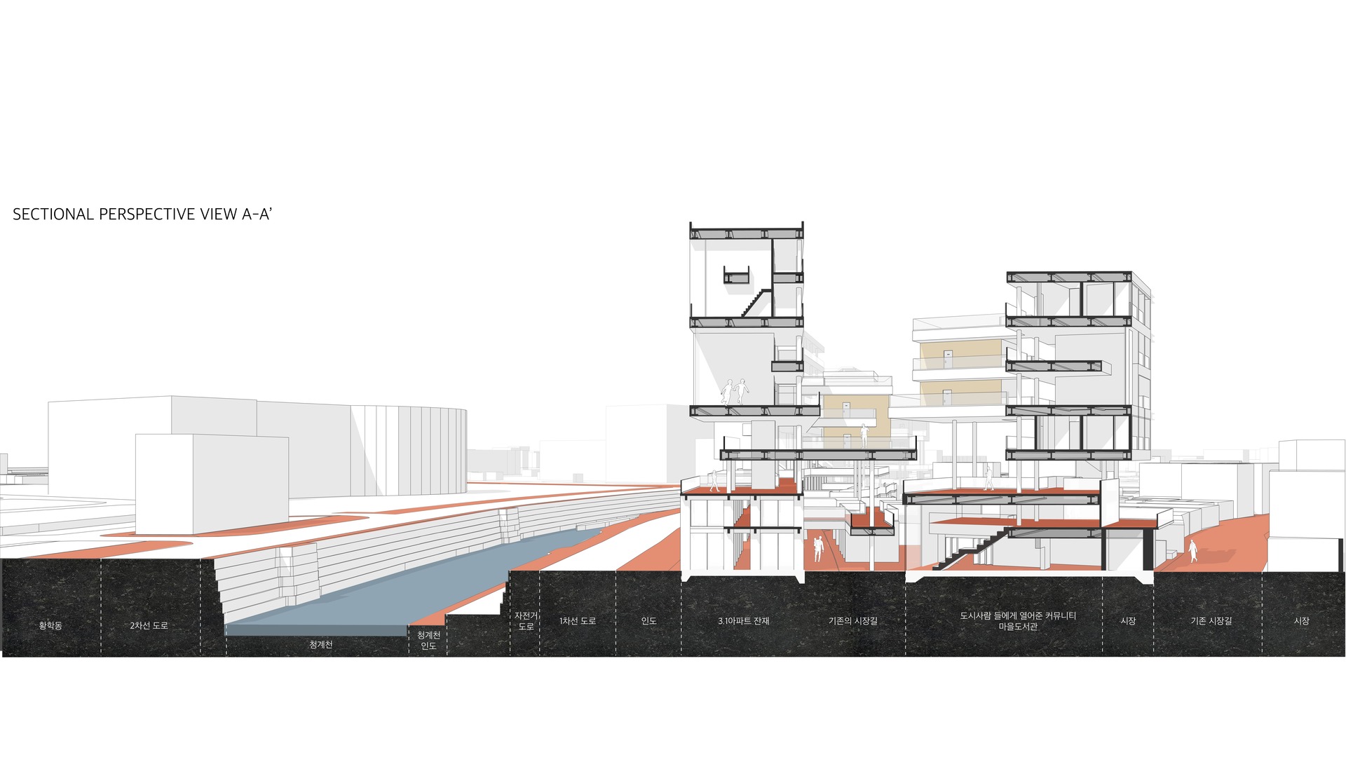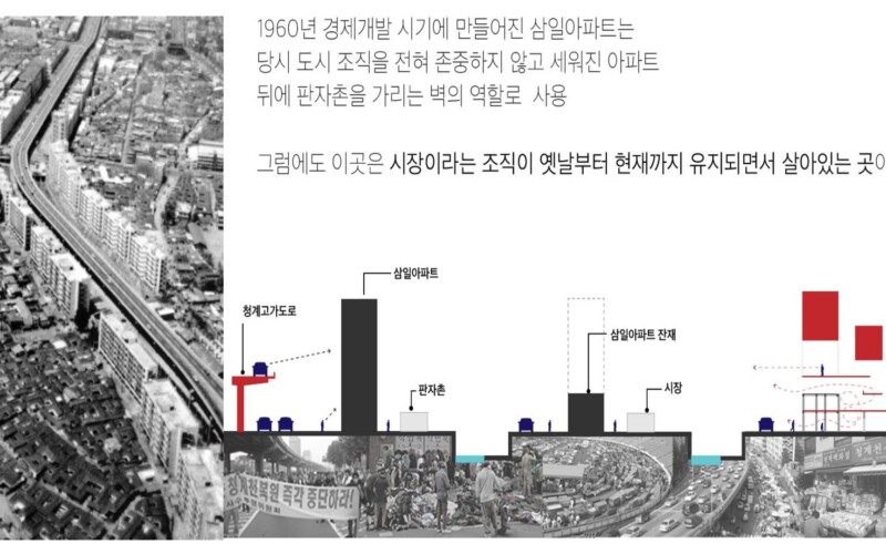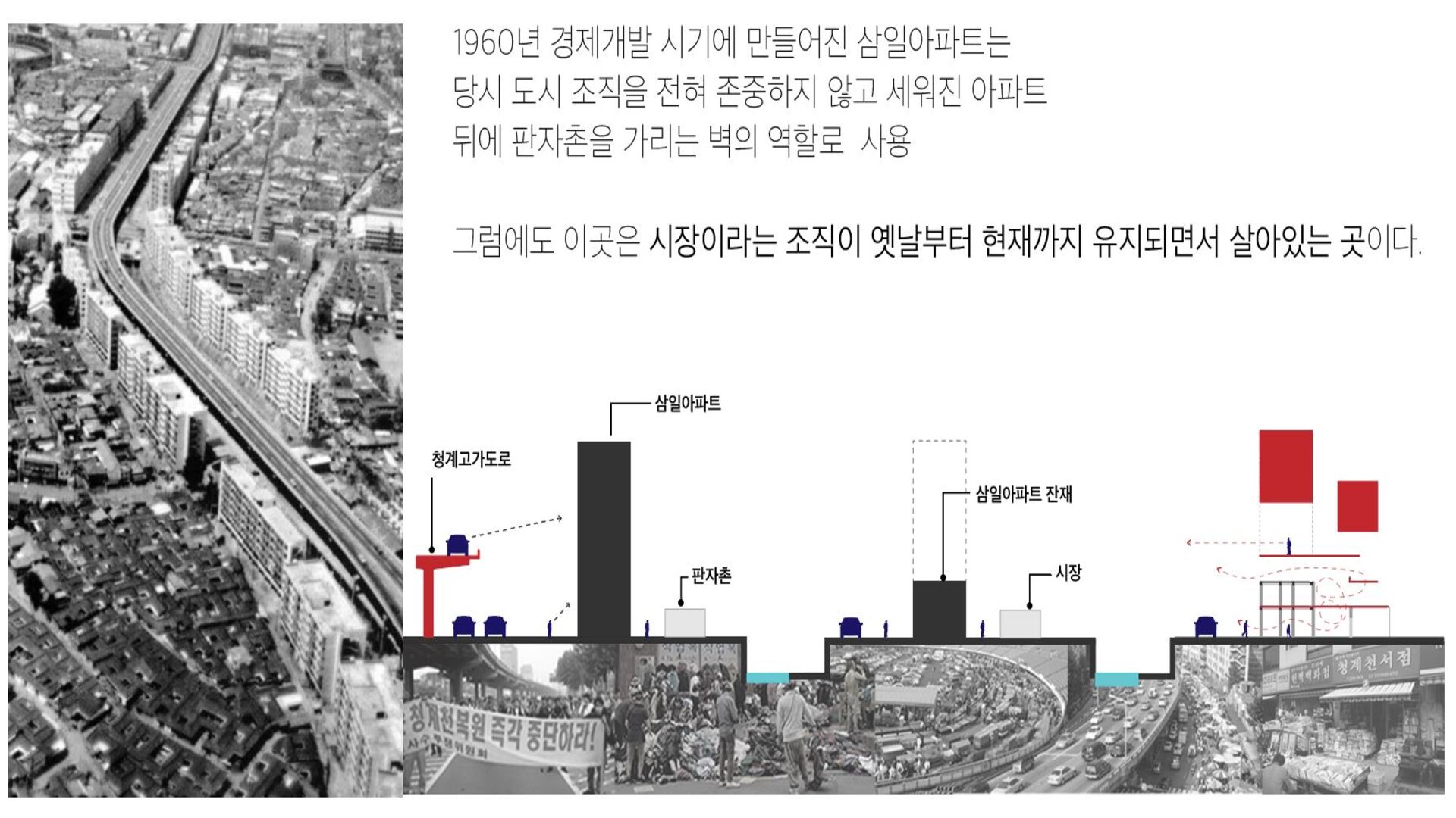 사이트로 선정한 부지는 1960년 경제 개발시기에 만들어진 근대화의 상징으로 청계고가도로의 선형을 따라 만들어진 주상복합아파트인 삼일시민아파트 부지이다. 그 당시 경제 개발로 인해 주변의 도시 조직을 전혀 존중하지 않고 세워진 아파트로 뒤에 판자촌을 가리기 위한 벽의 역할로 사용되었던 모습은 현재 도시적 단절을 일으키는 아파트단지와 같은 의미를 담고있다고 생각했다. 그럼에도 이곳은 시장이라는 조직이 옛날부터 현재까지 유지되면서 살아 있는것의 연속성상의 의미가 크다고 생각했다. 하지만 현재 삼일시민아파트의 철거가 논의가오가는 시점에서 또 다시 그 지역의 정체성과 조직은 사라진 채 새로운 유형으로 만드는 것이 아닌 기존의 시장이라는 조직을 존중하면서 주거의 타입을 얹을 수 있는 현대적으로 다시 한번 재해석한 시장아파트이다.