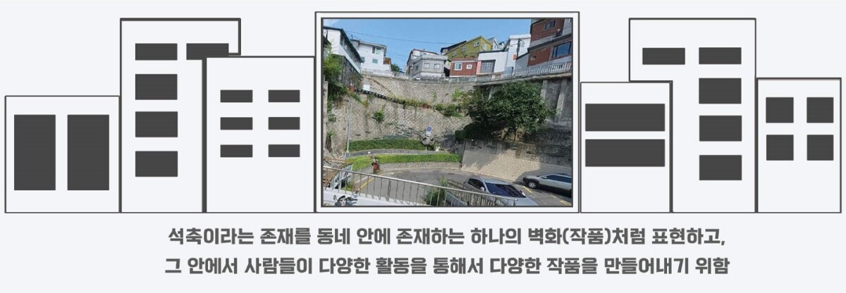 넓은 벽화마을의 땅 중에서 이 곳을 선정하게 된 이유는 밑에서부터 올라오면서 느낀 석축의 아름다움 때문이였는데, 다리 사이에서 보이는 높은 석축이 하나의 그림작품으로 느껴졌고 이것을 더 크게 만들어 하나의 큰 예술작품이 되도록 만들고 싶었으며, 건물이 돋보이기 보다는 석축을 받쳐주는 건물을 만들어내고자 하였다.