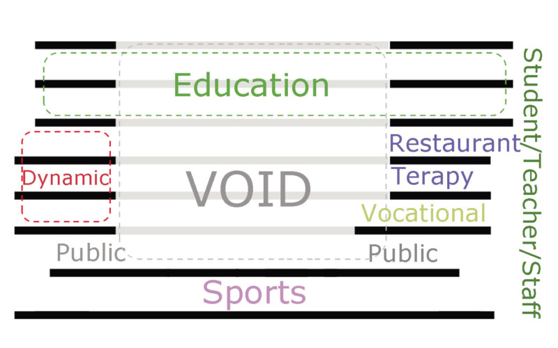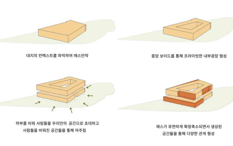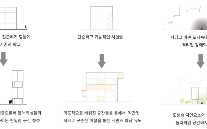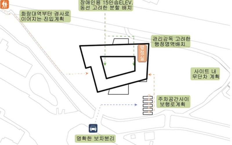 중랑구는 현재 특수학교가 하나도 설립되지 않은 자치구이다. 다른 인근 지역의 특수학교들은 정원이 넘치는 상태이고 이 곳에서 특수학교를 가기 위해선 서울 인군으로 한두 시간씩 등교를 해야 하는 상황이다. 사이트 바로 앞으로 목동천이 흐르고 주위로 산책로가 형성되어있고, 천 건너서 8차선 신내로가 지나고 뒤로는 북부간선도로가 지나고 있다. 북쪽에 위치한 북부간선도로를 등지고 목동천을 바라보며 앉히도록 배치해 산책로를 이용하는 사람들을 끌어들일 수 있도록 배치했다.