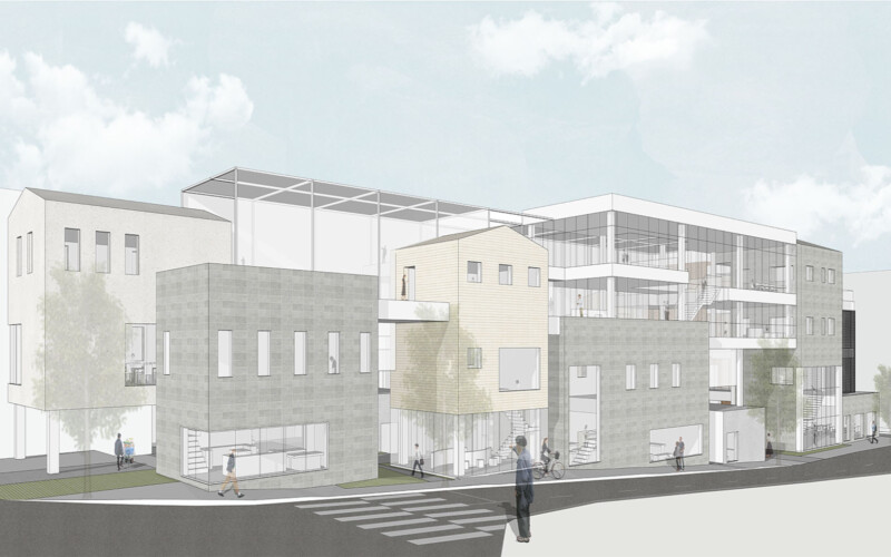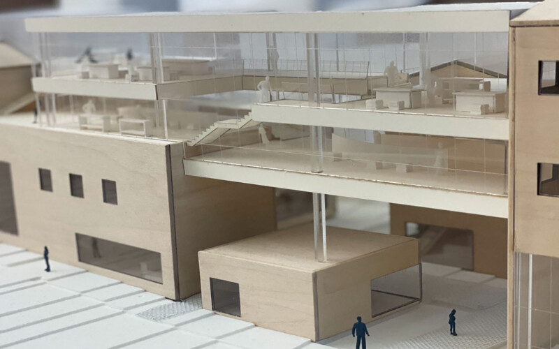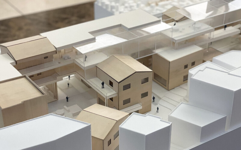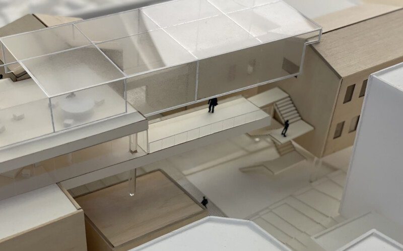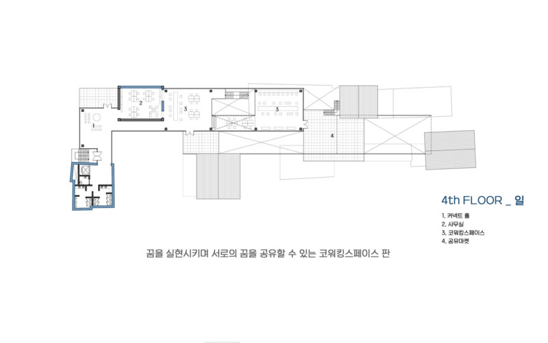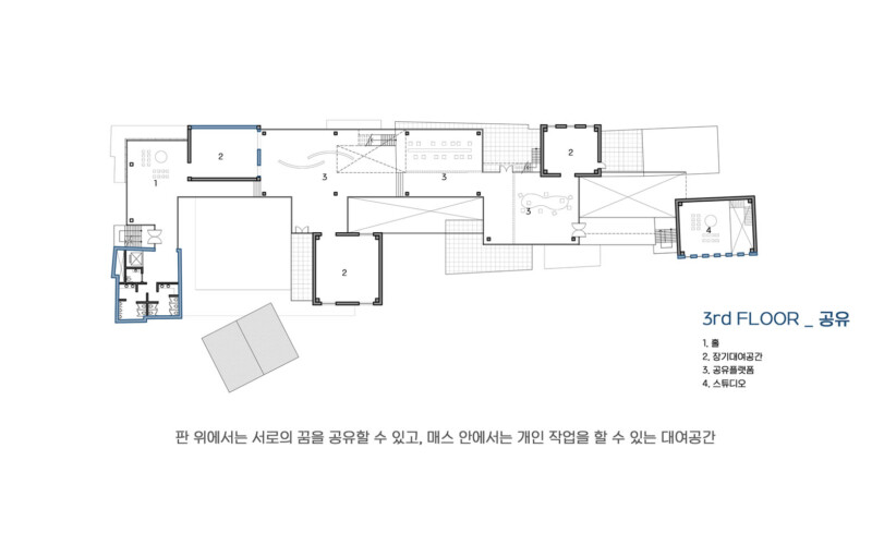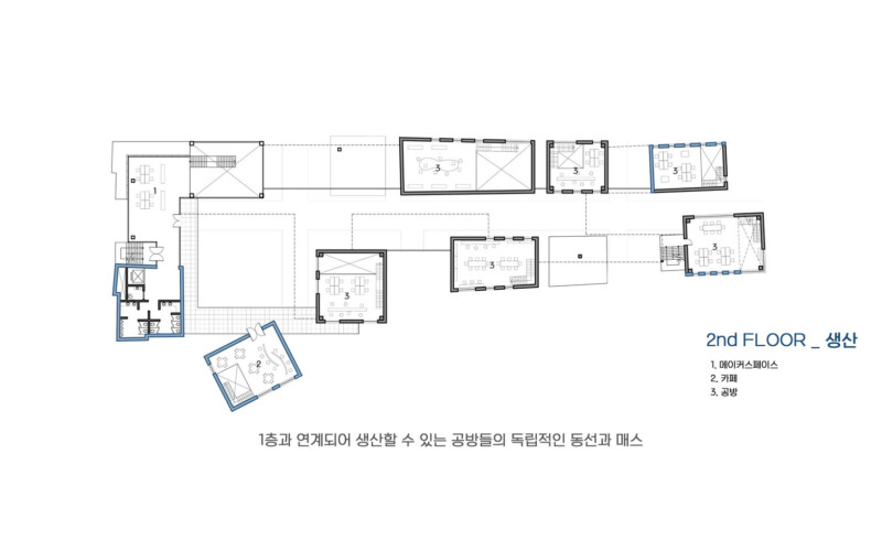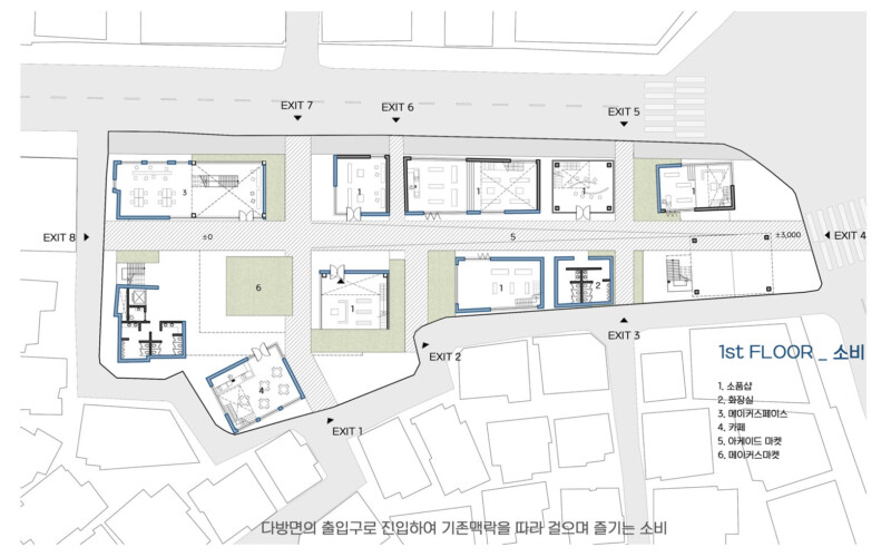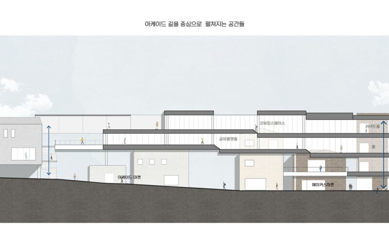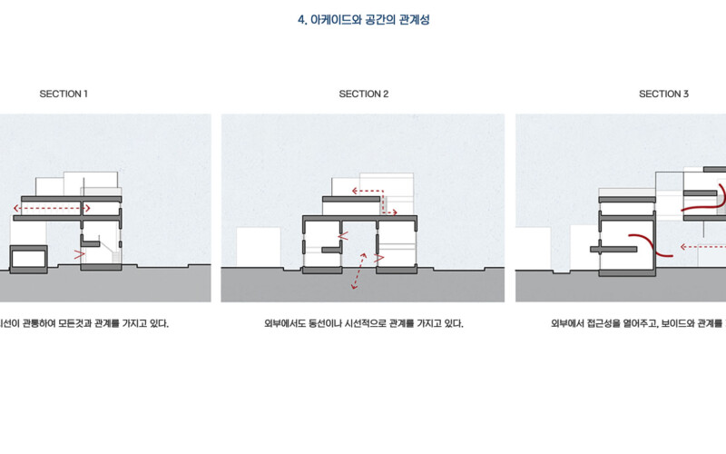 매스와 매스 사이는 골목형 아케이드인 메인 공간으로 모든 공간 또는 판과 관계성을 가진다.