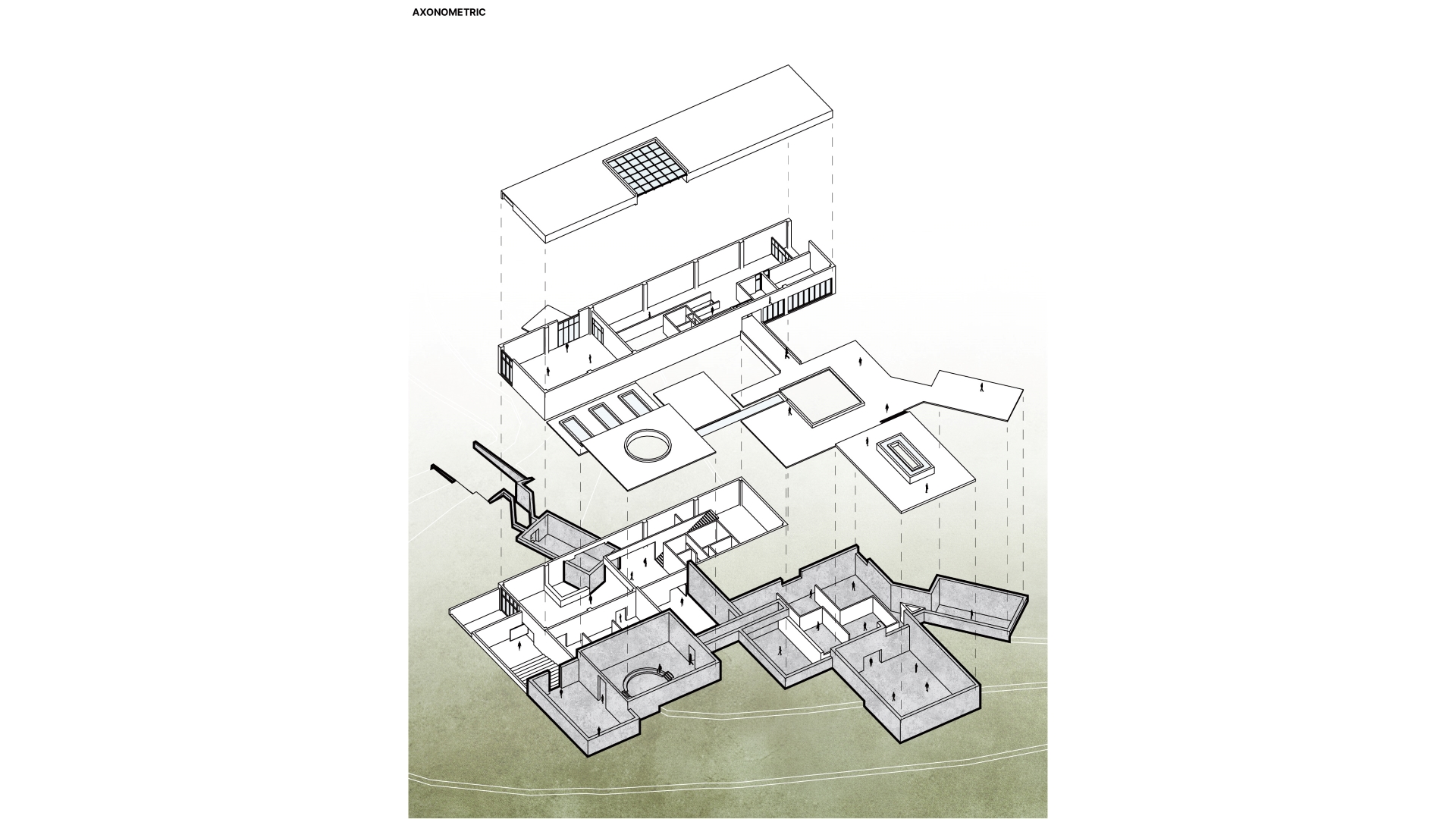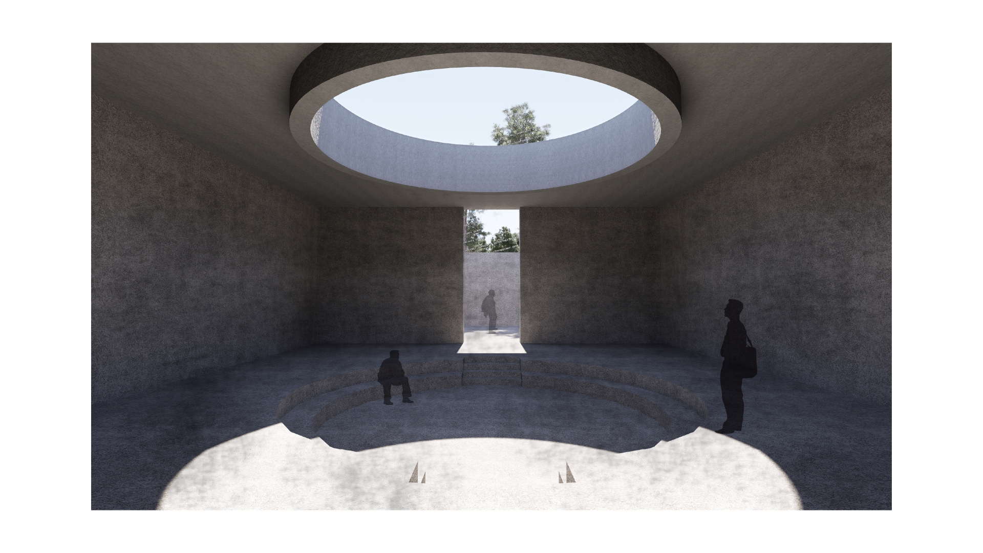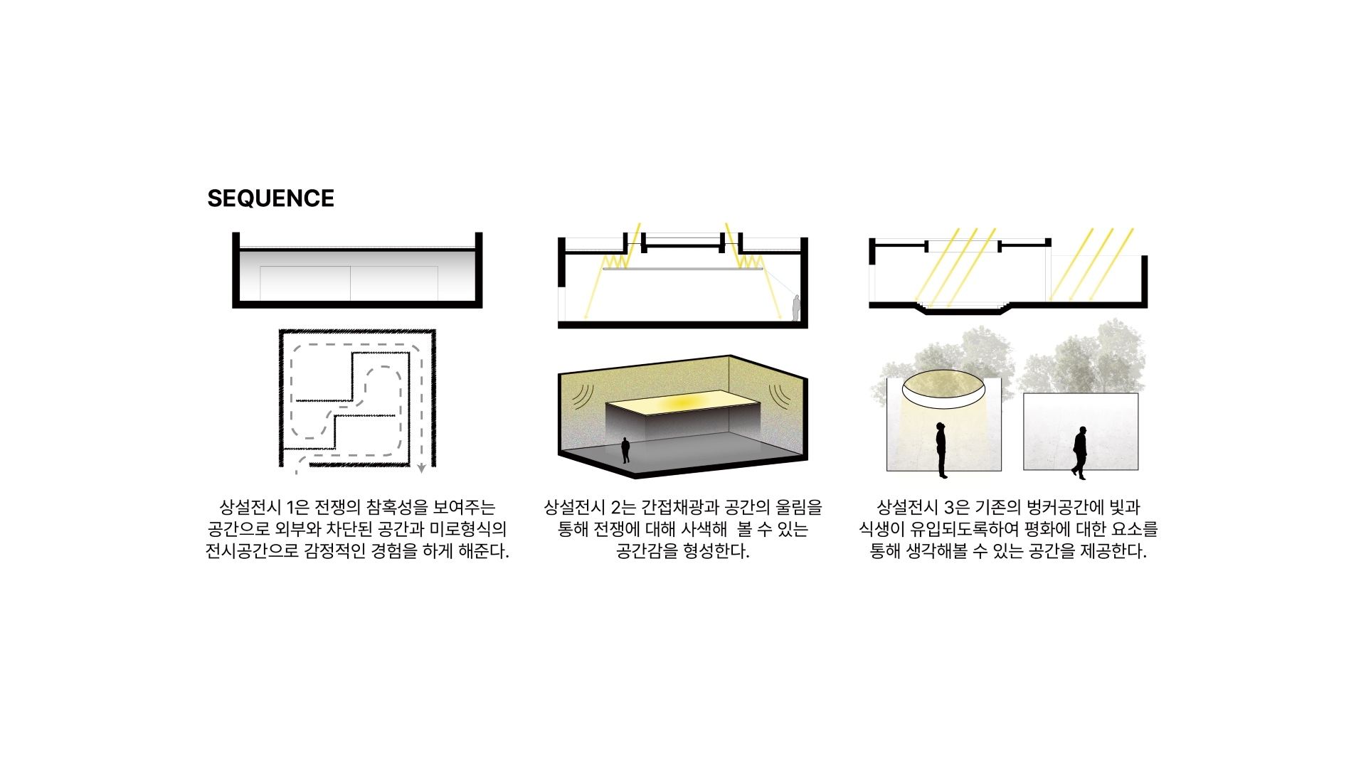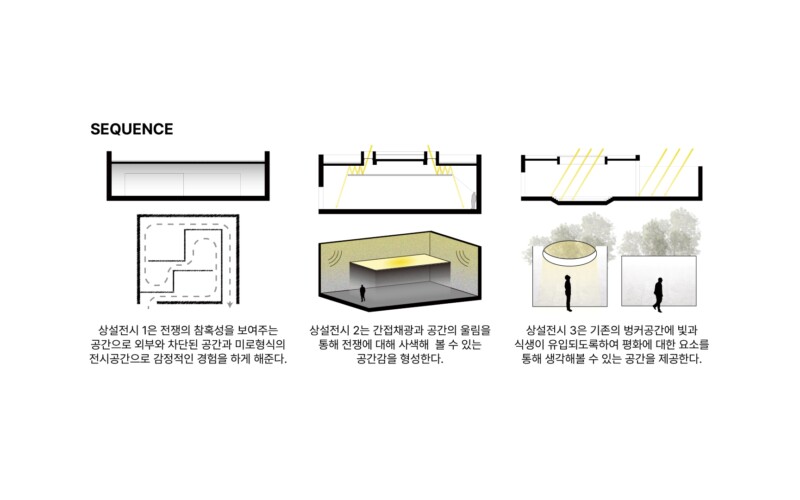 기존에 대피 공간이었던 벙커를 크게 3가지 다른 성격의 전시공간으로 활용하였다. 첫번째 공간은 미로형식의 전시공간으로 전쟁으로 인한 혼란, 공포, 불확실성을 강조하였다. 두번째는 벙커의 벽면으로 떨어지는 간접채광을 활용하여 벙커 벽의 물성을 극대화하고 이를 통해 전쟁의 흔적과 기억을 마주할 수 있도록 하였으며 마지막 공간은 원형으로 뚫린 천장을 통해 직접적으로 들어오는 자연광으로 평화의 가치를 생각해 볼 수 있는 공간을 구성하였다. 세 개의 공간으로 이동을 할 때 전이공간을 통해 진입을 할 수 있도록 되어있는데 이는 각 공간에 대한 몰입감을 극대화한다.