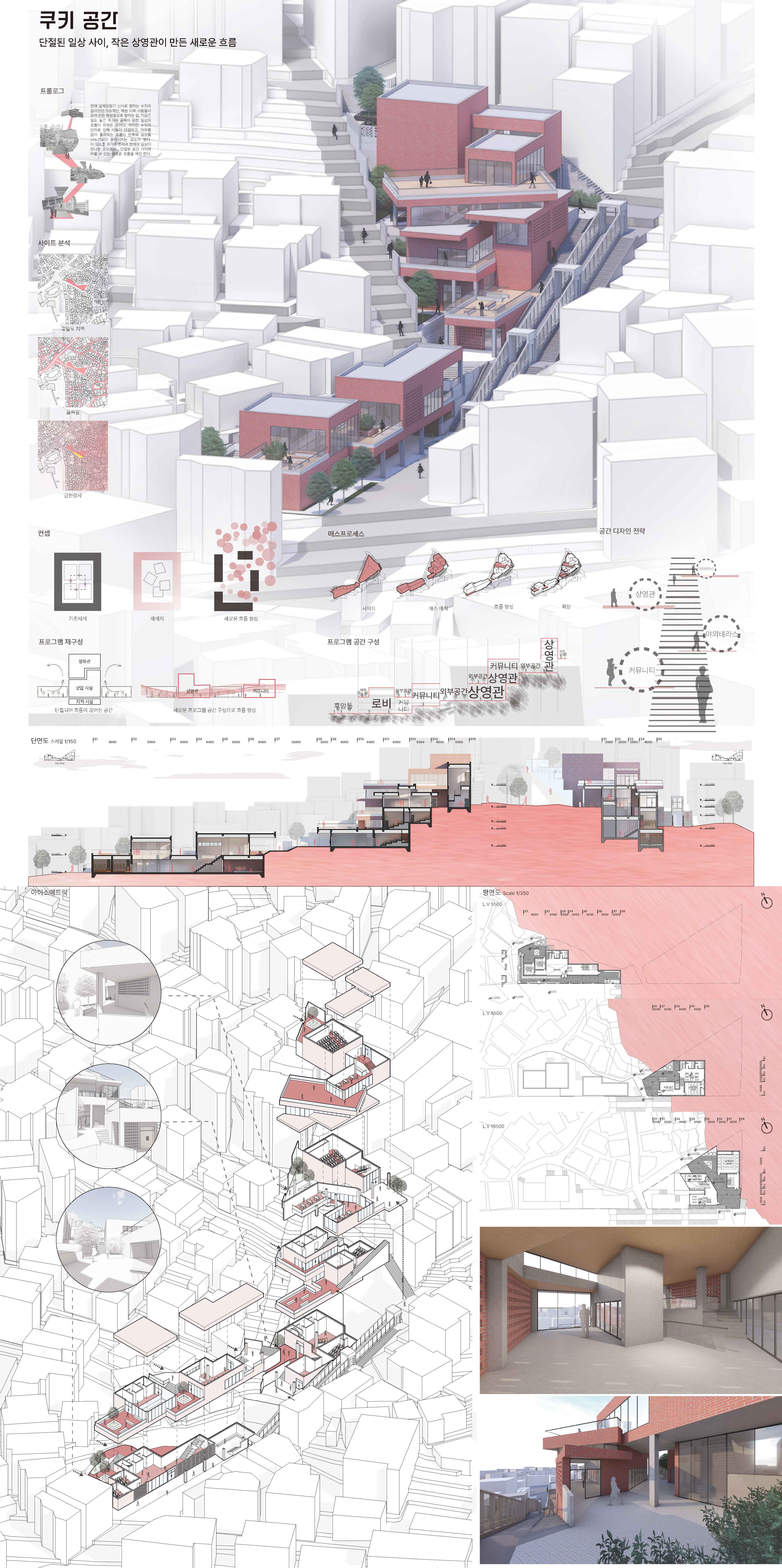 쿠키공간은 기존 영화관의 기능을 넘어서, 단절된 일상과 단차 속에 분절된 마을을 유기적으로 흐르게 만드는 공간입니다. 경사지라는 지형을 따라 공간을 분산 배치하고, 그 사이사이에 이야기와 커뮤니티가 머무를 수 있는 여백을 만든 프로젝트로 영화 상영 이후에 머무를 수 있는 공간, 바로 쿠키영상처럼 예고 없이 나타나는 보너스 같은 장소입니다.