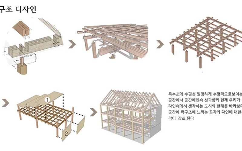 목구조에 수평성이 목조의 공간 안에 일정하게 연결되며 자연과 도심을 일어나고 있는 현재를 편견없이 받아드리며 연속되는 구조에 구조의 공간에서 자연과 도심이 목구조가 보여줄 수 있는 디자인을 통해자연에서 느끼는 공간과 구조, 현대재료를 사용한 현대를 바라보는 공간 등, 공간과 현실을 생각하게 해보았다.