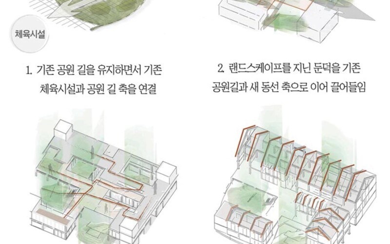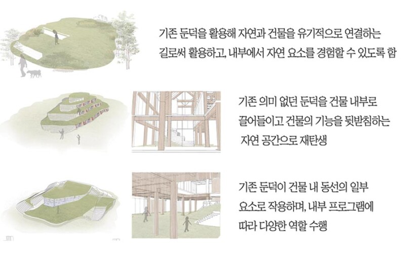 일반 적인 도심안에서 자연을 느끼며 건물과 자연이 상생하며 도심안에서도 자연과 건축이 현 삶에서 공존 되고 있는 모습이필요하다 생각한다. 그러므로 도심의 공원을 자연의 공간으로 보여지게 하며 도심의 삶에서도 자연과 을 느끼며, 도심에서 목구조인 건축 요소와 자연을 함께 느낄 수 있도록 다가가고자 한다.