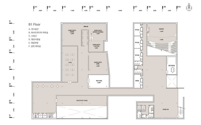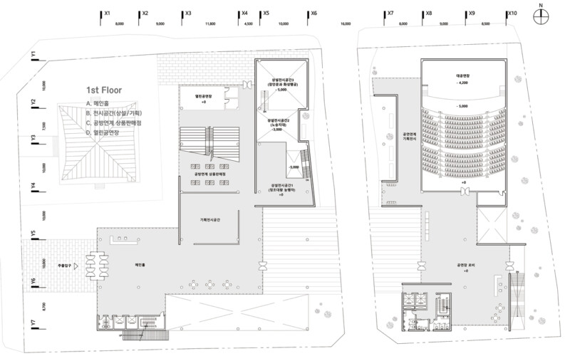 1층에서 지하 1층까지 흘러내려가듯 구경하는 대형전시공간이다. 야외테라스를 통해 내려다보며 거대한 공간감을 느낀다.