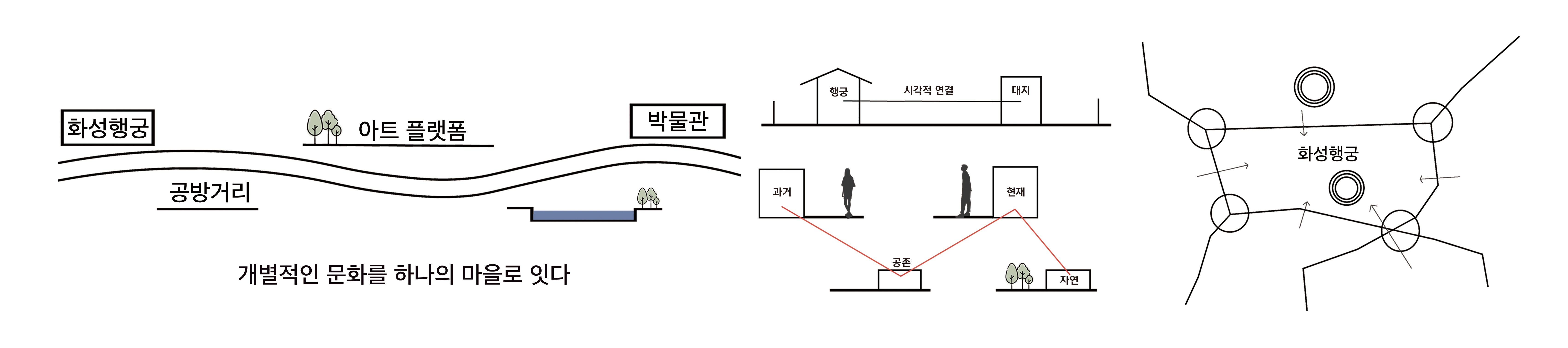 화성행궁의 열린 공간과 주변의 화성 성곽 안의 문화시설들이 시각적, 동선적으로 연결되기를 바라며 이 프로젝트를 진행했다.
