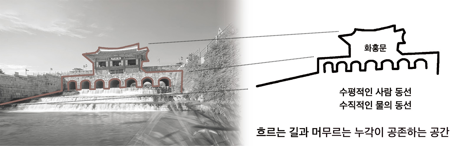 또한 화성의 북문에는 수문 화홍문이 있다. 사람들이 다니는 길목과 물이 흐르는 수문이 접하고 그 교차점 위에 사람이 쉬어가는 누각이 있다. 사방으로 흐르는 공간과 누각이라는 머무르는 공간이 공존한다.