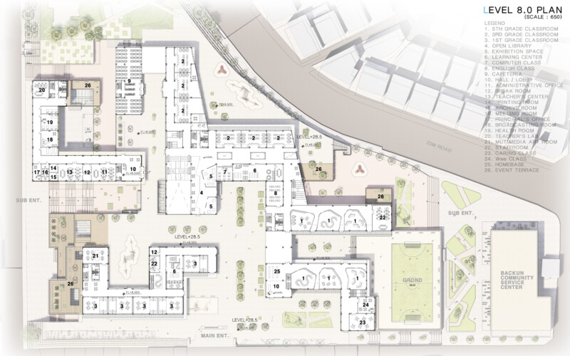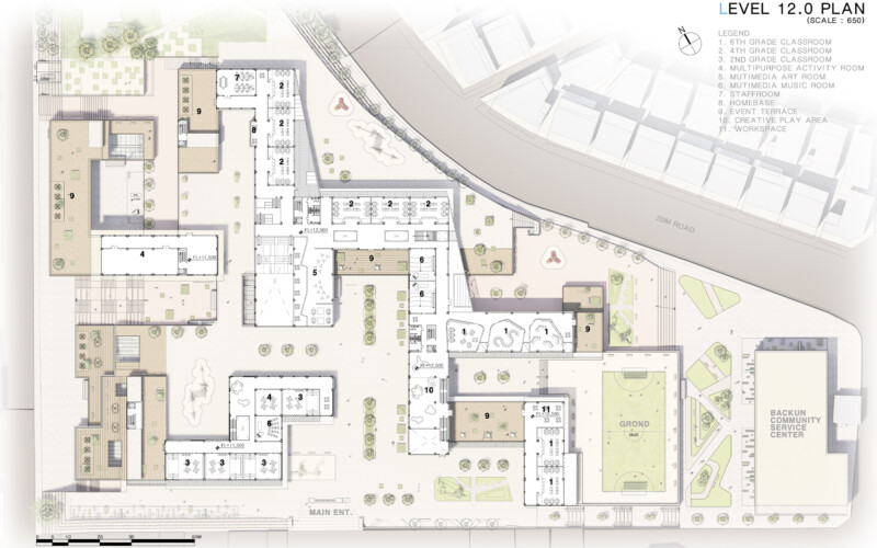 • 용도: 교육연구시설 – 초등학교 (30학급). 제 2종 근린생활시설
