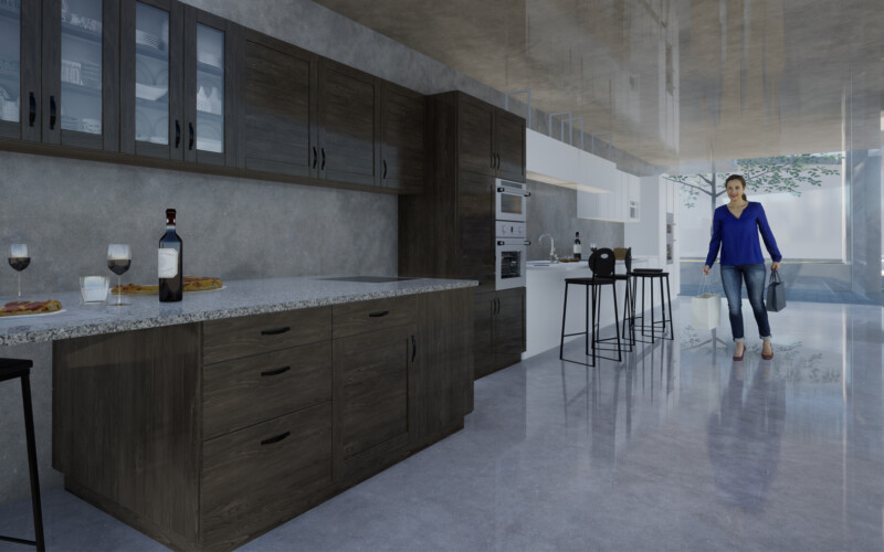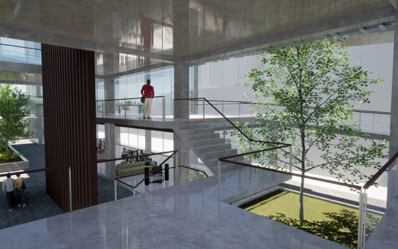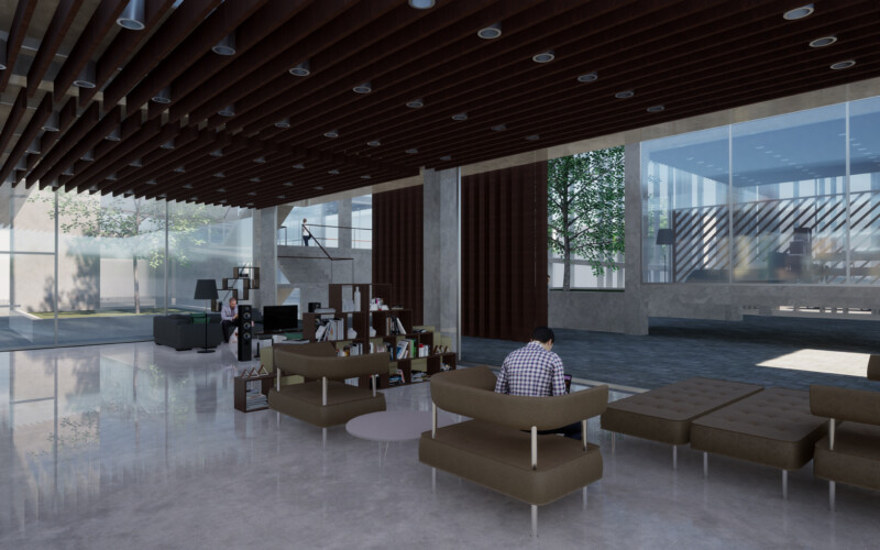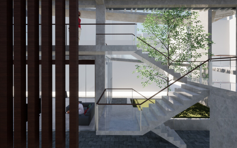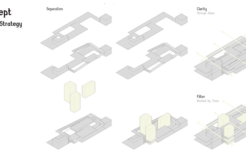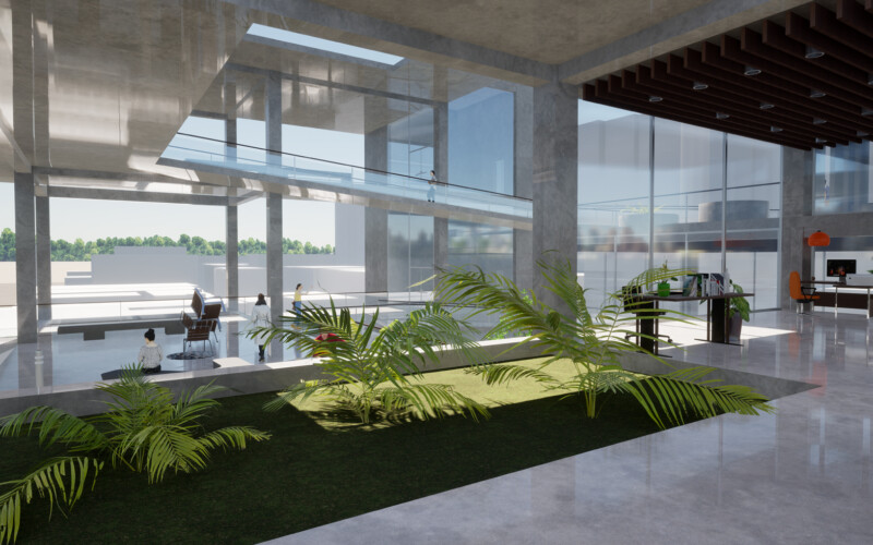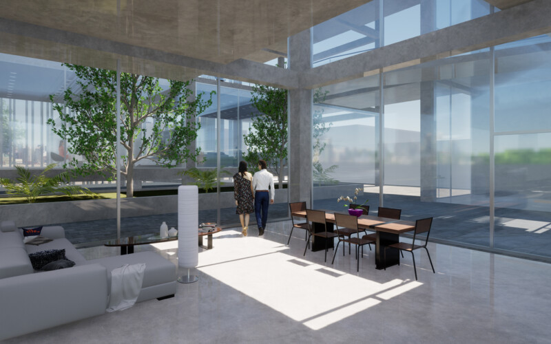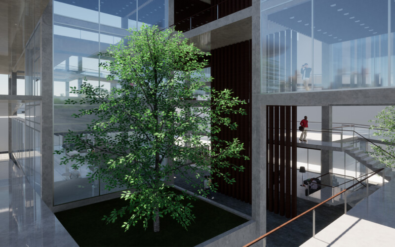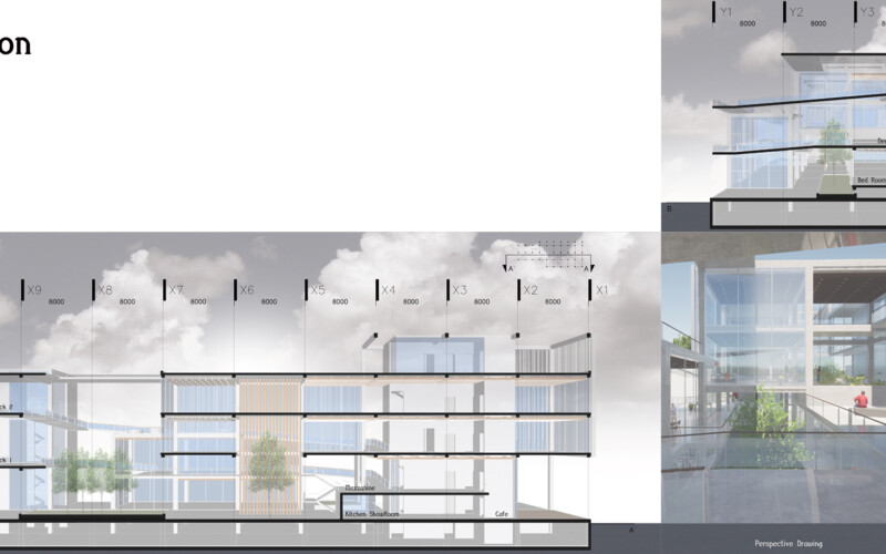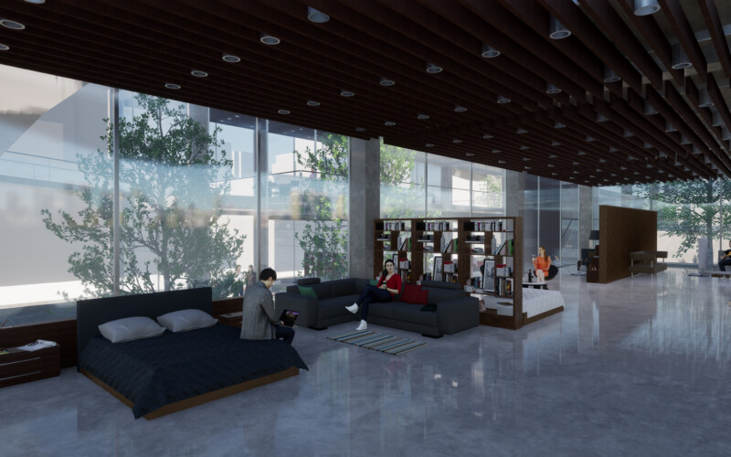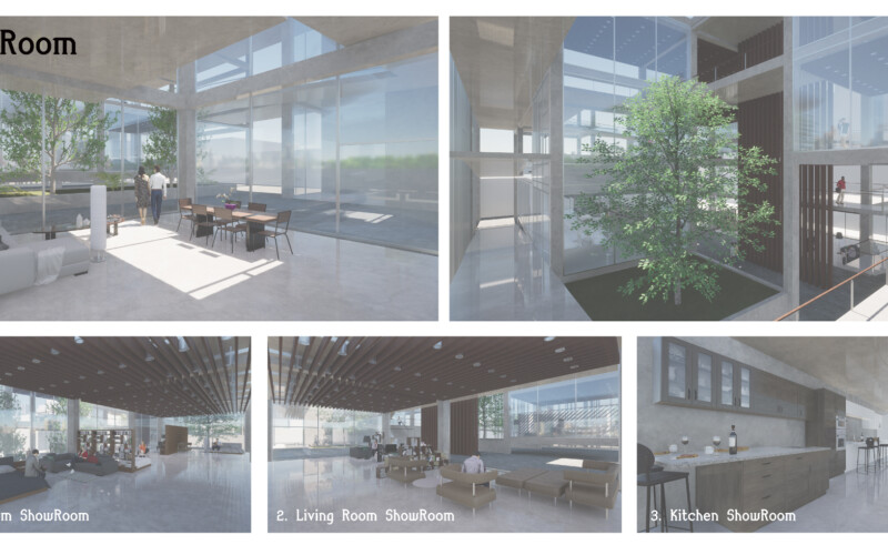 대신 식목을 통한 공간의 분절을 만들어 각 공간을 구분하도록 하였는데, 이를 통해 1층 부분에서는 진입 홀과 부엌 쇼룸, 거실 쇼룸, 침실 쇼룸이 분리되어 각 공간에 대한 진입을 다양하게 만들 수 있었다. 또한, 진입 홀은 카페 등의 상업시설로써 독립적인 역할을 수행하여 전시공간과의 시너지 효과를 기대할 수 있으리라 생각한다.