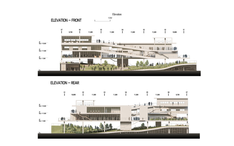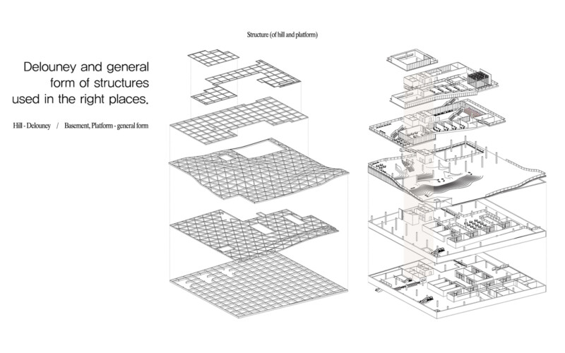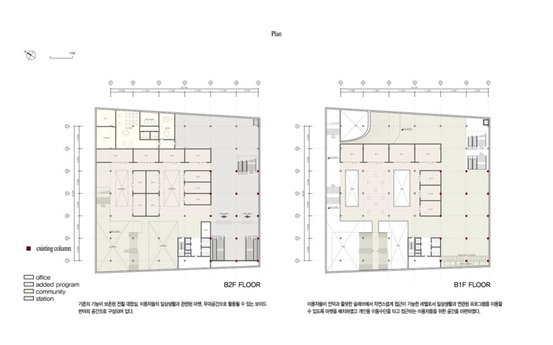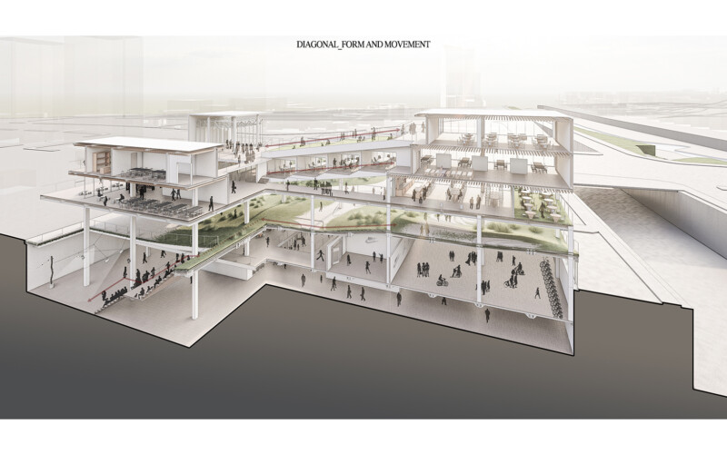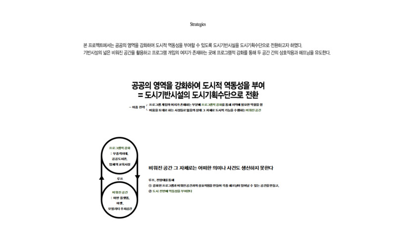 본 프로젝트에서는 공공의 영역을 강화하여 도시적 역동성을 부여할 수 있도록 도시기반시설을 도시기획수단으로 전환하고자 하였다. 기반시설의 넓은 비워진 공간을 활용하고 프로그램 개입의 여지가 존재하는 곳에 프로그램적 강화를 통해 두 공간 간의 상호작용과 해프닝을 유도한다.