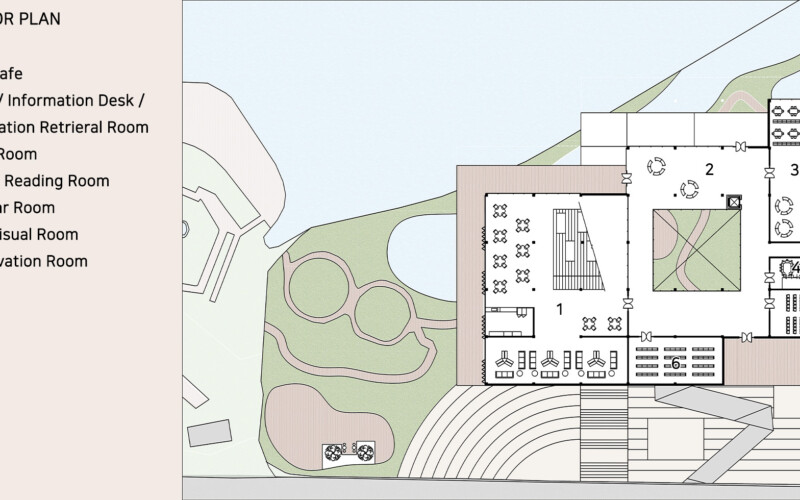 그리고 도서관 내부에 대해서는 자연과 새로운 문화, 문화교류에 대해 포인트를 두었는데 필로티를 활용한 지상공원, 건축 중심에 위치한 중정을 통한 자연조망과 균등한 일조를통해 친화적이고 포근한 분위기를 잘 만들어낸 것 같다