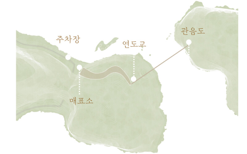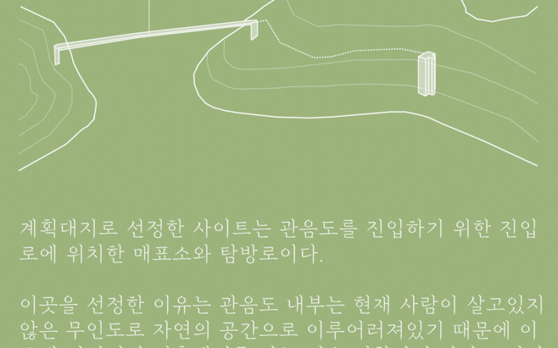 본 시설은 지속 가능한 울릉도의 생태, 연구 활동을 제공하기 위해 설계된 연구 및 탐방시설로 계획 대지로 선정한 사이트는 관음도를 진입하기 위한 진입로에 있는 매표소와 탐방로 입니다. 관음도는 현재 사람이 살지 않는 무인도로 자연의 공간이다 보니 관음도 내부에 인위적인 건축행위가 아닌 관음도 외부, 진입부에 위치한 매표소(7층 규모 – 현재 건축적 행위가 있는)를 계획 대지로 선정하게 되었습니다.