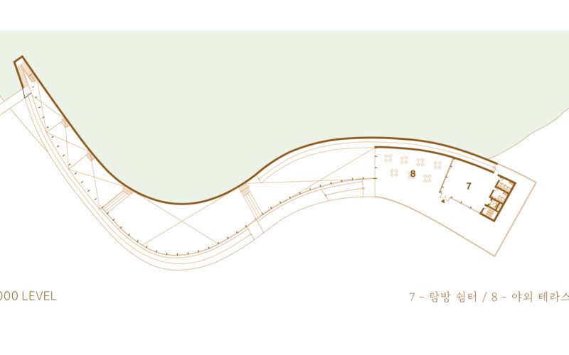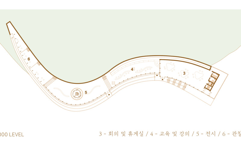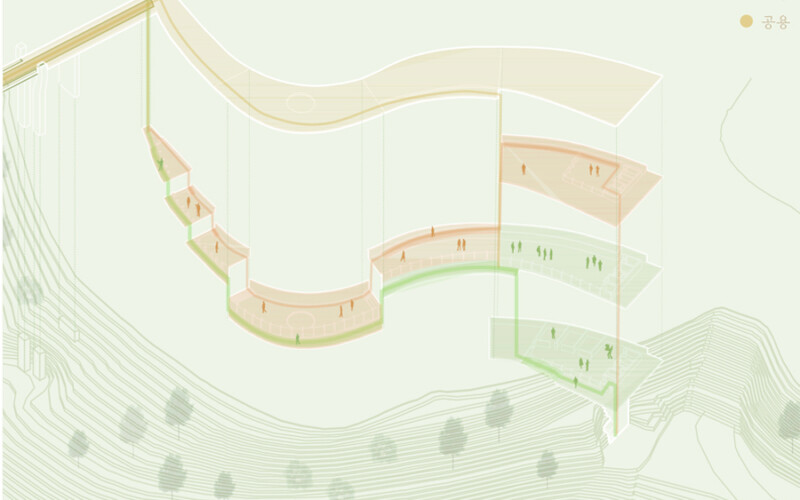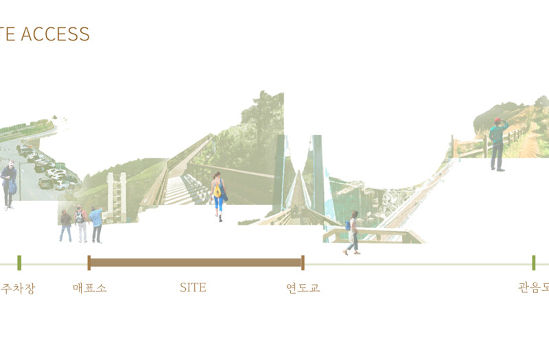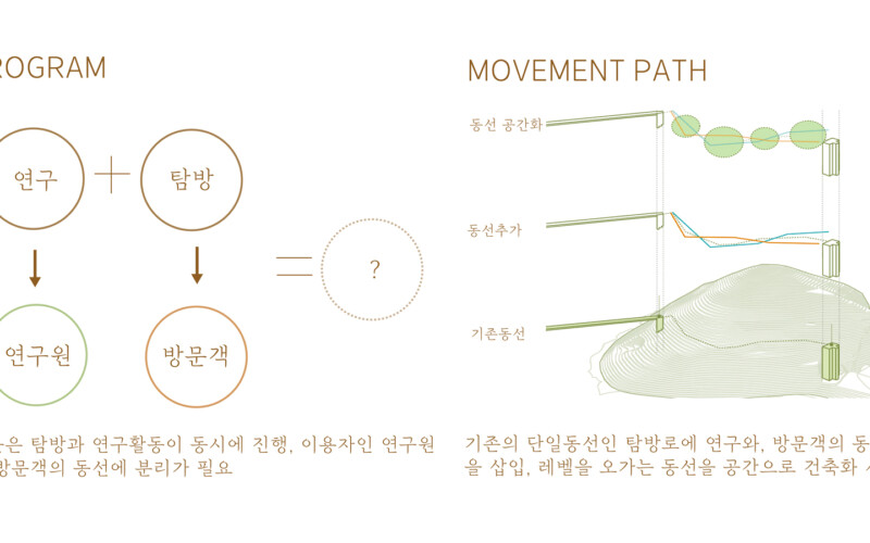 계획 대지는 현재 탐방과 연구 활동이 동시에 진행되고 있어, 이곳을 이용하는 이용자는 방문객과 연구원으로 각 이용자에게 맞는 프로그램과 동선에 대한 분리가 필요하였습니다. 그래서 기존의 단일 동선으로 구성된 탐방로에 연구와 방문객의 동선을 삽입하여 총 3개의 (기존 동선, 방문 자동성, 연구원 동선) 동선을 다양한 레벨로 구성하였습니다.
