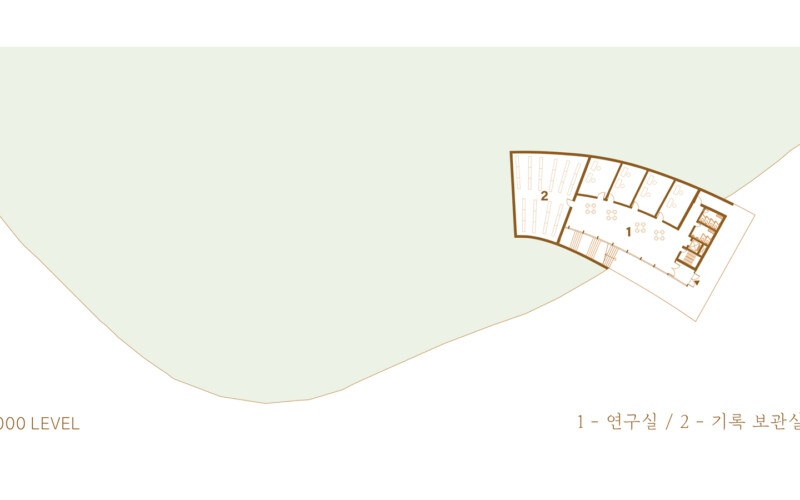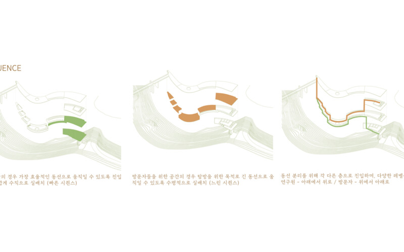 연구원을 위한 연구 동선의 경우 가장 효율적인 동선으로 움직일 수 있도록 진입부와 가깝게 가장 낮은 26레벨에서 진입하여 수직적으로 실들을 배치하였고 (빠른 시퀀스), 방문자를 위한 탐방 동선의 경우 가장 높은 35레벨에서 26레벨을 수평적으로 오가며 긴 동선으로 각 레벨을 탐방할 수 있도록 실들을 배치하였습니다. (느린 시퀀스)