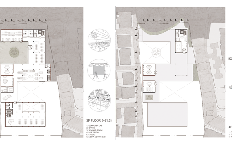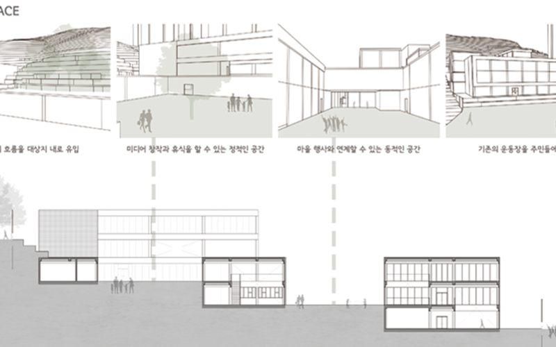 마을 조직과 닮은 형태를 매스로 반영하여 마을과의 관계망을 만들어주었고, 다양한 레벨의 진입로를 열어주어 자유로운 진입을 유도하였다. 기존의 흔적을 살리기 위한 연결부분은 커뮤니케이션이 이루어질 수 있는 공간으로 형성하였고, 근린 공원의 녹지를 기반으로 다양한 성격의 외부 공간을 형성하였다.
