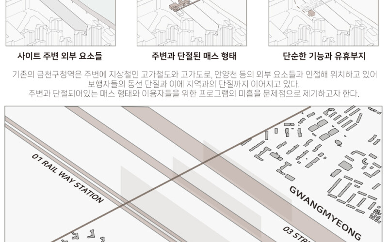 프로젝트 사이트로 선정된 ‘금천구청역’은 서울 1호선에 위치한 지하철 역사 중 유일하게 입구가 하나뿐인 노후된 역사이다. 주변 상권은 지속적으로 발전하여 인간의 다양한 행태를 수용할 수 있는 공간으로 변화하고 있지만, 금천구청역은 준공 당시의 모습에 머물러 있어 이동 목적 외에 이용자 접근이 저조한 상태이다. 또한, 인접한 안양천 수변공간으로 인해 보행자들의 이동을 단절시켜 인근 지역과의 연결이 더욱 악화되고 있어, 점차 이 지역에서의 가치를 잃어가고 있다.
