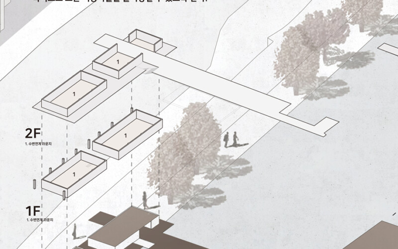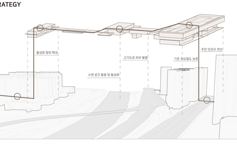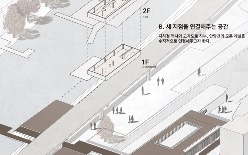 본 프로젝트는 이러한 문제를 해결하고자, 단절된 매스를 안양천까지 영역을 확장하여 이용자들의 다양한 활동을 수용할 수 있는 가변적 공간으로 변모시키고, 인근 요소(고가철도, 고가도로, 안양천)를 활용하여 인간의 기본적 욕구를 충족할 수 있는 공간으로 재탄생시키고자 한다. 또한, 영역 내 스팟을 지정하여 각 스팟의 기능과 공간 활용을 계획하고, 스팟 간의 연결과 이를 통한 이용자 동선 계획을 수립한다.
