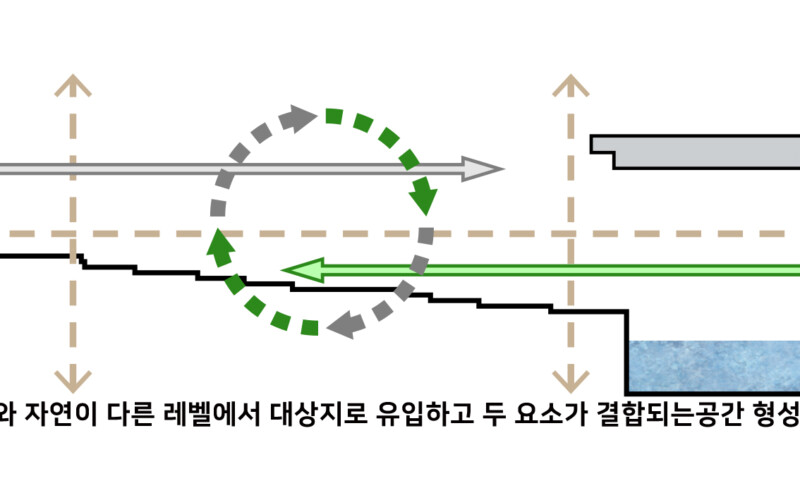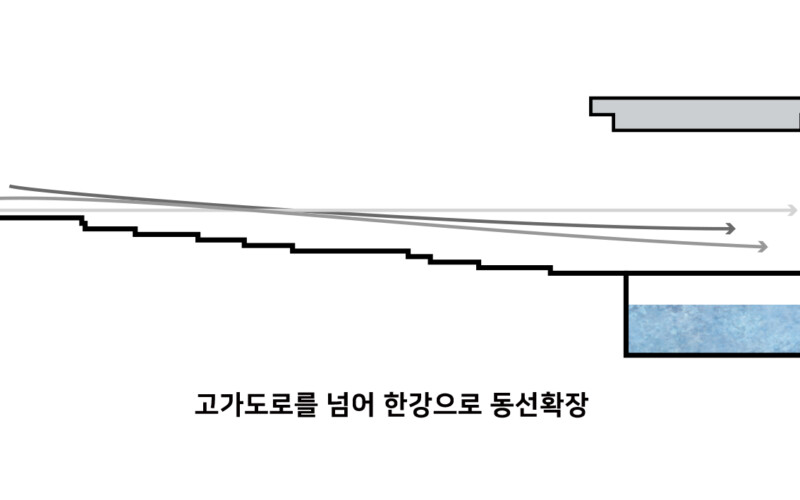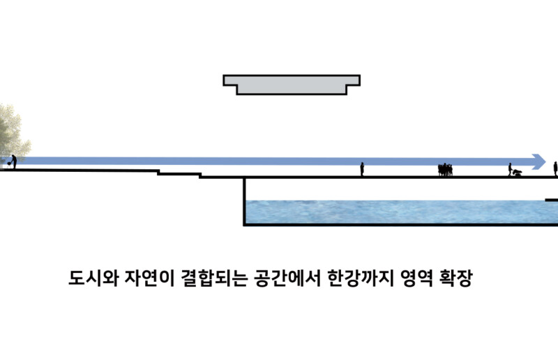 이러한 대지에 기존대지가 가지고 있는 흐름을 강조하면서 한강과의 연계성을 강화한다. 또, 기존에 산책로로 인해 막혀있던 한강과의 연결성을 강화할 수 있는 요소를 계획함으로서 한강이 단순한 큰 강이 아닌