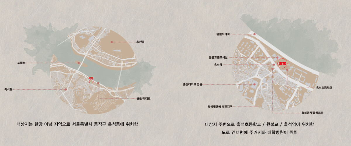 설계 대상지는 한강과 흑석동(도심)을 사이에 두고 자리잡고 있다. 현재는 재활용선별사업장과 노후화된 건축물들이 위치해 있지만 한강과의 연계성도 없고 산책로도 막혀 있어 한강과의 연결성마저 떨어진다.