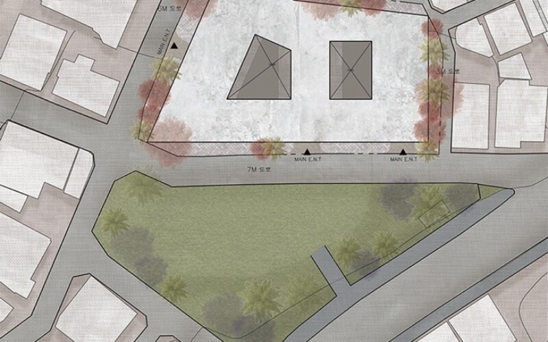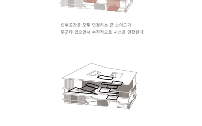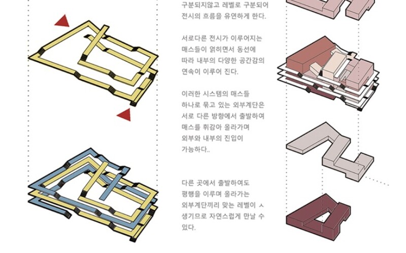서로 다른곳에서 출발하여 돌아 올라가는 두 외부동선이 합쳐지고 사이에 갤러리의 프로그램을 담은매스들이 끼워진다.