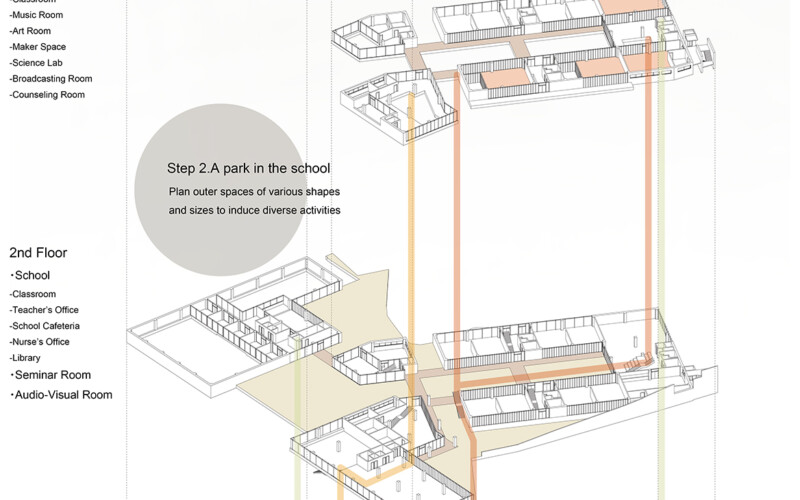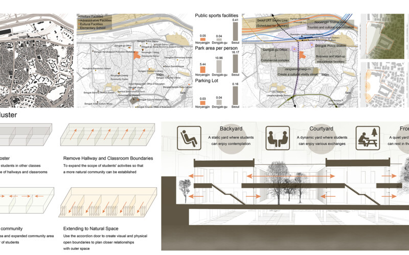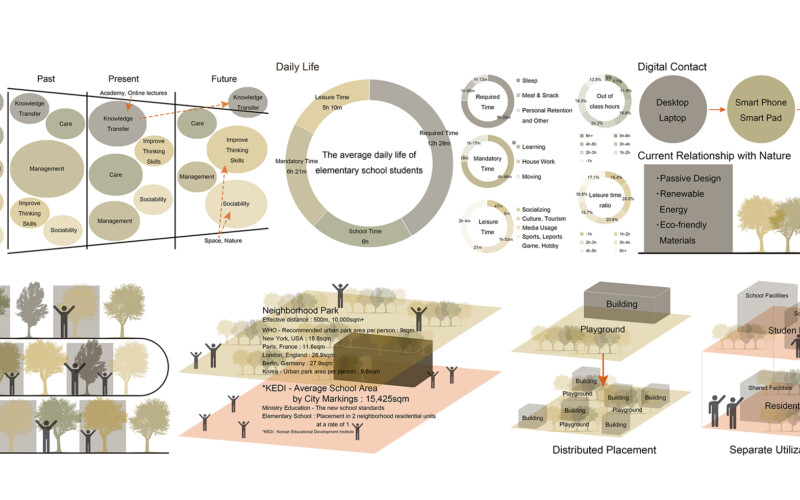 그렇기에 학생 수가 적어져 빈 공간이 많아지는 학교와 여전히 부족한 공원을 결합시킴으로써 지역사회에는 공원과 학교시설 공유를 통한 인프라를 제공하여 삶의 질을 향상시키고 학생들에게는 자연을 되돌려주고 지역적 소속감을 제공하여 주체적인 삶을 살아갈 수 있는 사회 구성원으로서 성장할 수 있도록 제안한다.