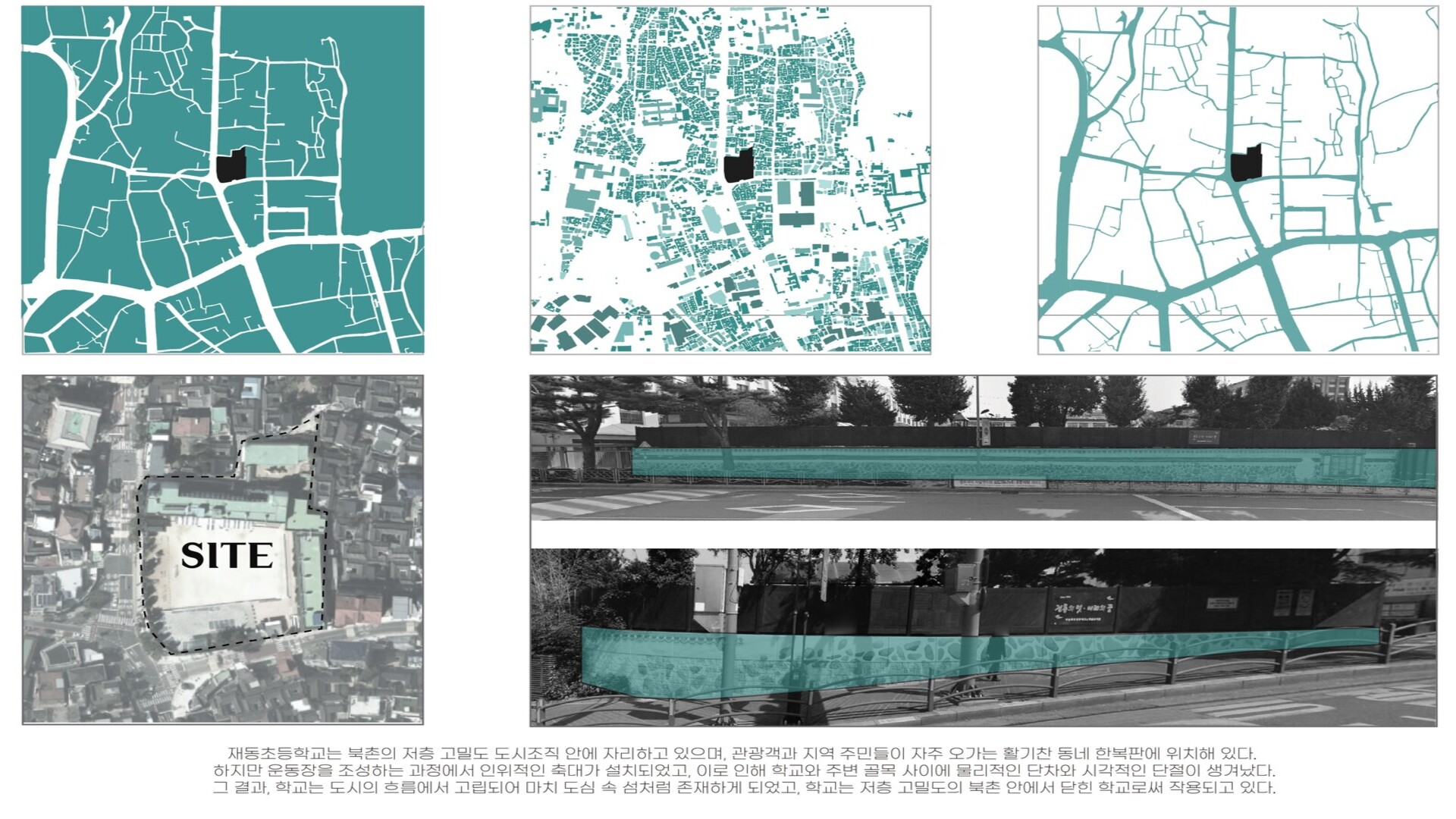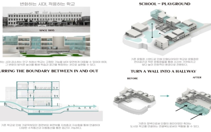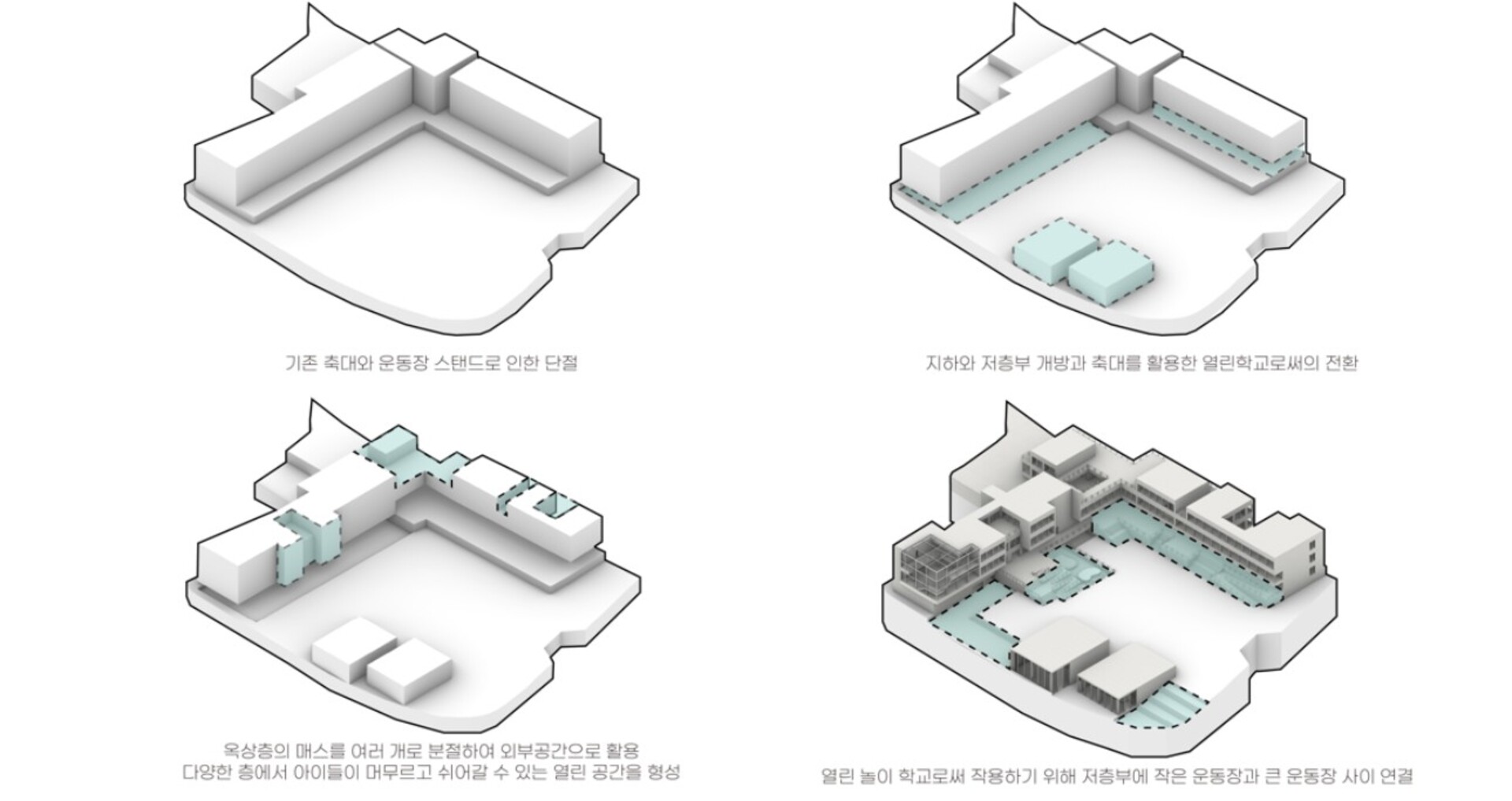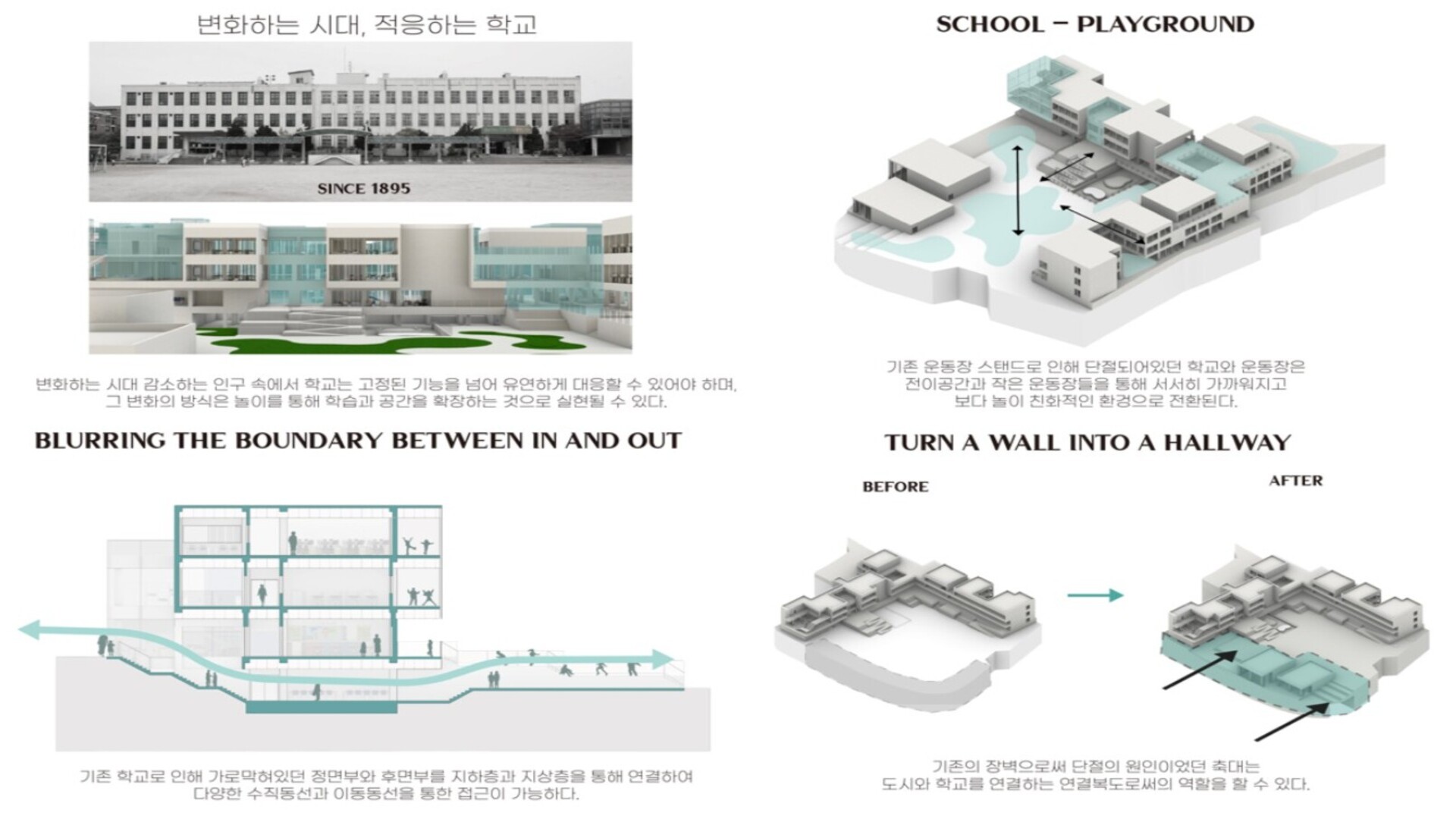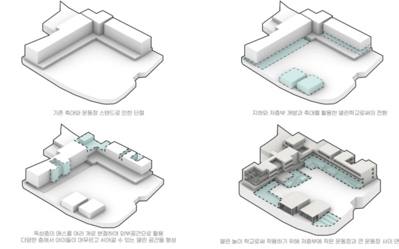 이러한 공간적 재구성은 학교를 단순한 교육 시설이 아닌, 아이들이 삶의 일부로 경험할 수 있는 환경으로 바꾼다. 학습과 놀이가 분리되지 않고 서로 맞물리며 이루어지는 이 과정 속에서, 학교는 더 이상 고립된 기관이 아니라 지역과 연결된 열린 장으로 작동한다. 본 프로젝트는 변화하는 시대에 맞추어 학교가 적응하고 성장할 수 있는 새로운 가능성을 제시한다.