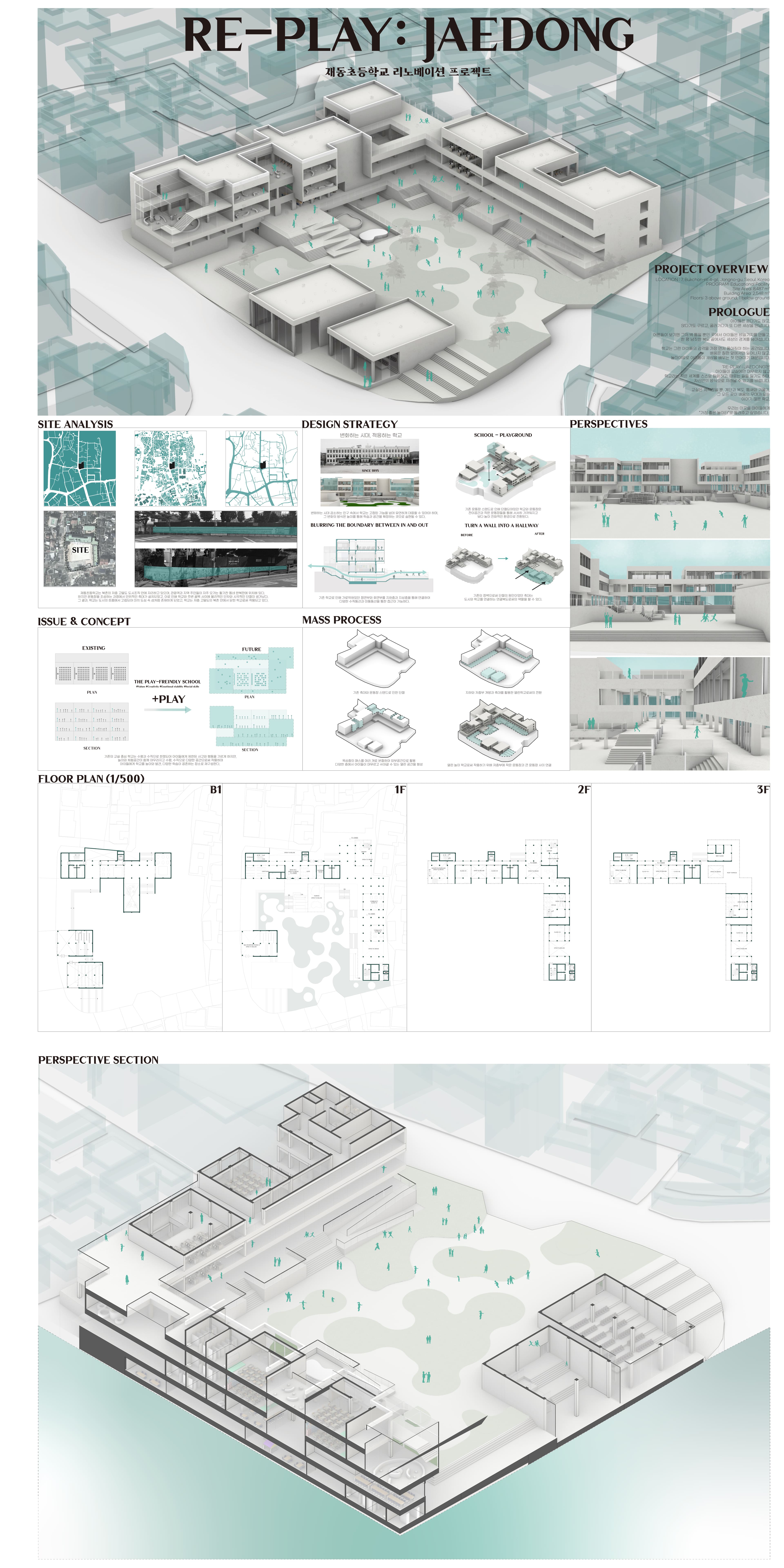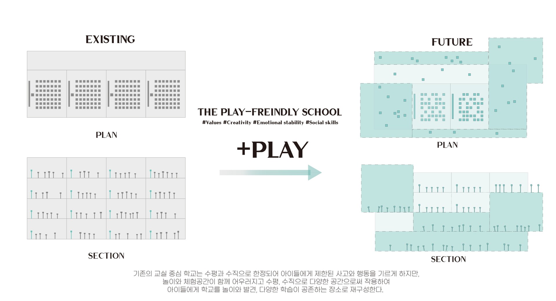 본 프로젝트는 이러한 문제의식에서 출발하여 “놀이를 통한 학습”이라는 주제를 건축적으로 구현하는 것을 목표로 한다. 학교 공간을 재해석함으로써 아이들이 보다 자유롭고 풍부한 경험을 누릴 수 있는 환경을 제안하였다. 우선, 기존에 단절되어 있던 교실과 운동장은 전이 공간을 도입하여 서로 연결되며, 이를 통해 아이들이 배움과 놀이를 자연스럽게 오가도록 유도한다. 지하층은 단순한 보조공간이 아니라 외부와 연결되는 다양한 진입 지점으로 개방되어, 학교와 지역 사이의 경계를 완화하고 열린 소통의 장을 마련한다.