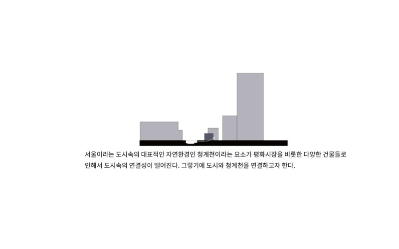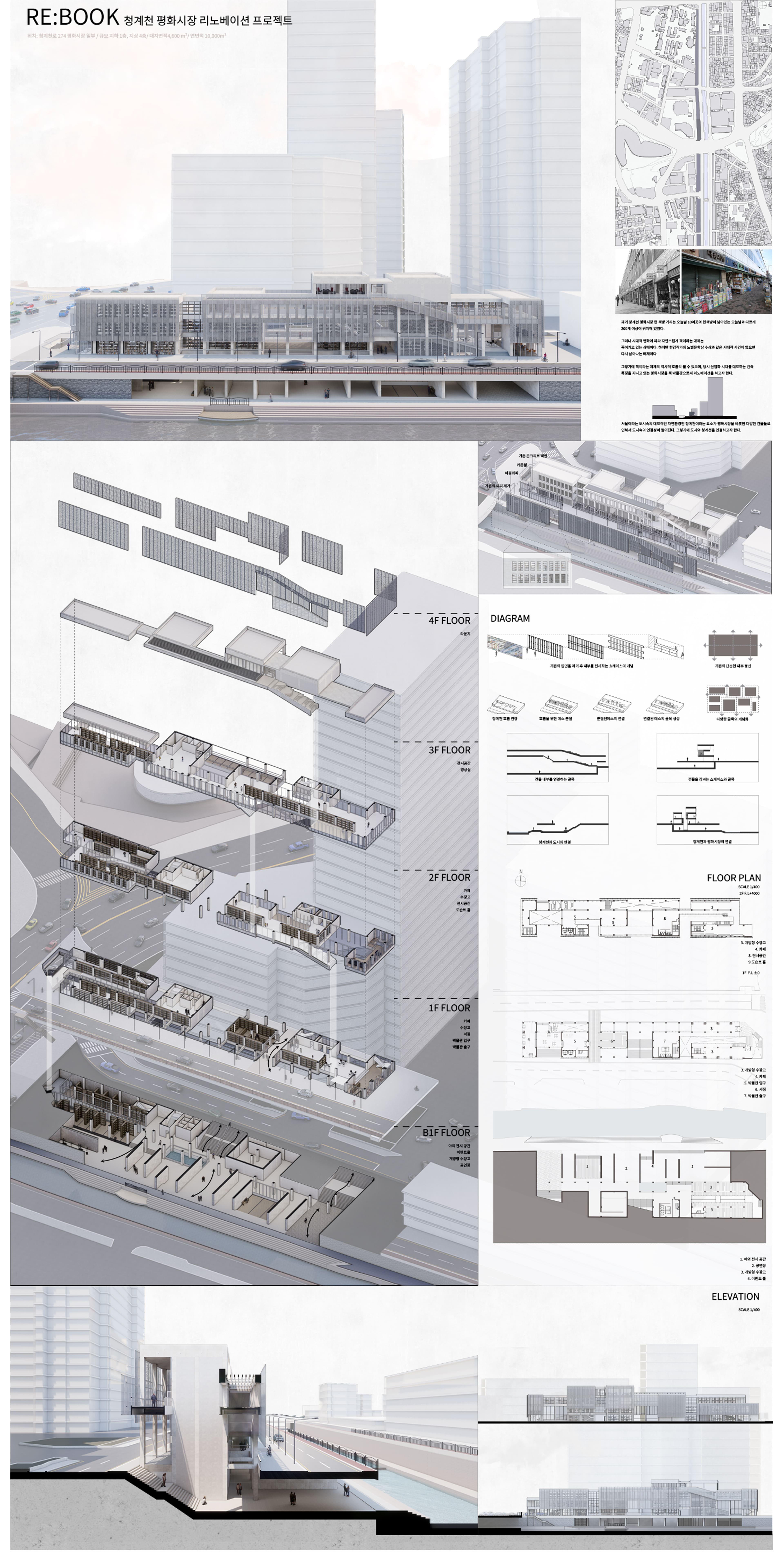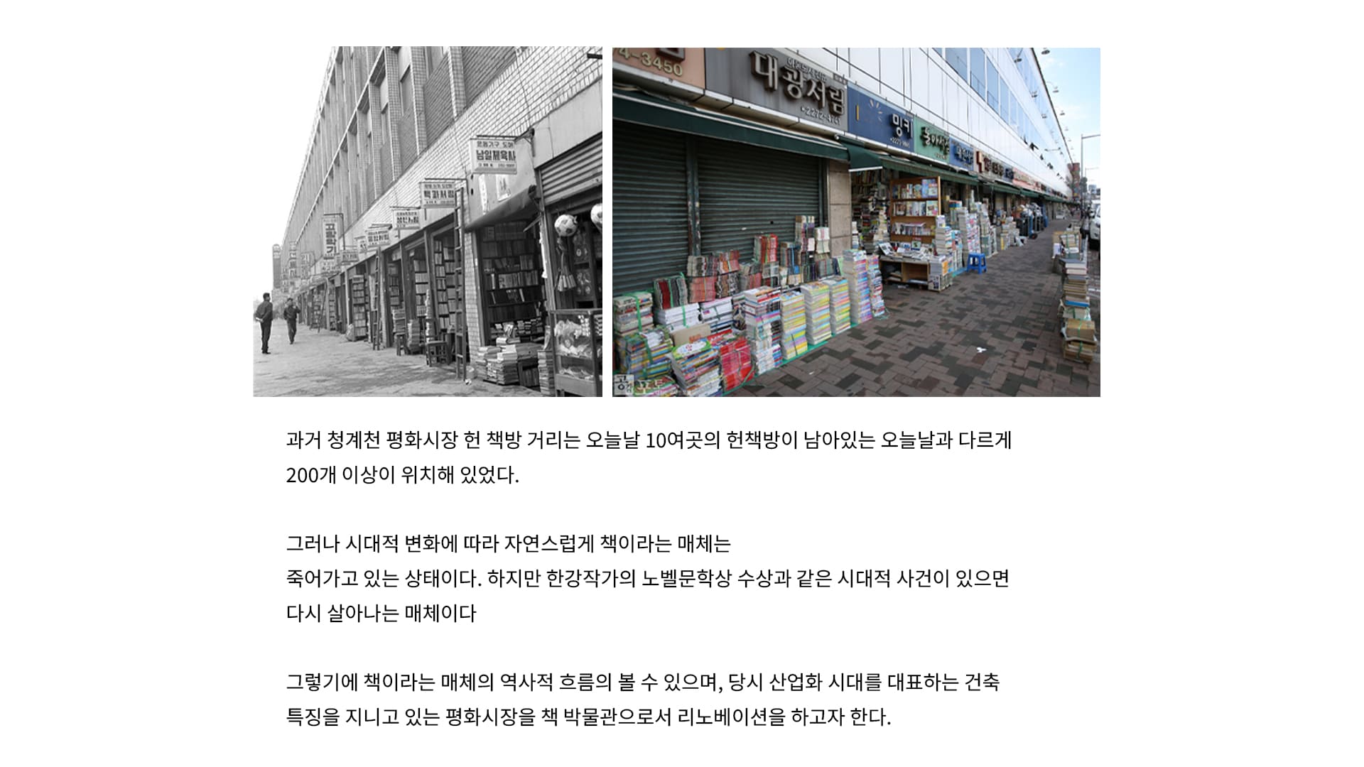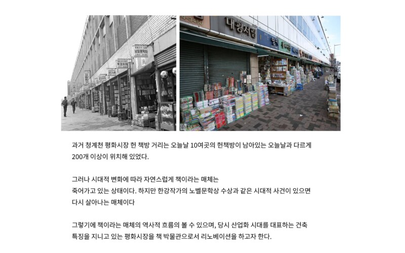 오늘날 시대적 변화 속에서 새로운 방식으로 장소를 되살려내는 것을 요구 하고자 한다. 청계천 헌책방 거리는 과거수많은 학생들과 시민들이 책을 찾고 발견하는 문화의 거리였다. 그러나 오늘날 책이라는 매체는 시대적 발전으로 인해 디지털 플랫폼 E-Book, 유튜브, OTT등 새로운 미디어에 의해 점점 쇠퇴하는 상황이다. 그러나 여전히 책이라는 매체는 시대적 사건, 사회적 변화에 따라 새롭게 조명될 가능성을 지니고 있다. 한강작가의 노벨문학상 수상과 같은 사건 직후 헌책방 거리를 비롯한 다양한 서점, 책방등에 한강 작가의 책을 찾는 사람들이 늘어 난 것 처럼 말이다. 이렇게 책은 시대적 맥락에 따라 재해석되고 소비될 수 있는 잠재력을 지니고 있다. 그렇기에 헌책방거리가 위치해 있는 평화시장의 일부를 증·개축 하여, 과거 헌책방의 기억하면서, 오늘날 다양한 문화적 이벤트가 발생할 수 있는 공간으로 변화 시키고자 한다. 단순히 책을 읽고 사는 공간에서 전시·관람·체험등 시민들이 쉽게 참여 할 수 있는 공간으로 건물 자체가 하나의 전시공간이 되도록 하고자 한다.