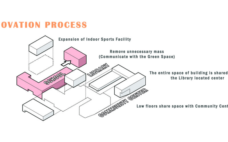 용화중학교 일대는 주거지역이 대부분을 차지하고 있지만, 주민들이 이용할 수 있는 문화시설이 매우 부족한 상태이다. 위 두 가지 문제를 해결하기 위한 방안으로 학교의 일부 시설과 공간을 주민 커뮤니티와 공유하는 방안을 제안한다. 학생들에게는 부족했던 외부 커뮤니티와의 연계를 통해 더욱 다양한 활동을 지원하도록 하고, 주민들에게는 교내의 시설과 외부공간을 공유하여 부족했던 문화시설을 제공한다.