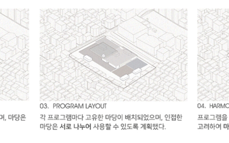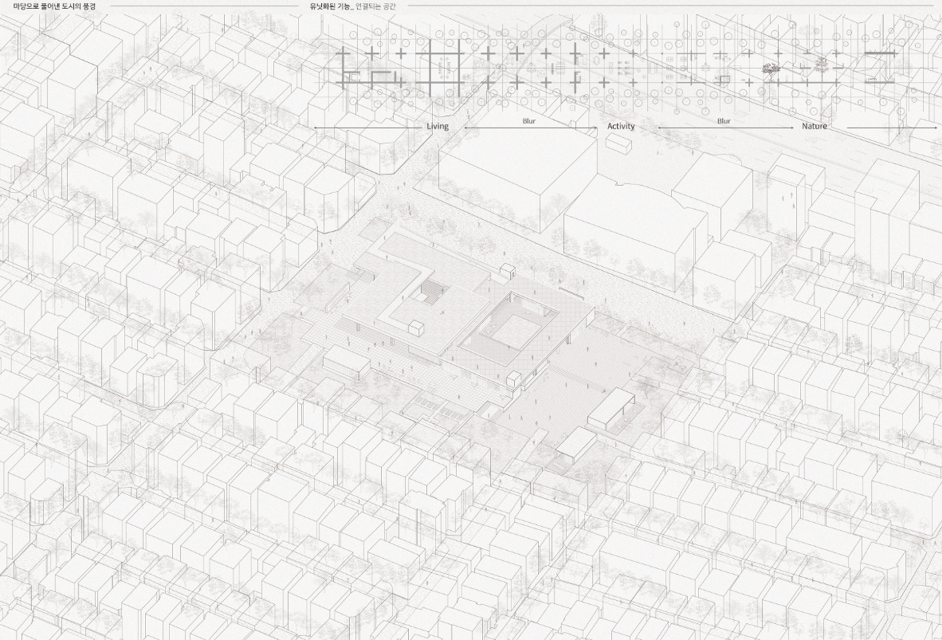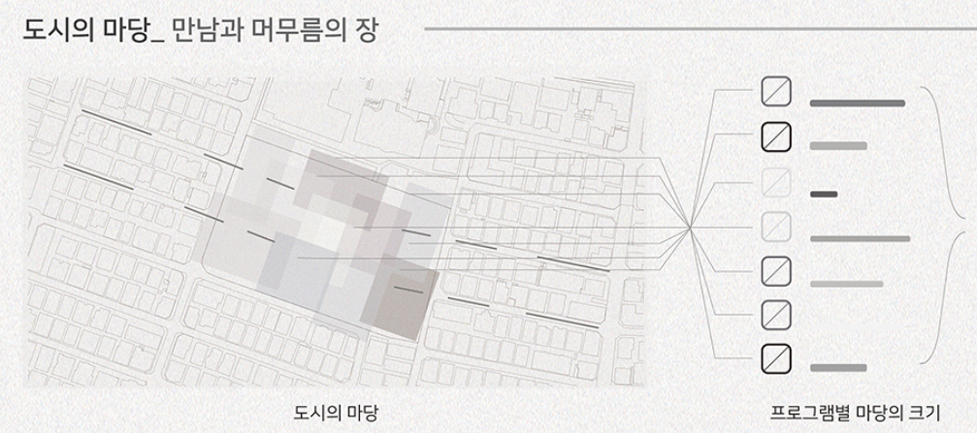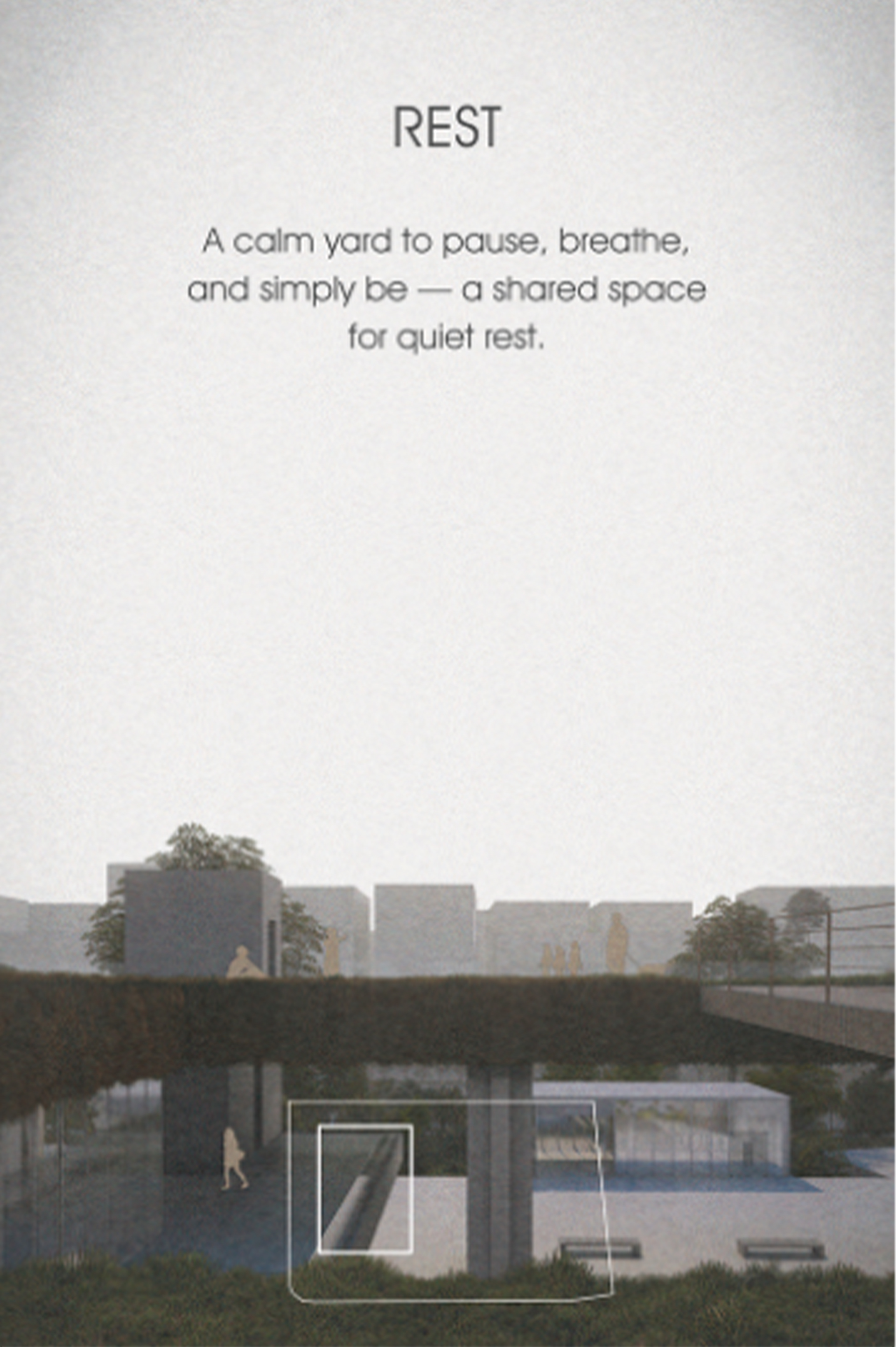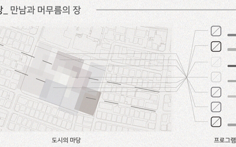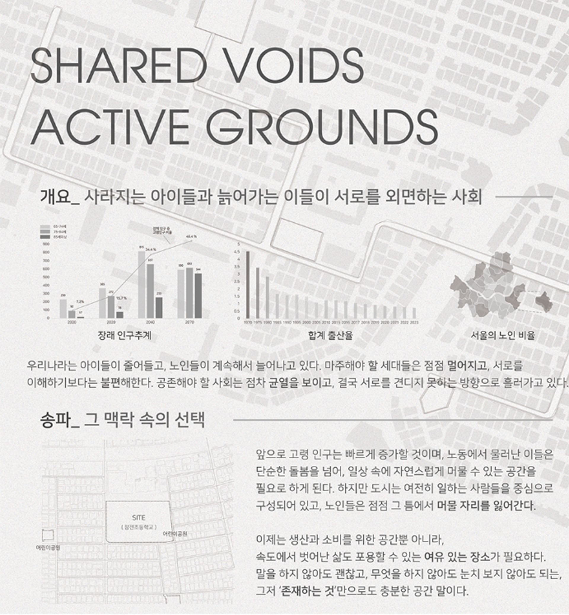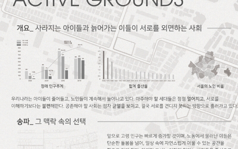 고령 인구는 증가하지만 도시는 여전히 일하는 사람 중심으로 구성되어 노인들의 자리가 줄어든다. 이제는 생산과 소비를 넘어, 무엇을 하지 않아도 머물 수 이쓴ㄴ 여유있는 장소가 필요하다. 이에 도시의 마당을 제안한다. 소란스러운 활동엔 넓고 열린 마당, 조용한 휴식엔 작고 아늑한 마당을 두어 다양한 만남을 만든다. 이 마당들은 흐름 속에 흩어져 일상속 느슨한 연결을 이끈다.