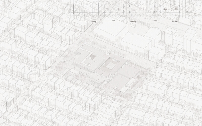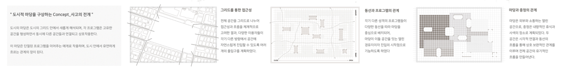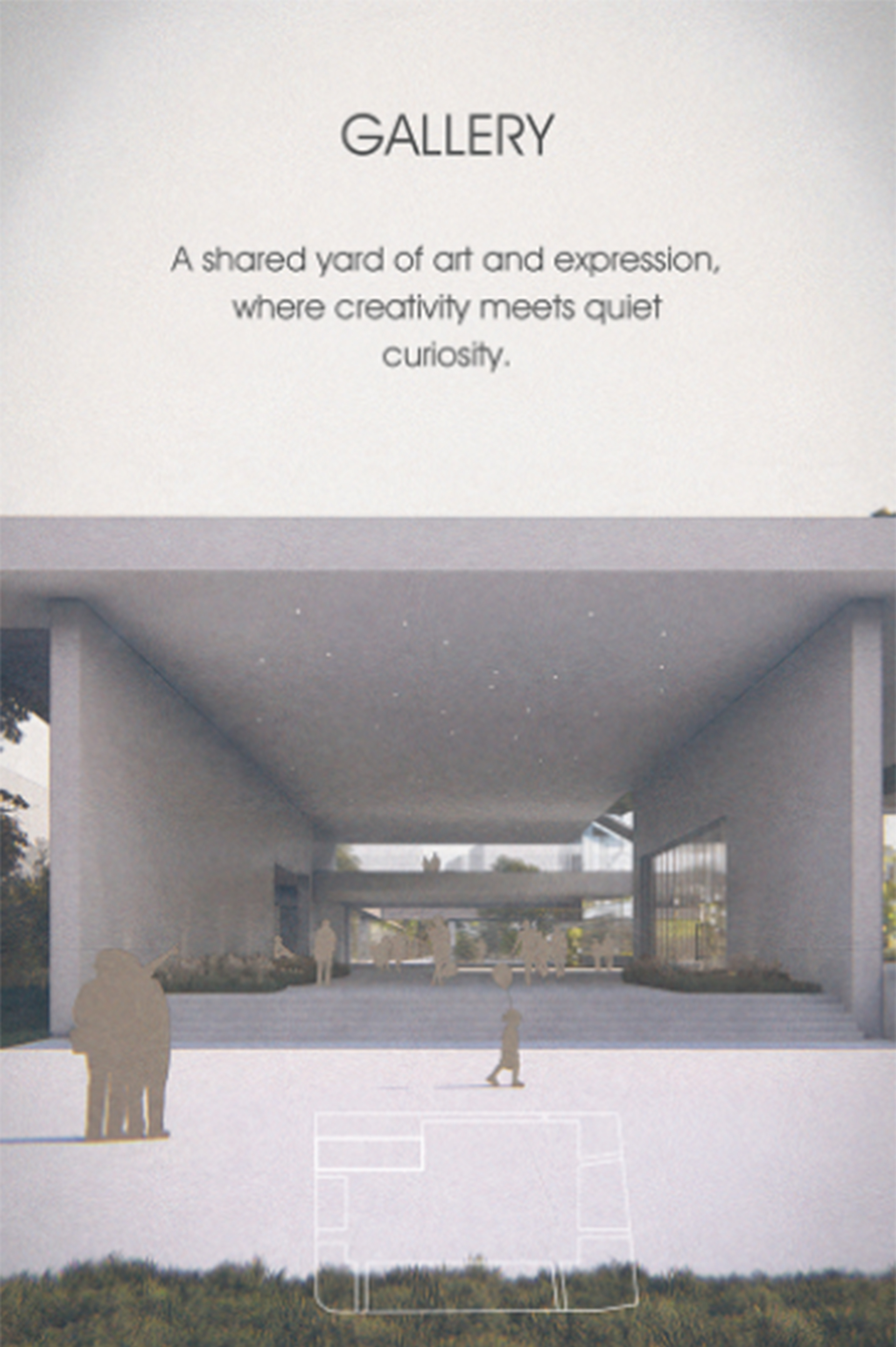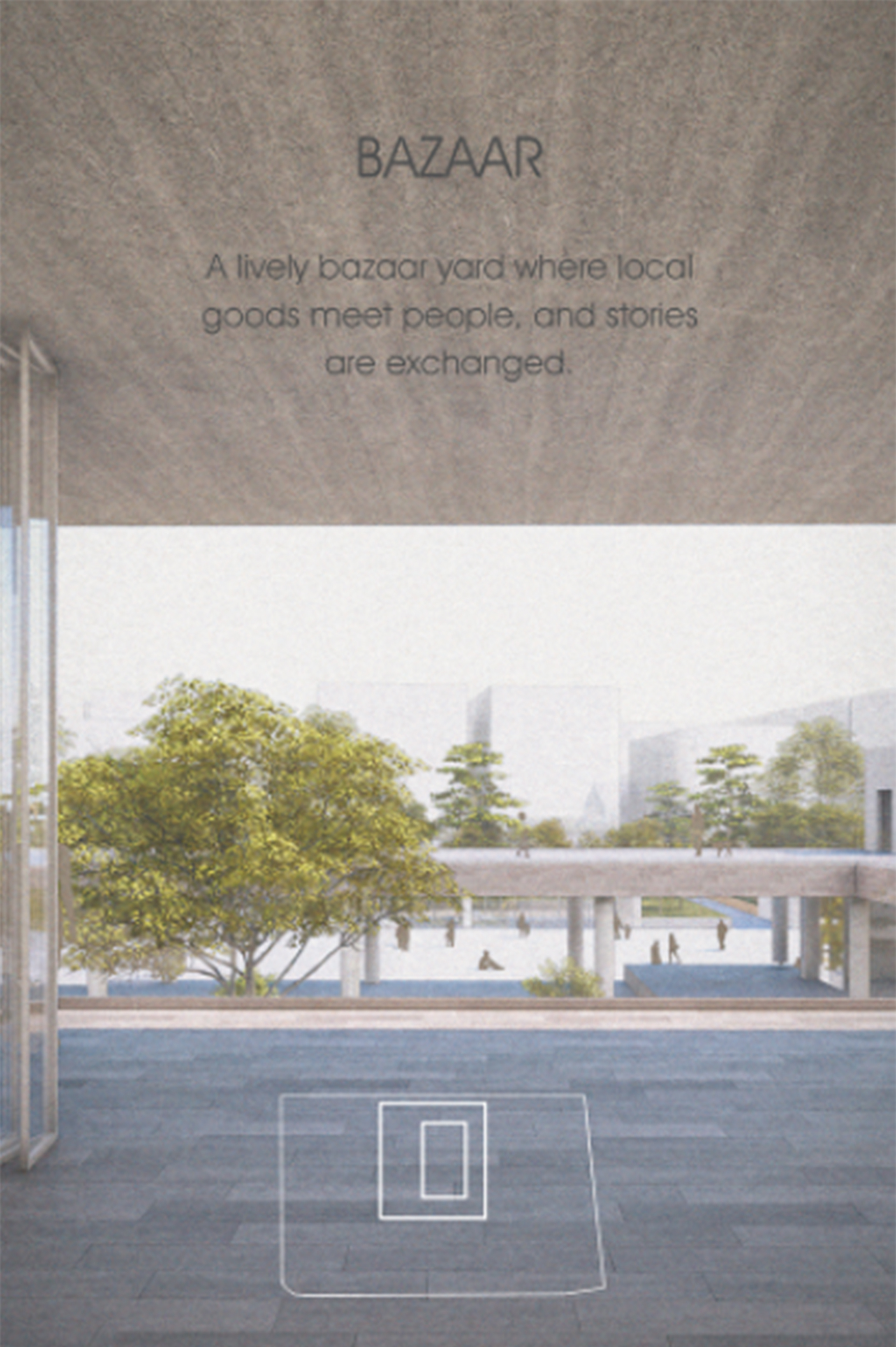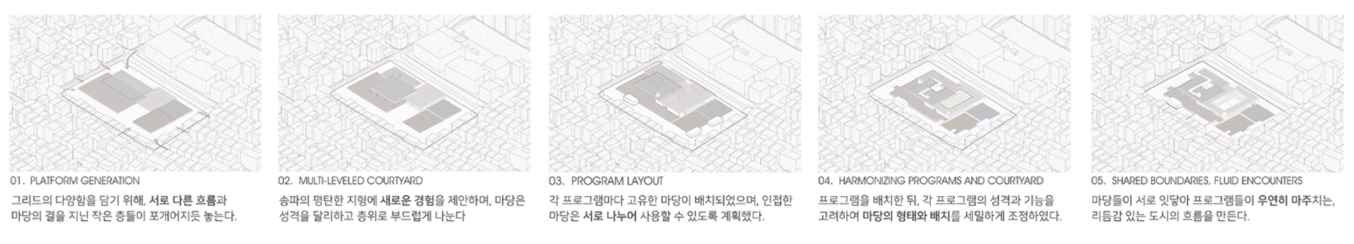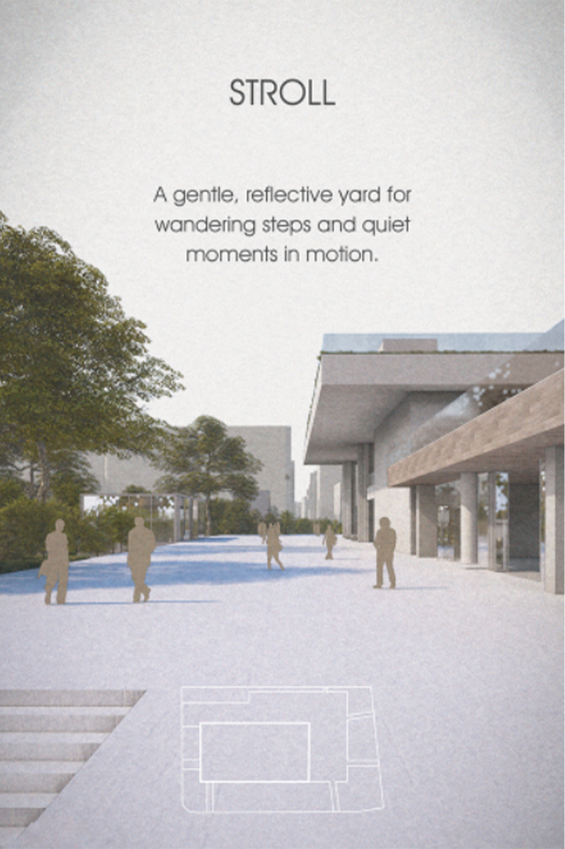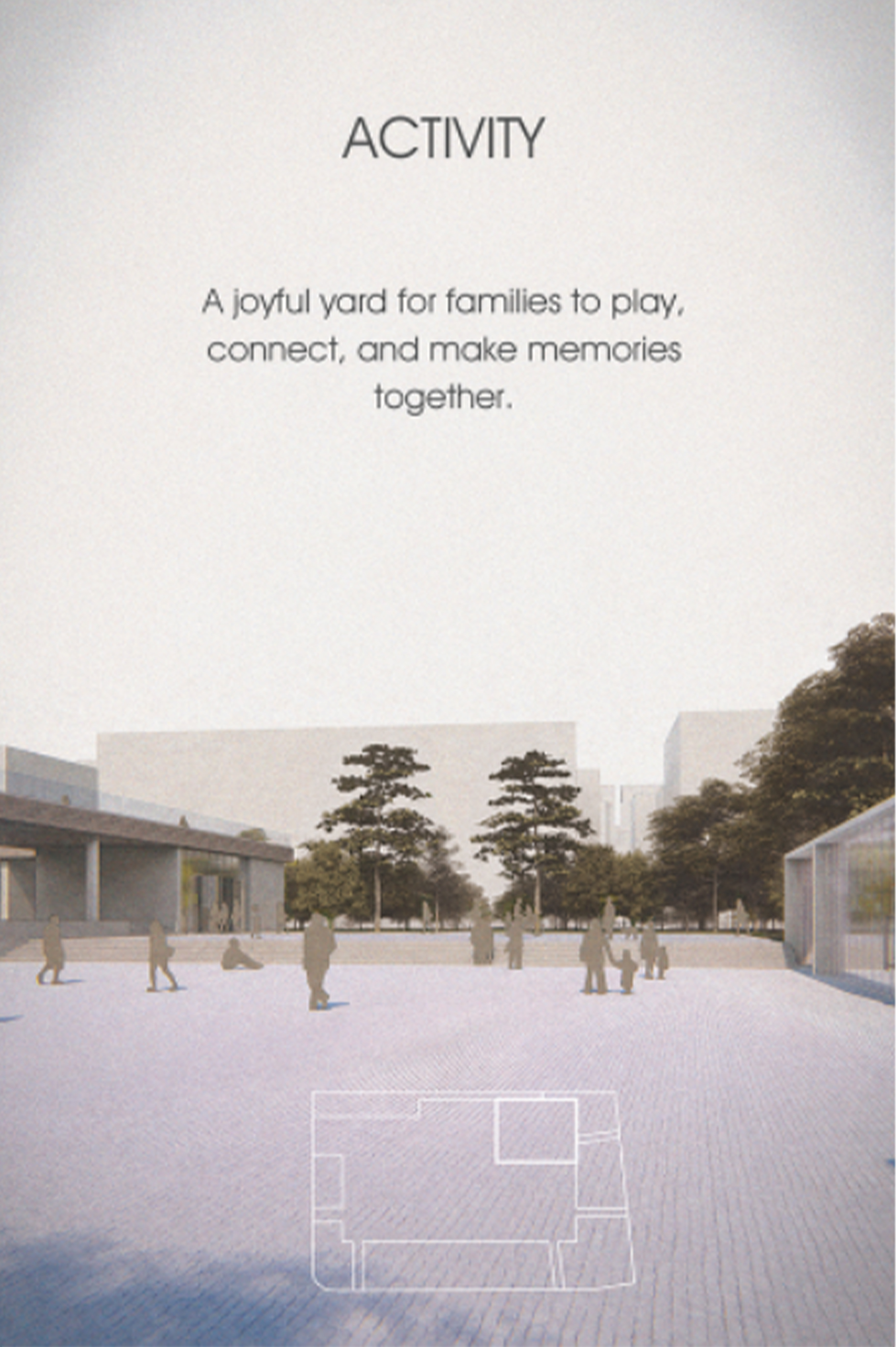 고령 인구는 증가하지만 도시는 여전히 일하는 사람 중심으로 구성되어 노인들의 자리가 줄어든다. 이제는 생산과 소비를 넘어, 무엇을 하지 않아도 머물 수 이쓴ㄴ 여유있는 장소가 필요하다. 이에 도시의 마당을 제안한다. 소란스러운 활동엔 넓고 열린 마당, 조용한 휴식엔 작고 아늑한 마당을 두어 다양한 만남을 만든다. 이 마당들은 흐름 속에 흩어져 일상속 느슨한 연결을 이끈다.