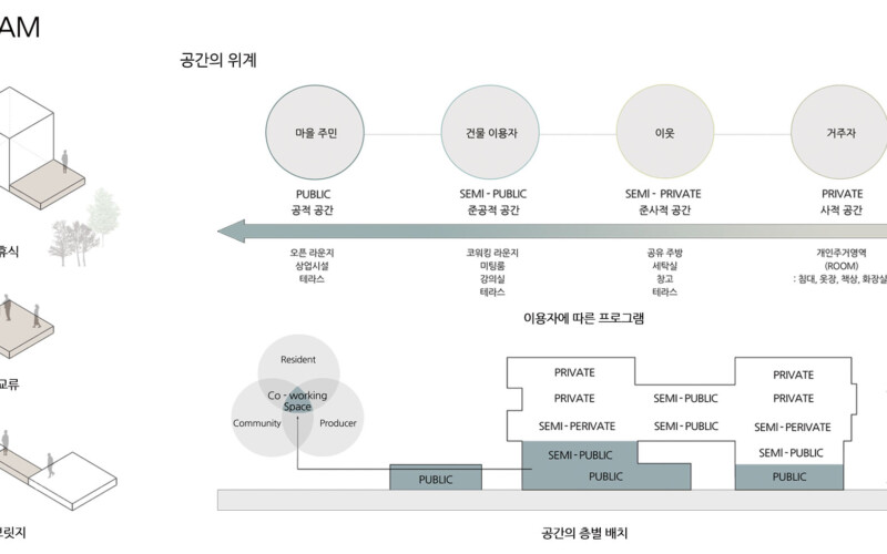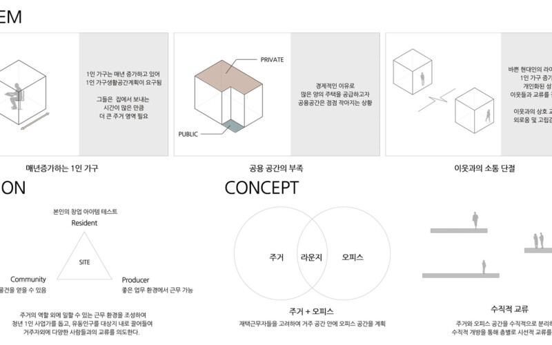 이를 반영하고자 늘어나는 1인 가구 재택근무자들을 위한 공유 주거 ‘테라피스’를 제안한다. 테라피스는 테라스와 오피스가 결합된 개념으로 주거 공간과 함께 있는 개인의 야외 공간과 주거와 분리된 업무 공간을 나타낸다. 코워킹 라운지에서 개인 업무와 더불어 이웃과 아이디어에 대해 의견을 협력하여 하나의 업무를 형성하는 가능성을 보여준다. 또한 다양한 사업 아이템을 지역 주민들에게 선보이면서 그들과 소통하며 다양한 가치를 만들어 낼 것이다.