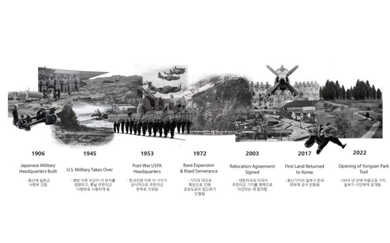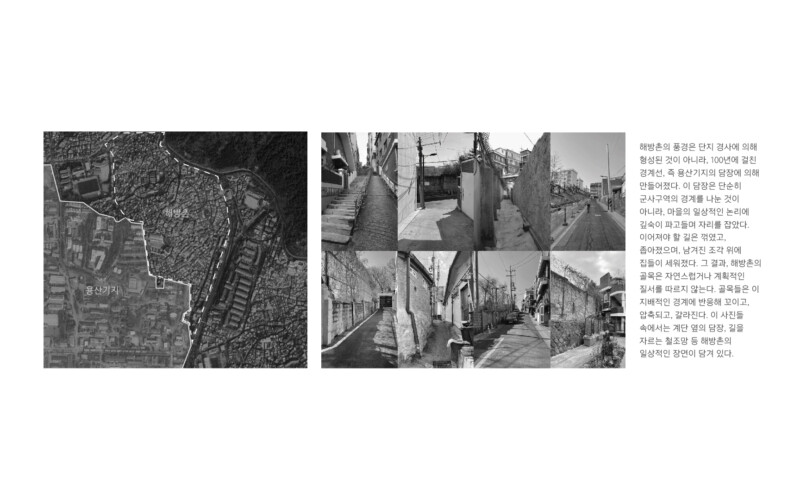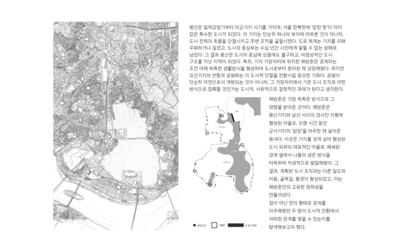 용산이라는 땅은 지난 120년간 군사기지로 사용되며 주변과 철저히 단절되어 왔다. 담과 도로로 둘러싸인 이 거대한 영역은 오랫동안 ‘금단의 땅’으로 존재했다. 그 결과 남산과 용산기지 사이에 끼어 있던 해방촌은 어디로도 확장되지 못한 채 높은 밀도로 형성되었고, 주민들이 함께 모일 수 있는 공공장소는 항상 부족했다. 특히 해방촌과 맞닿는 일부 구역은 군사적 목적에 따라 내부의 경사 지형이 계단식으로 조성되면서 뚜렷한 레벨 차이가 생겼고, 높은 담으로 둘러싸여 더욱 고립되었다.