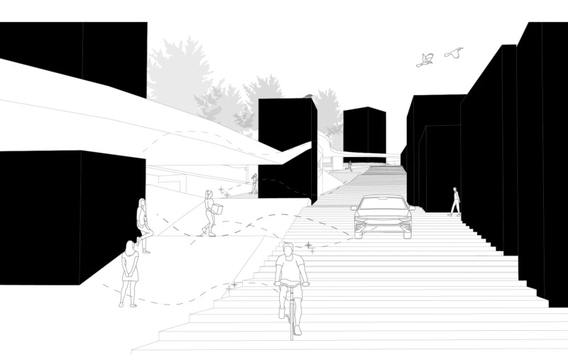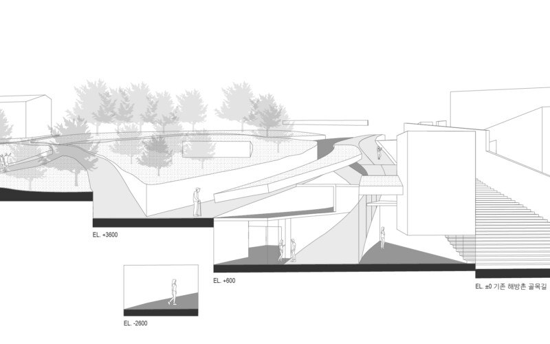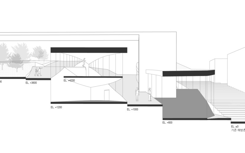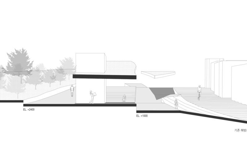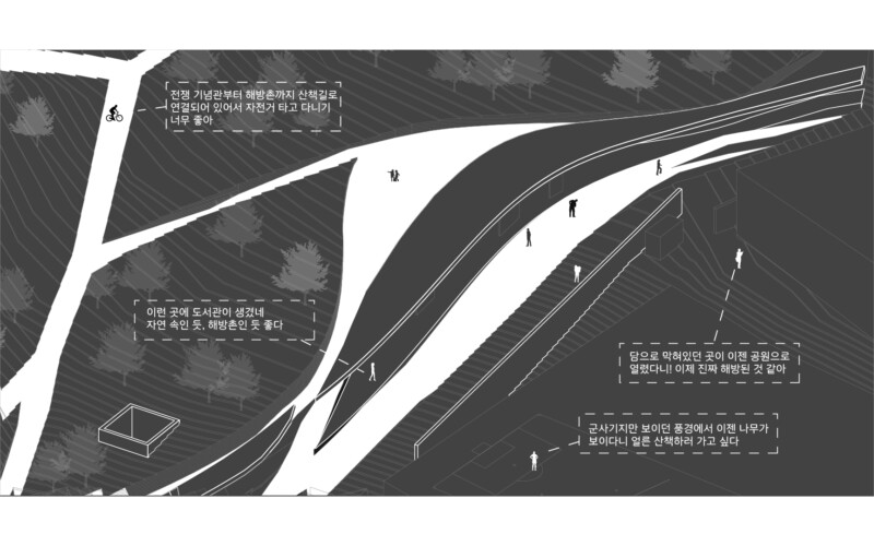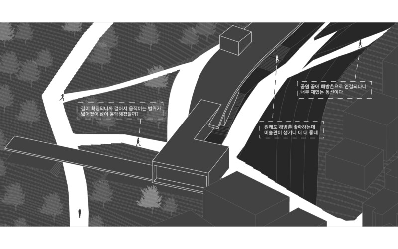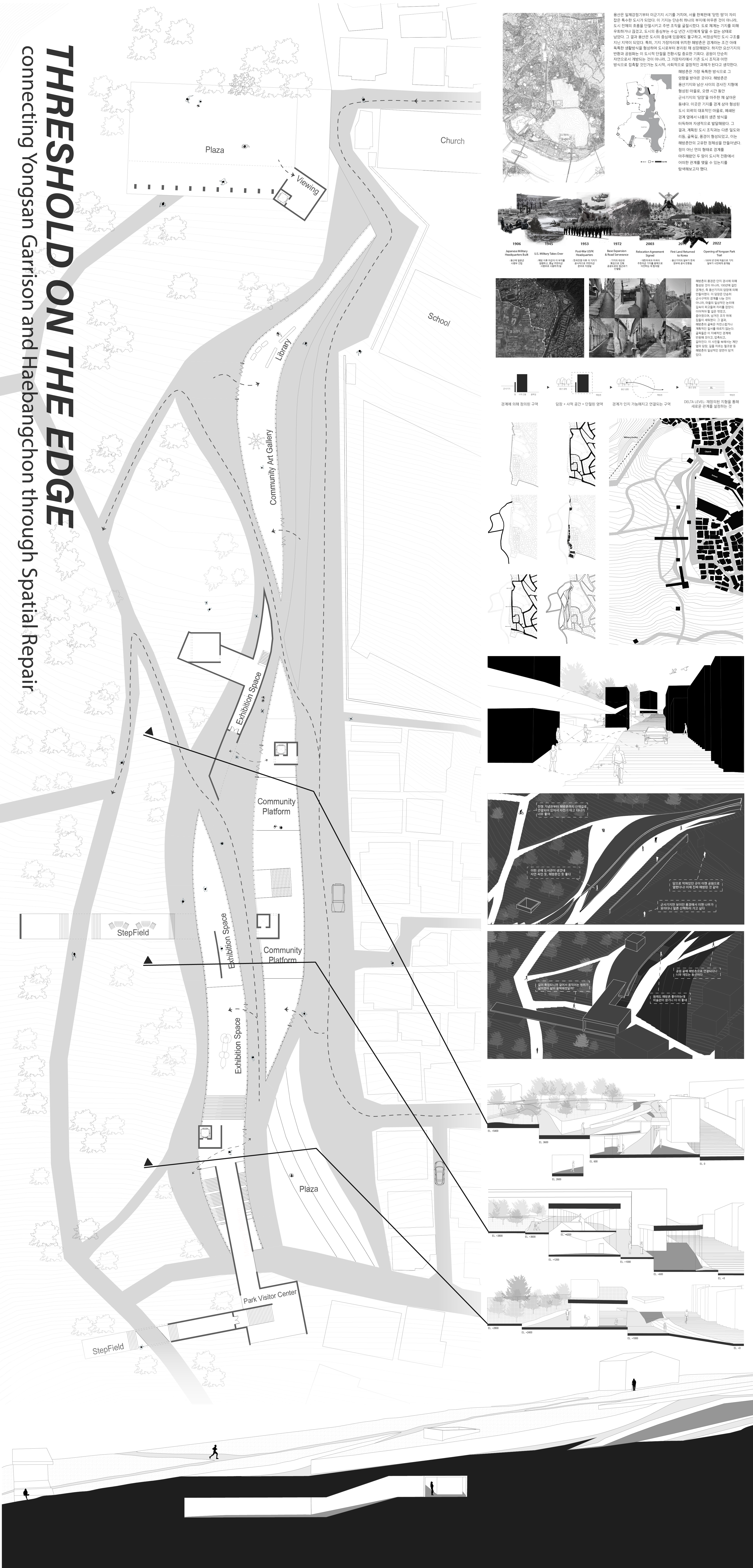 현재 용산기지는 공원화가 추진되고 있다. 그러나 오랜 단절과 레벨 차이는 단순한 물리적 연결만으로는 해소되지 않는다. 이 차이를 극복하기 위해 하나의 단일한 레벨로 맞추는 대신, 다양한 레벨을 풀어내는 방식을 제안한다. 즉, 기지와 주변 지역 사이에 중간 스케일의 완충지대를 마련하고, 계단식 지형에서 발생한 단차를 단계적으로 해소하는 것이다. 이를 통해 두 땅은 스케일과 레벨의 차이를 완화하며, 단절을 넘어선 새로운 관계를 회복할 수 있다. 기존의 ‘선’적인 골목길은 입체적이고 ‘면’적인 공간으로 확장되어, 사람들이 머물며 소통할 수 있는 공공적 장치가 될 수 있다.